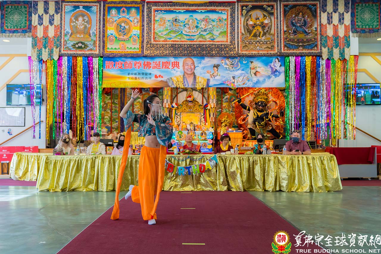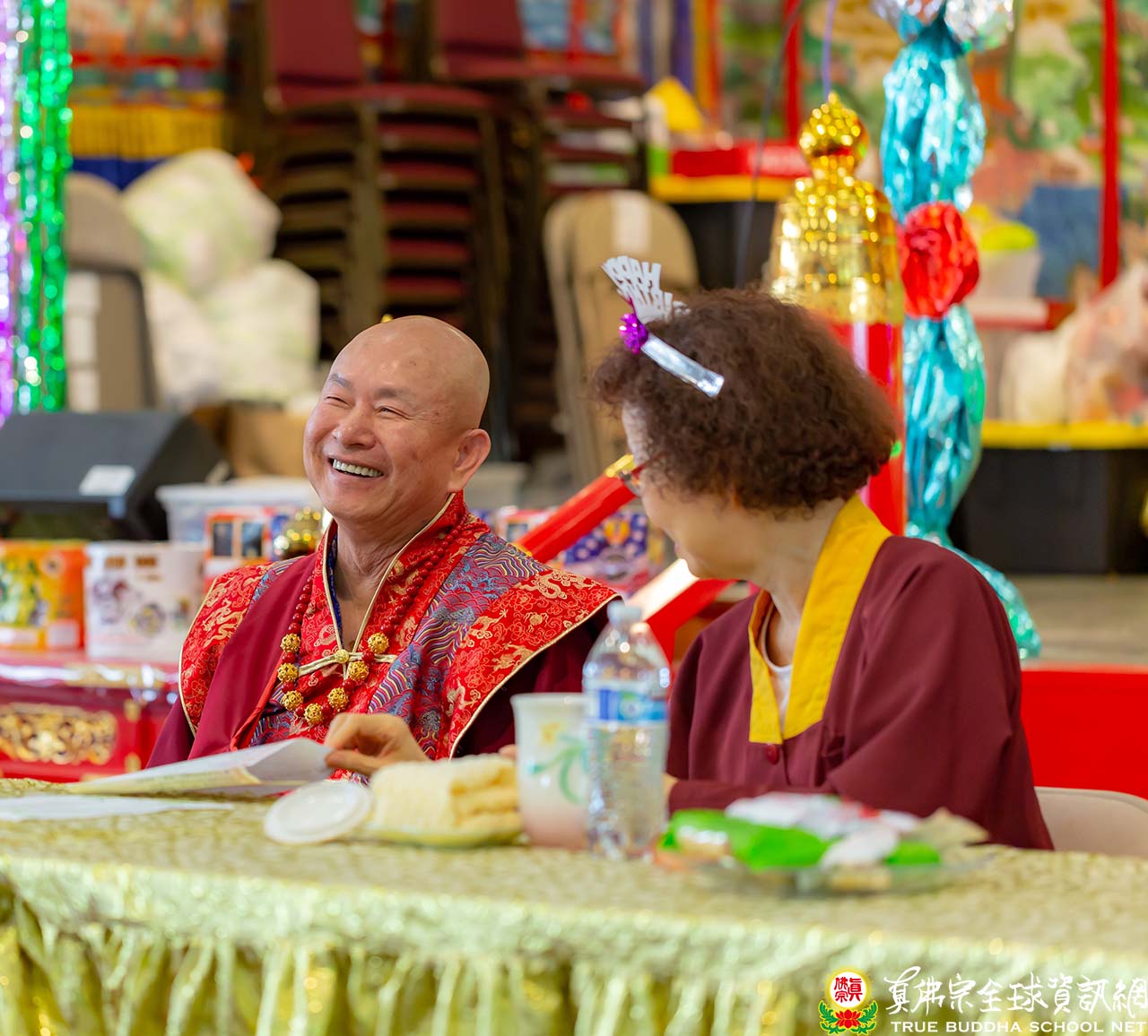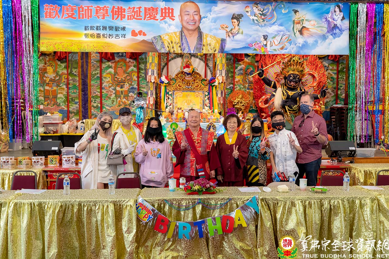 師尊師母甫踏進大殿,就感受到生日派對的鮮豔色彩所帶來的視覺衝擊,接著師尊就被工作人員圍著獻花獻供,平時單調的餐桌,也鋪上派對桌布。師尊見到大家虔誠的心意,感觸的提起自己年幼時,因聽從學校老師指示回家提醒父母今天過生日,結果得到的回應是「今天暫且不打你」。師母在一旁說她們家小時候也是每天打,眾人聽了,不勝唏噓,也對早期普遍的打罵式教育,以表達愛之深,責之切的做法,感到震撼。有許多同門,無論是陽曆或農曆生日,以及美國或台灣的父親節,都會記得幫師尊慶祝;弟子們對師尊感恩的回饋,似乎總覺得做得不夠,而師尊則教導大家以平常心,踏實精進的過每一天,更別有意義。