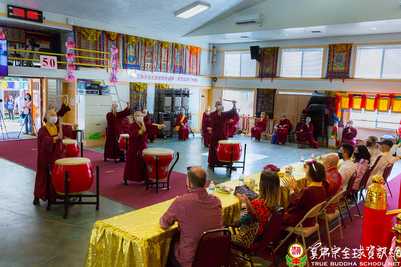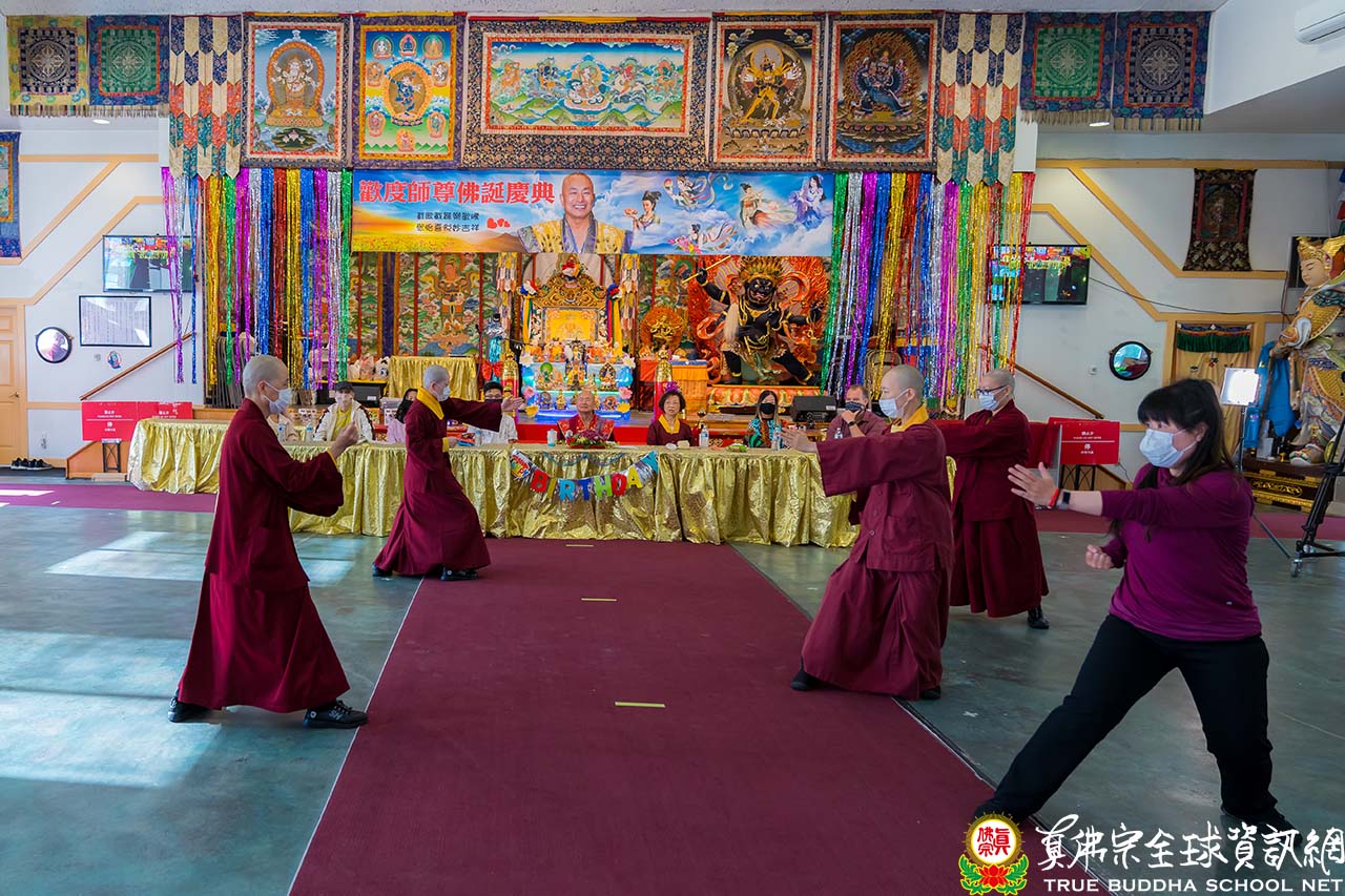 彩虹雷藏寺今日豔陽高照,大殿裡外張燈結綵的派對布置,讓寺區瀰漫著歡樂慶典的氣氛。雖然距離根本上師法王蓮生活佛盧師尊的佛誕日,農曆5月18日,還有三天,但感念師佛恩德的眾弟子們,早已按捺不住辦喜事的心情,將於今天長壽佛護摩法會後,舉辦一個疫期間別開生面的「雲端zoom送賀禮」慶祝活動。