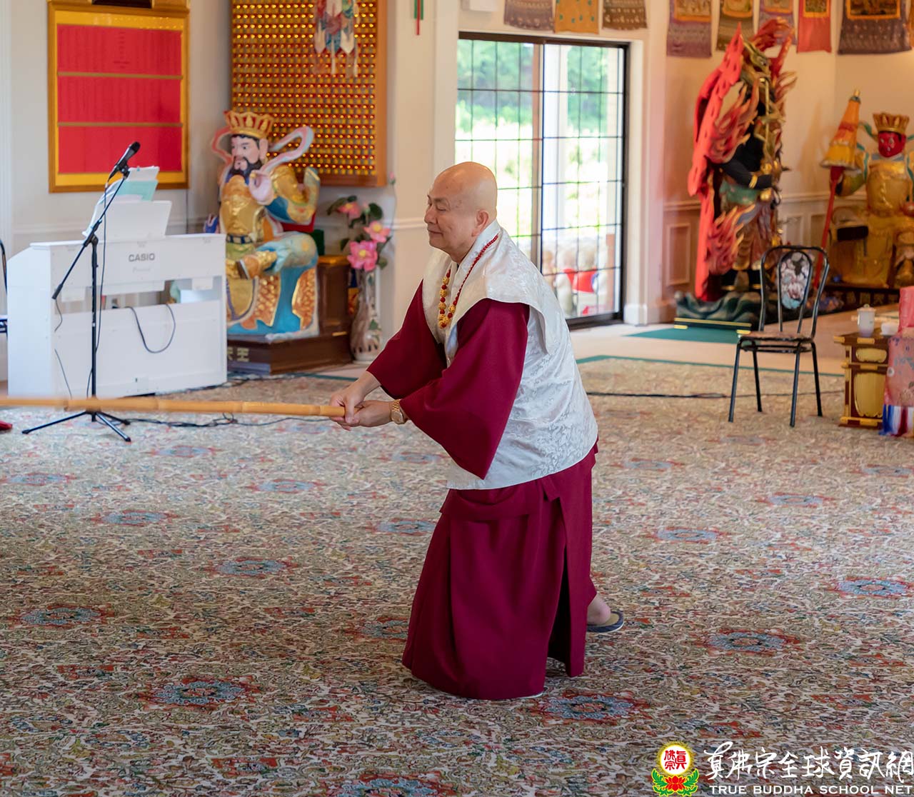 快接近午餐時分,遠見師尊、師母的坐車抵達山莊,數位出家僧眾到大門口迎接師尊、師母的到來。進到大殿之後,師尊帶領大家一起禮佛,師尊氣宇軒昂,動作標準的做著大禮拜,其體能之好,在場無人能夠比擬。