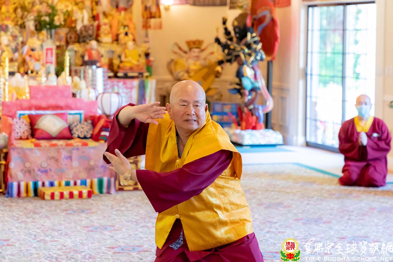 師尊與師母在午餐其間,聽取現在疫情的狀況,也關心全球的時事。於下午三點整,師尊與師母一同來到護摩寶殿,正面迎來的大電視上全都是在線上熱情與師尊、師母問候的同門。今天是除瘟疫度母的護摩法會,祈願在師尊的大加持力以及在除瘟疫度母的護佑下,護摩火的烈焰能滅除瘟疫之災,讓眾生生命不再受到威脅。
