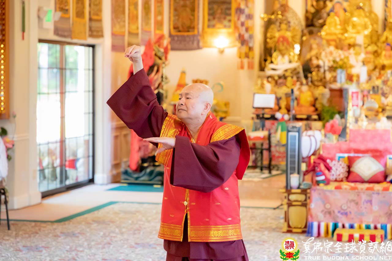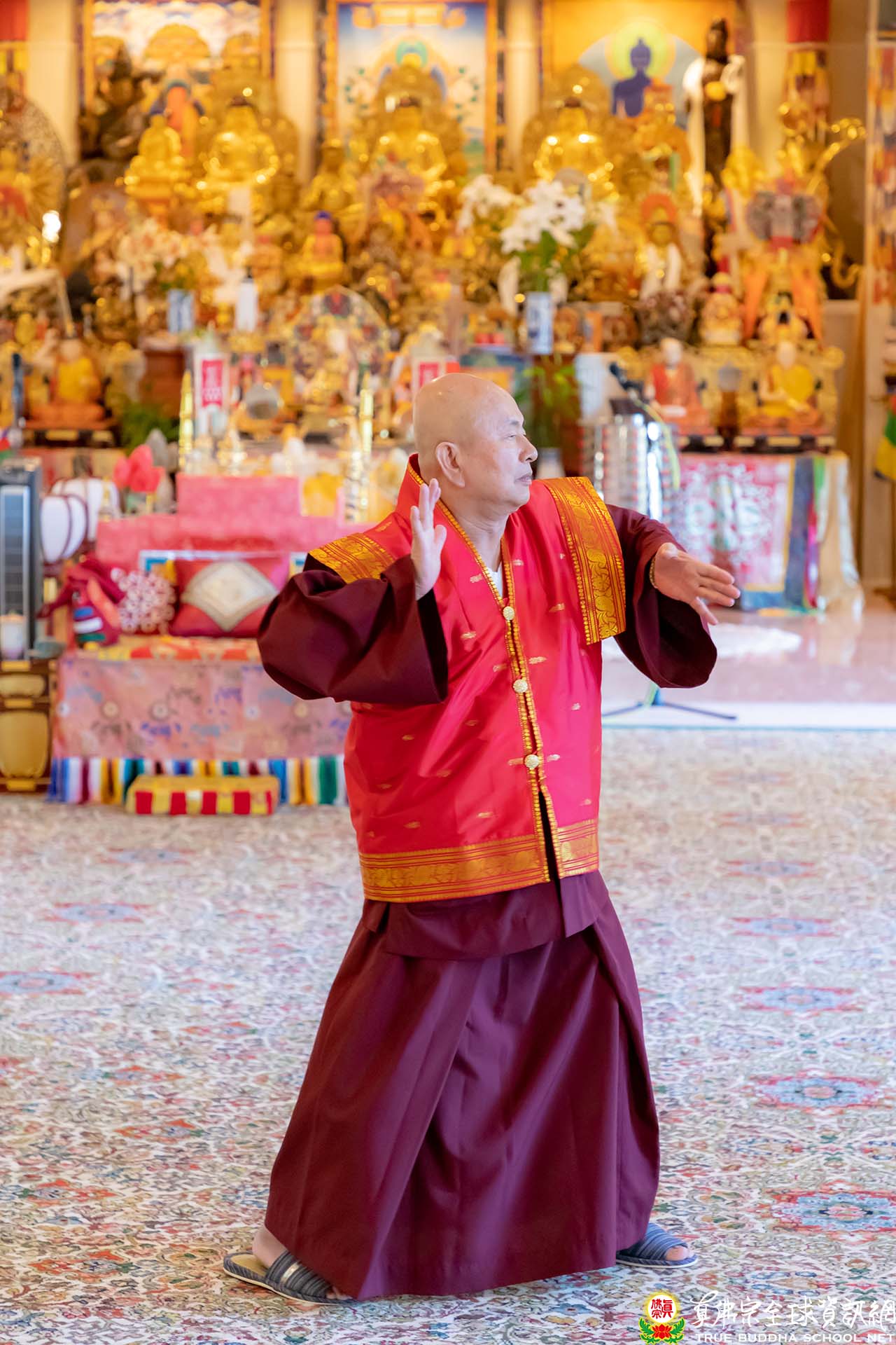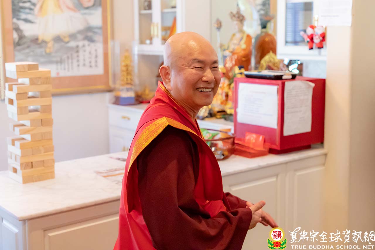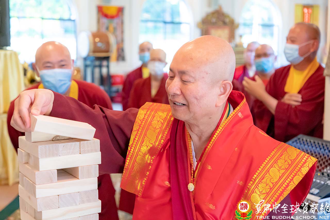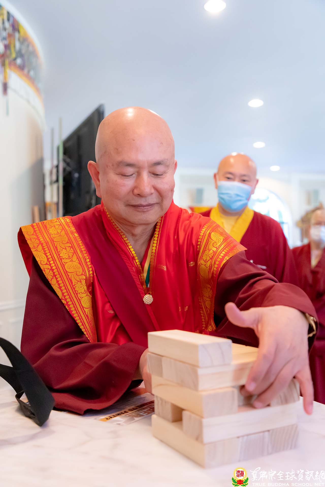 法會後,大殿供養師尊的餘興節目一一出籠,鄧麗君、周杰倫、王力宏的歌曲被工作人員一一翻唱,但眾人認為,他們唱歌的實力甚至比原唱還好聽!另外還有韻律和美感的現代舞蹈,以及爆笑的恐龍劇場演出,皆博得師尊師母的掌聲喝采,在場觀眾無不開懷。最後,師尊隨著動人的《女人花》音樂,打太極拳加持大家,為是日的壓軸。晚飯前,幾位年輕的工作人員,邀請師尊師母來玩疊疊樂桌遊(Jenga);只見師尊和師母開始一場刺激好玩,抽木頭與疊木頭的比賽,測驗兩人的結構平衡原理,也同時測驗手指的微細移動技巧。經過幾番你來我往交戰,難度越來越高,只見師母仍游刃有餘,但師尊卻屢屢找不到下手點。最後,師尊有點哀怨說,「師母成長於木匠家庭,每天玩木頭,當然她比較厲害,我們還是吃飯比較重要」,眾人聽了皆大笑。