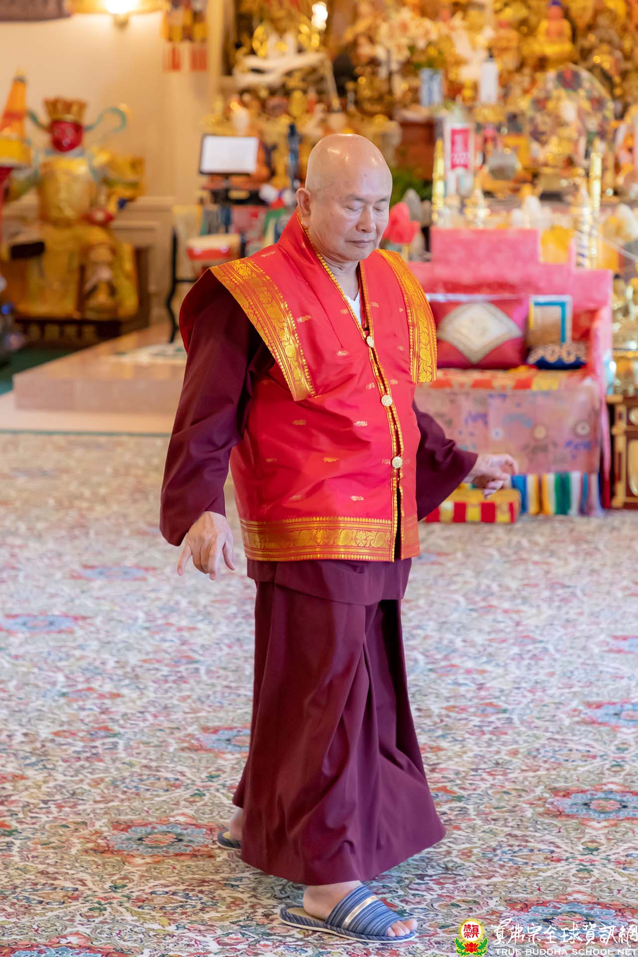 屆午時,熟悉的白車映入大眾眼簾,車門一開,師尊師母的盧氏幽默即時上場,左一句「好愛睏..為了好吃的料理而來」右一句「不用量體溫嗎? 想說也許可回家隔離」,逗得大家笑聲不斷。走向餐廳時,師尊特別提及晚上做超度觀想時,來的都是彩雷大殿播音室的地藏王菩薩、餐廳門牆上的觀世音菩薩,以及密苑樓梯旁的阿彌陀佛。師尊納悶的說,「真奇怪,壇城供奉的沒來,來加持的(佛菩薩)卻是擺在外面的。」師尊又問,為何祂們腰圍肚子都那麼大? 旁邊有人回,可能肚量大,福大吧。