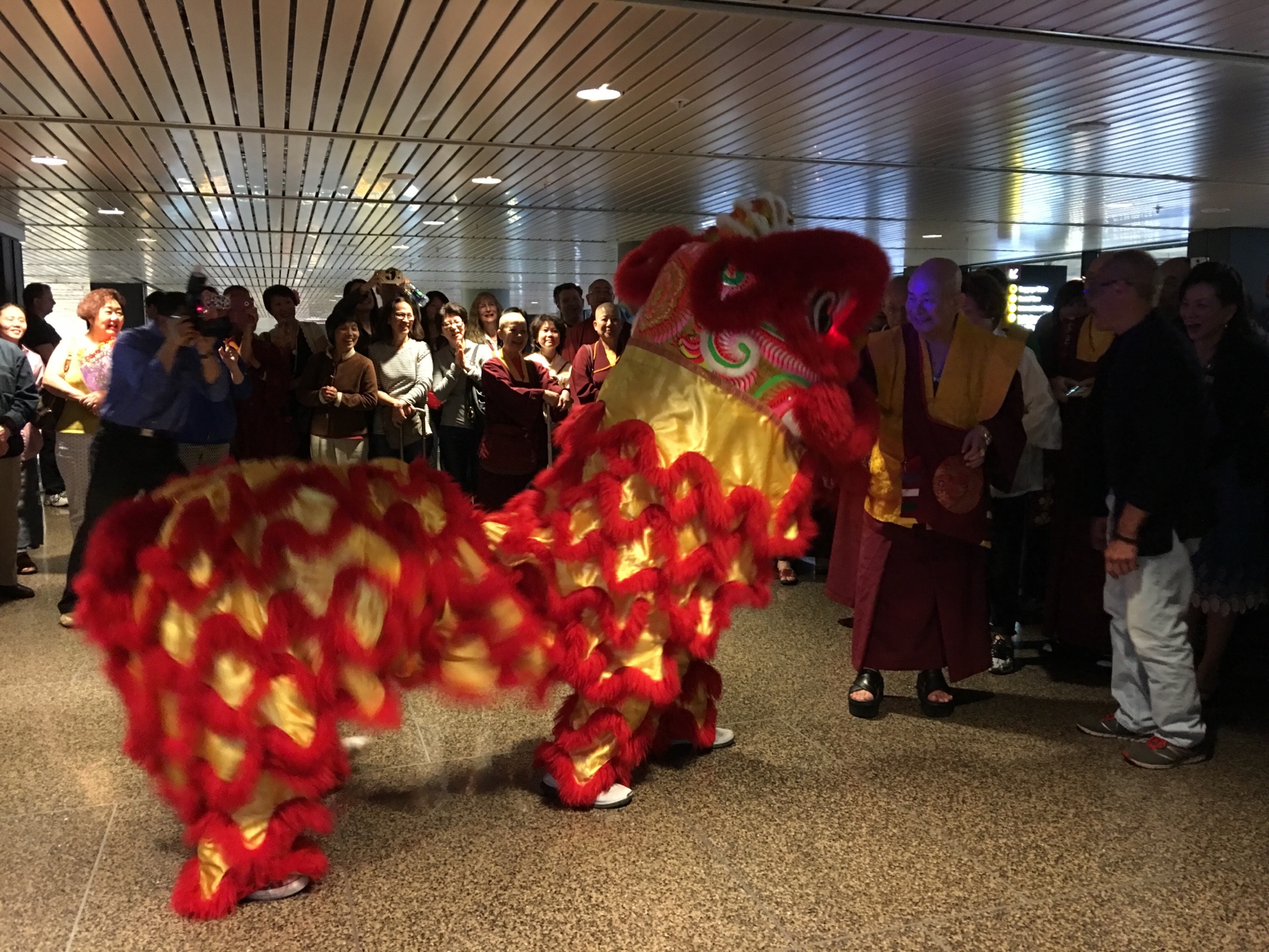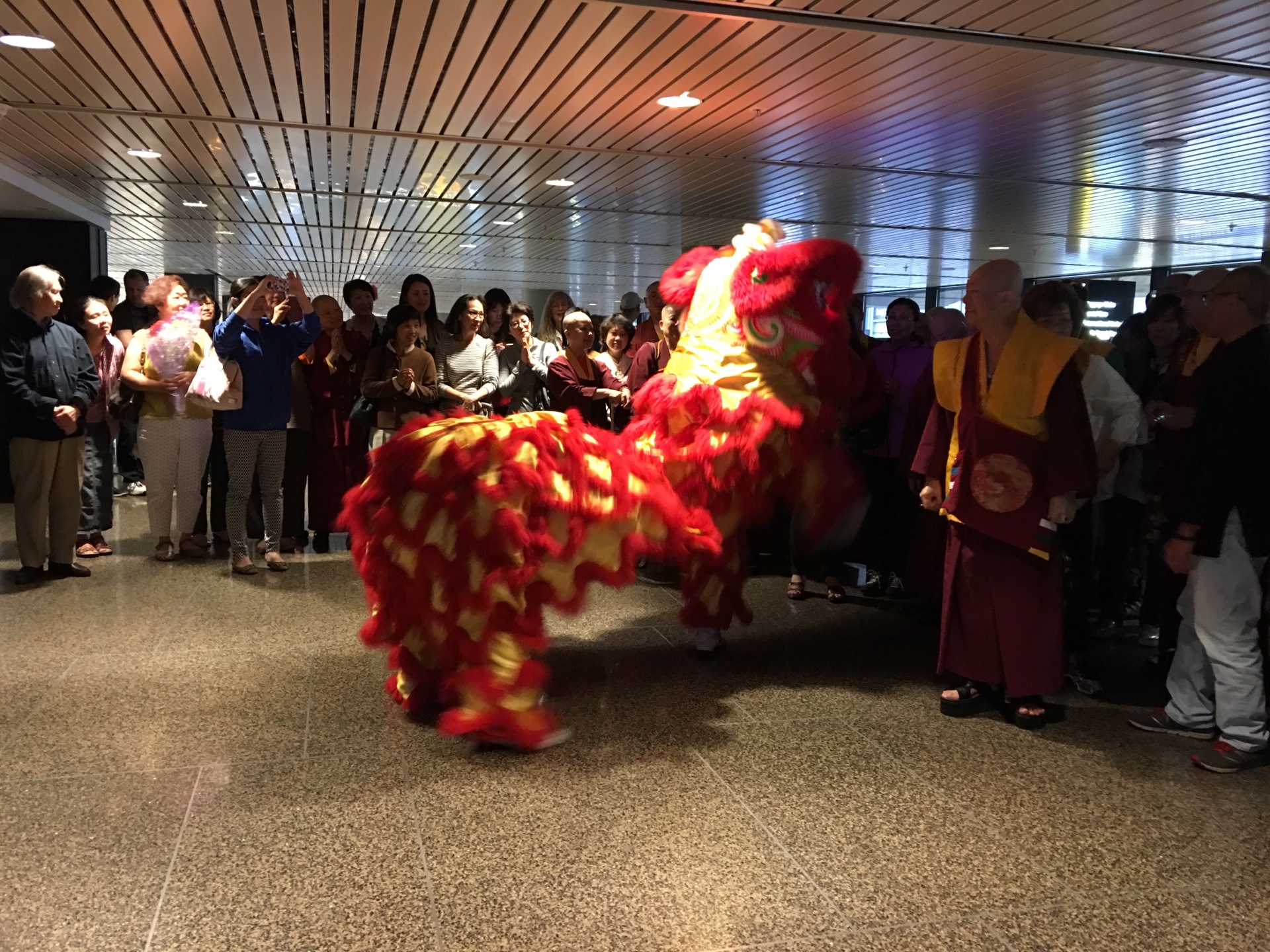 師尊、師母也親切的和大家寒暄,許多同門上前獻花,紛紛請師尊多多休息,好好休養身體。師尊、師母也開心的和大家來張幸福美滿的團體大合照。廖東周大使伉儷、周慧芳律師也來到機場迎接師尊,華埠地區麥顯輝師傅,特地準備了精彩的祥獅獻瑞歡迎師尊、師母回西雅圖。現場氣氛一團溫馨喜氣。