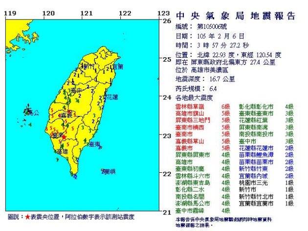 根據中央氣象局地震報告,最大震度在雲林草嶺6級,高雄市旗山、屏東三地門、臺南市楠西、臺南市、嘉義縣草山、嘉義市都是高達5級強震…