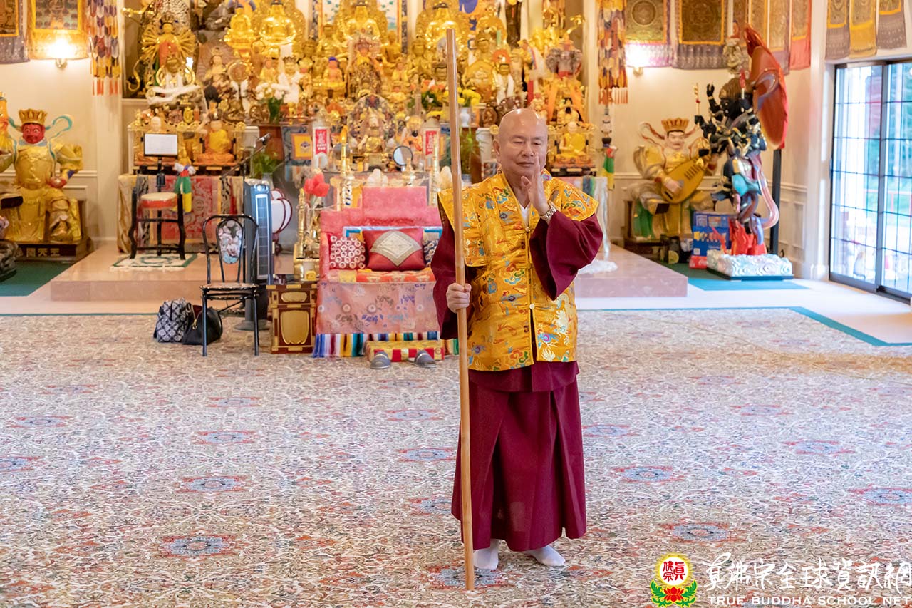 護摩結束後,大家一起跪拜頂禮感謝師尊主壇護摩法會的辛勞,師尊也帶領大眾過火。回到大殿,師尊、師母共同觀賞同門的賣力表演,最後師尊以一套快速勇猛、虎虎生風的金剛棍加持大家,在舞動如飛的棍影中,勁力纏綿不斷,棍法變化多端,讓大家為之驚嘆。