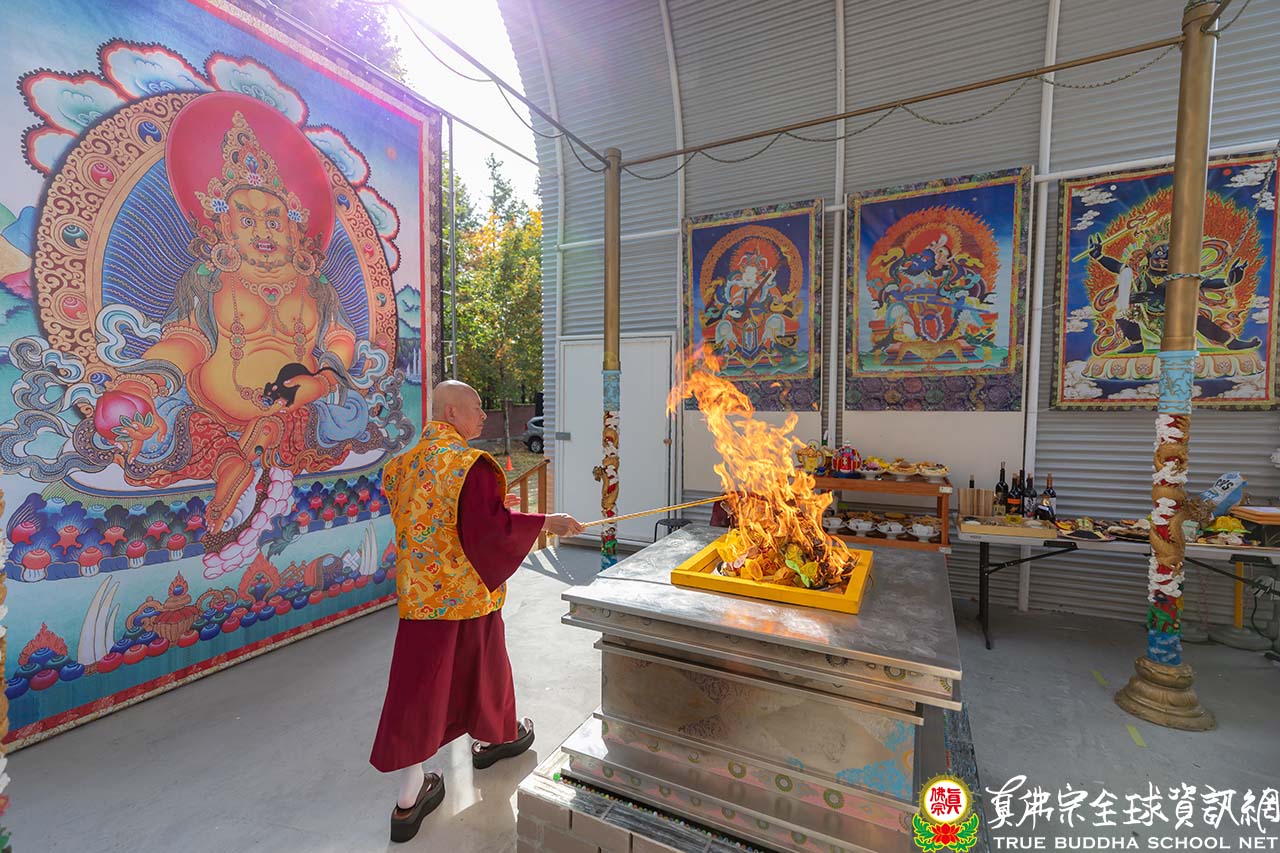 下午三點整,師尊走在彩虹雷藏寺涼風吹襲,大日遍照的黃金大道上,來到護摩寶殿主壇今日的黃財神護摩法會。網路上的同門熱情的跟師尊、師母問好,這是全球弟子們最期盼的時刻。師尊點燃護摩的烈焰,以護摩火燃燒眾生的罪業,加持所有參加者及報名的眾等能得到黃財神及諸佛菩薩的庇佑,所求如願。