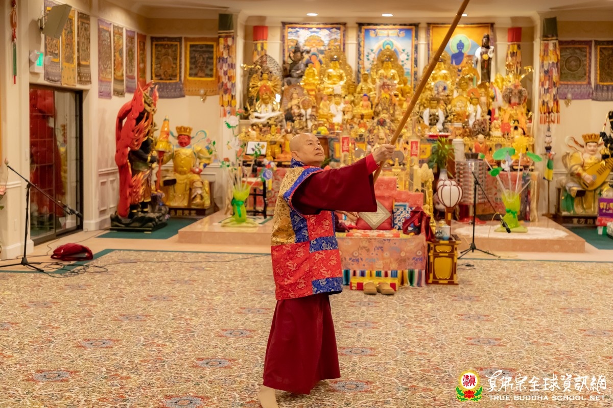 回到彩虹雷藏寺大殿,師尊最後以剛猛敏捷的金剛棍加持大家,一棍一橫掃,師尊舞出的棍花,讓大家禁不住呼喊尖叫、無限的讚嘆。晚餐時分,師尊也談到他一開始學習棍法的緣起,以及過程,師尊說到他有參考一片同門供養的棍法光碟片,之後,師尊就自己練習摸索棍法招式,以飽滿的精氣神舞出的不同凡響的金剛棍。若是在古代,師尊的習棍的天賦異稟,說是武學奇才也不為過呢!