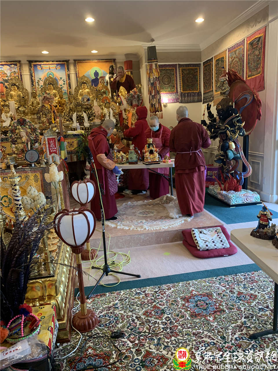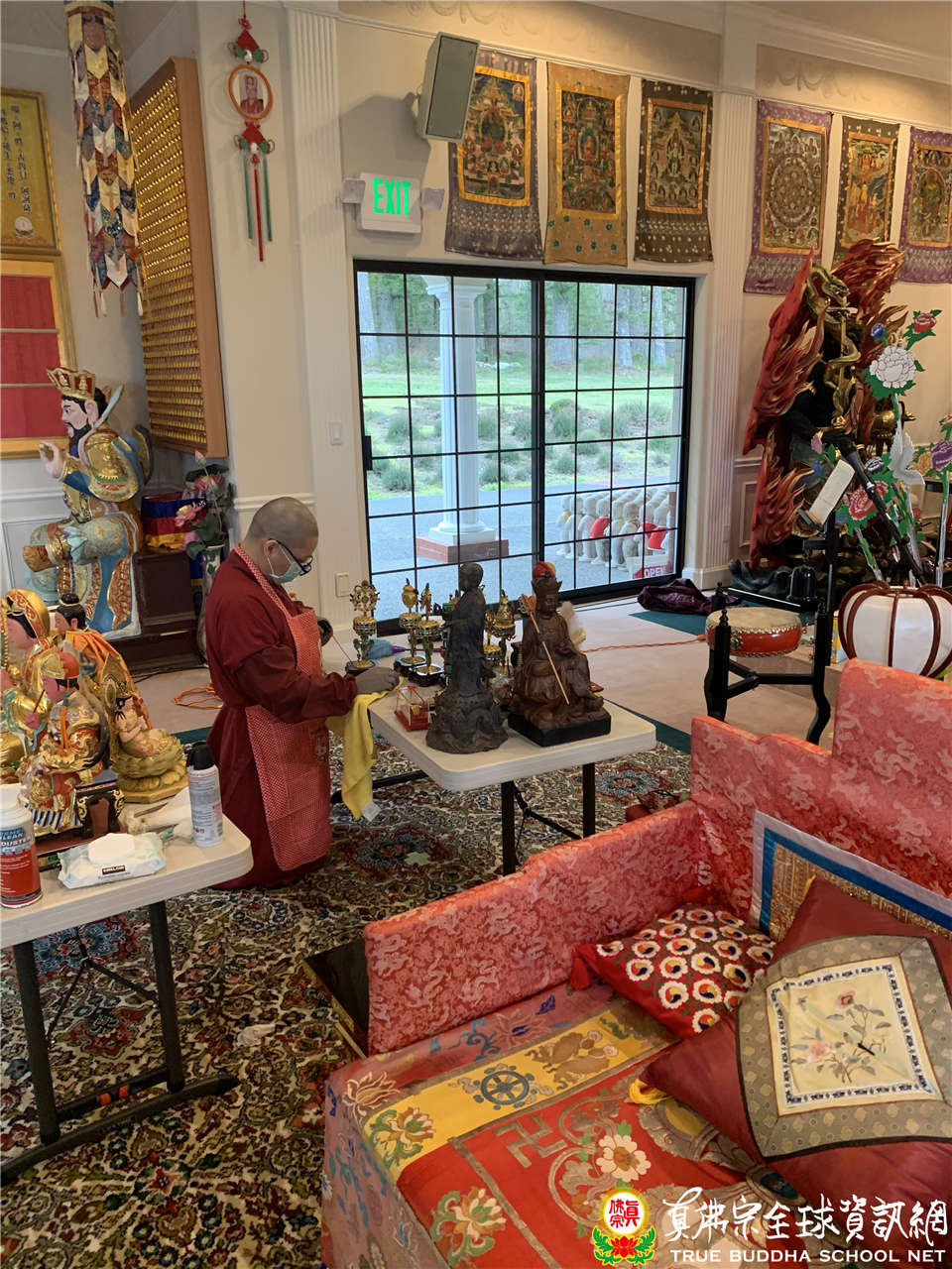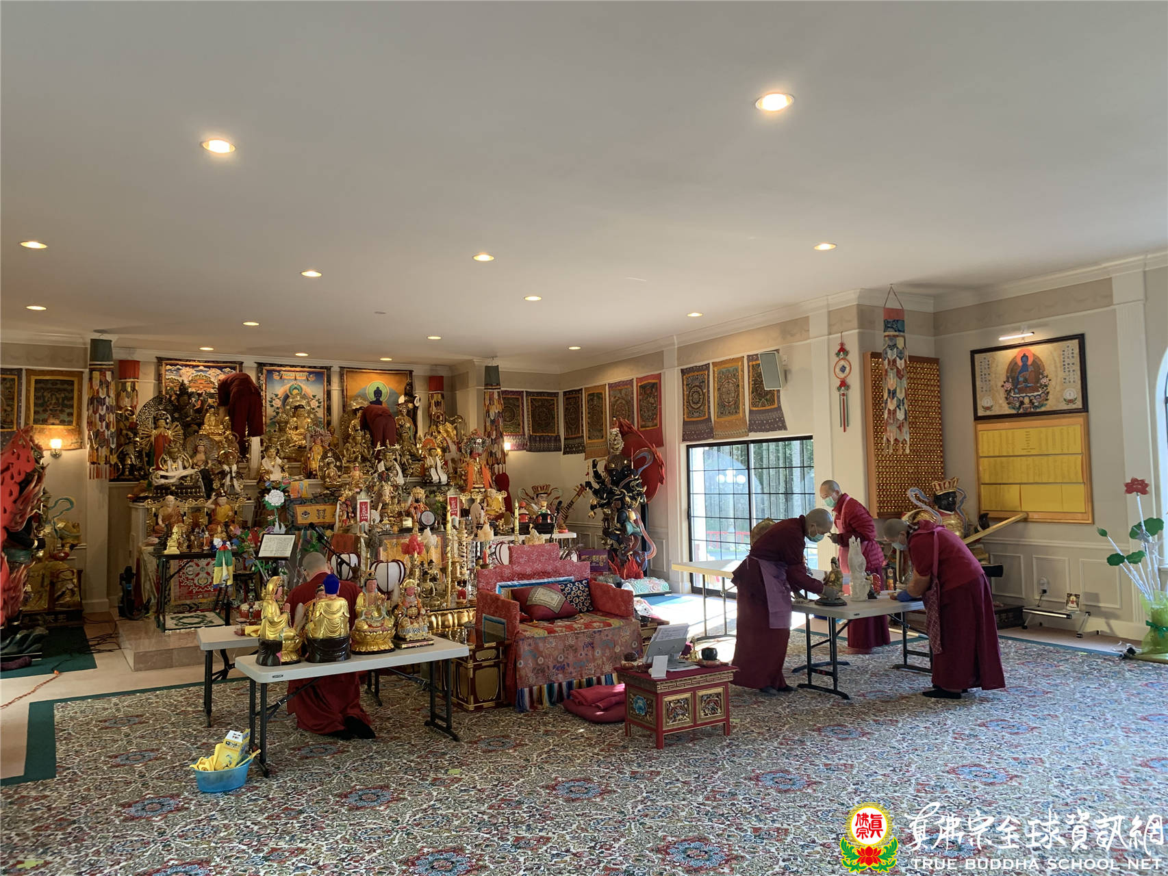大掃除開始前,首先點香稟報壇城諸佛菩薩、龍天護法,祈請祂們先暫住虛空。接著,便開始清潔壇城,上師、法師們先將壇城上小尊的佛像金身搬到備好的大桌上清除塵埃,身手矯健的男眾上師,上到壇城的最高處,用撢子或乾淨的布將佛像金身與壇城擦拭乾淨,彷彿也抹去了我們心中的煩惱塵埃,一掃而空。