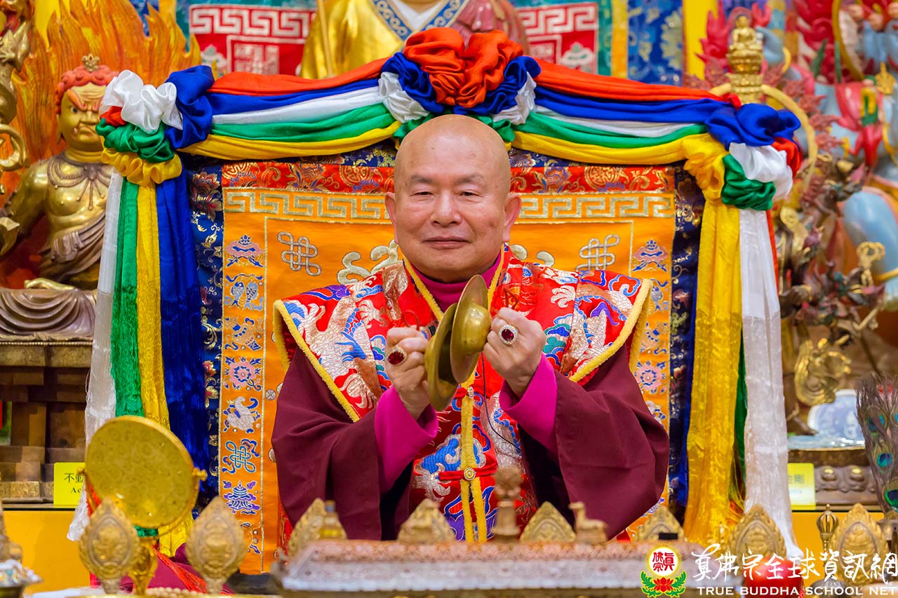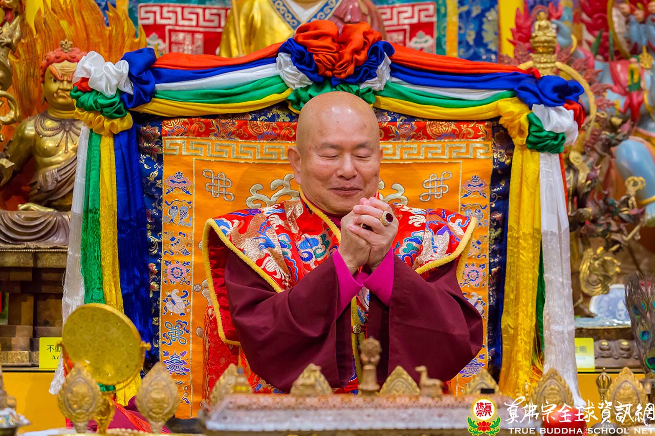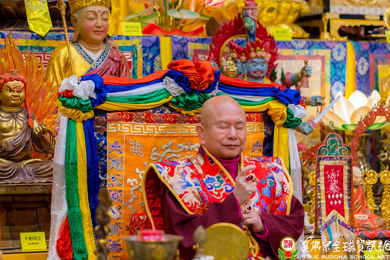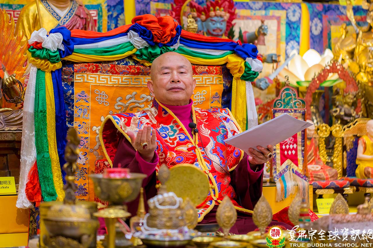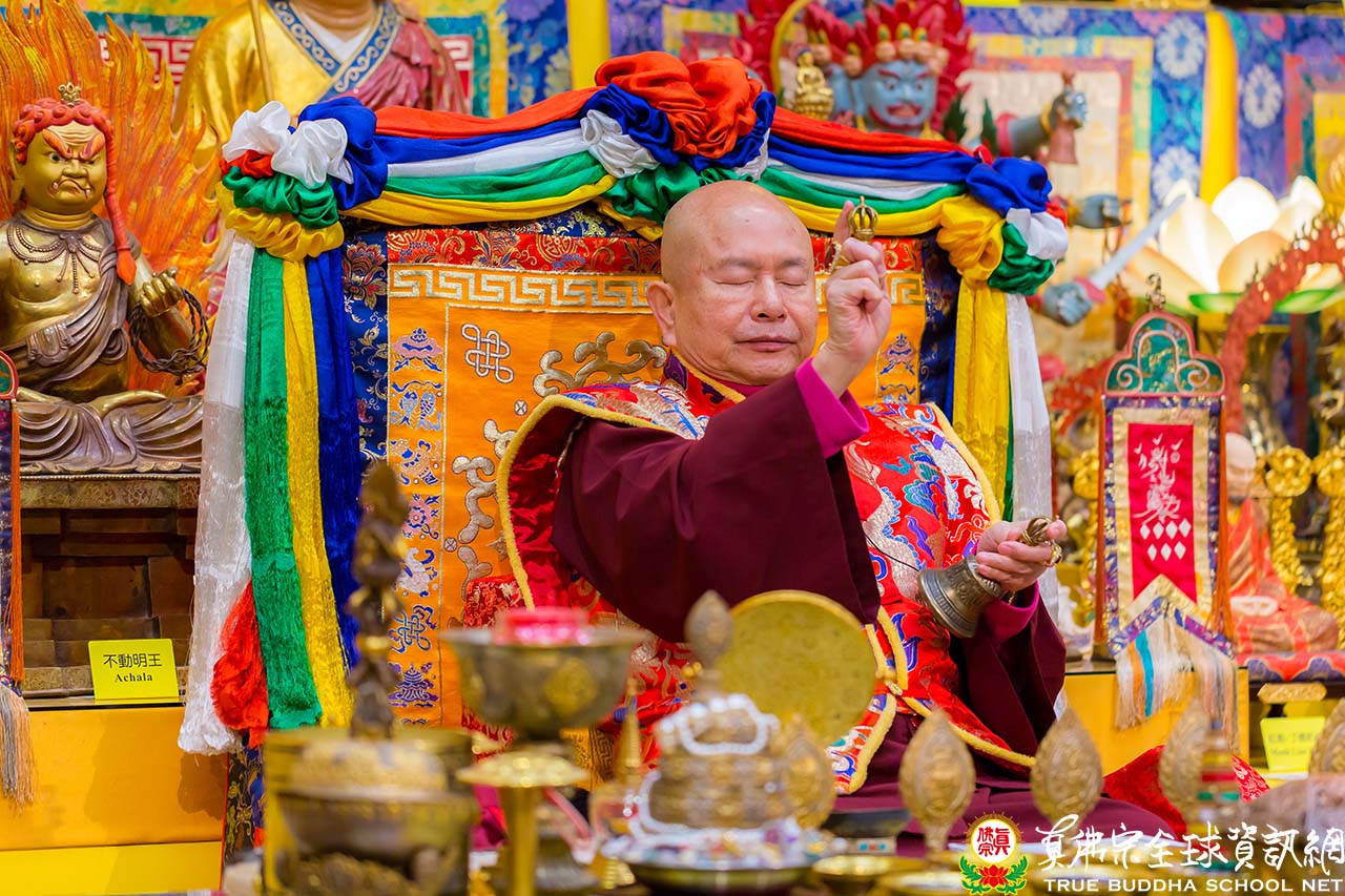 當磬聲韾起,與會大眾都跪迎師尊蒞臨,迎請師尊上了法王座後,師尊帶領大眾修了一壇殊勝的阿彌陀佛本尊法。