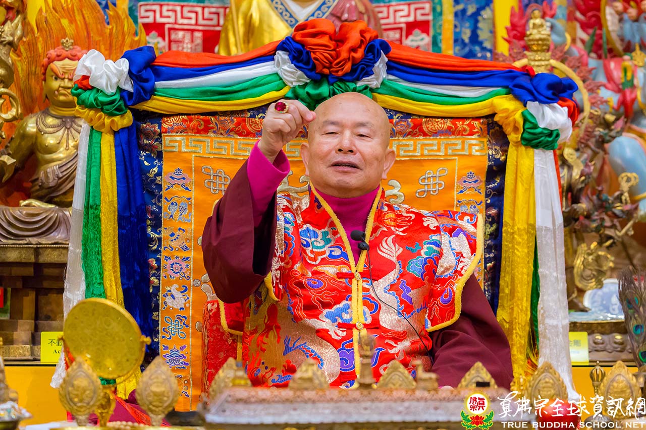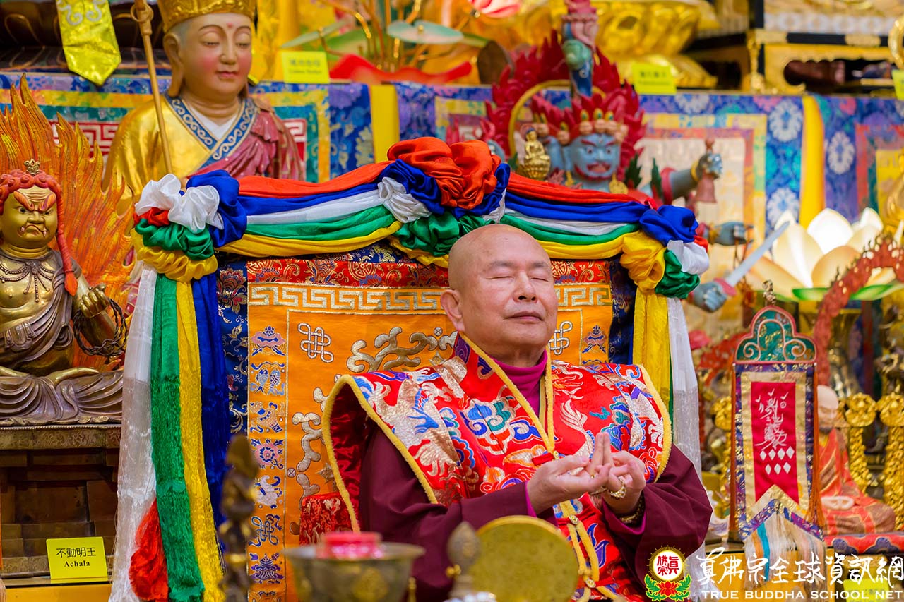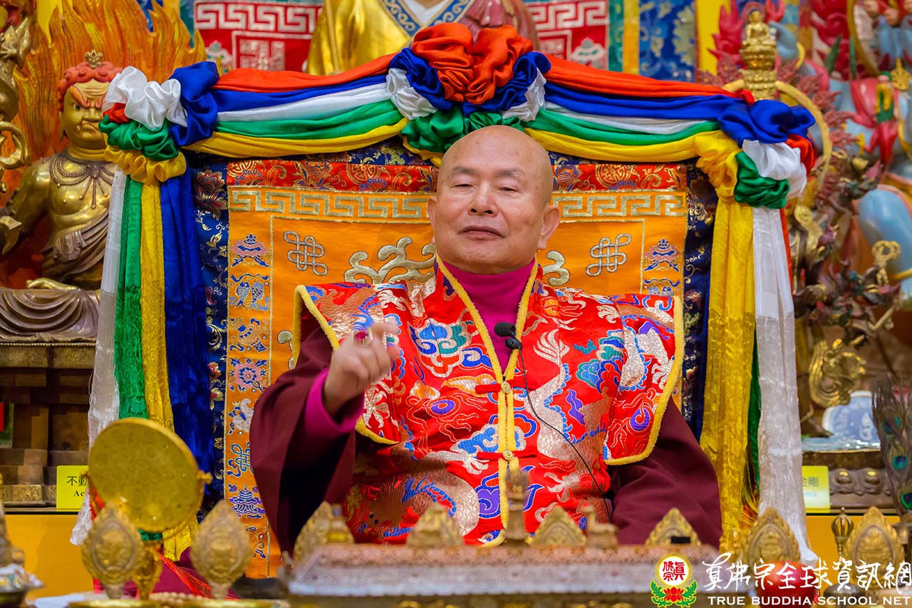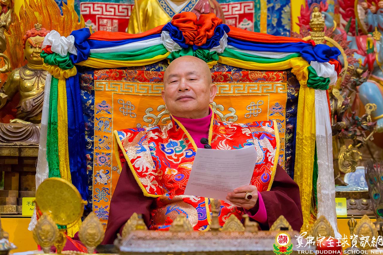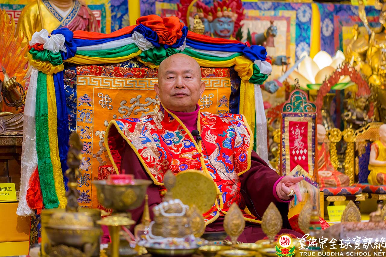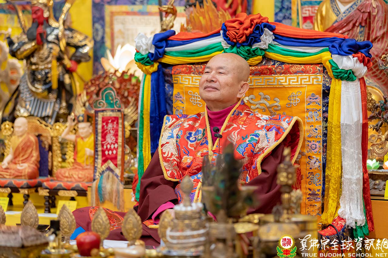 當磬聲韾起,與會大眾都跪迎師尊蒞臨,迎請師尊上了法王座後,師尊帶領大眾修了一壇殊勝的阿彌陀佛本尊法。