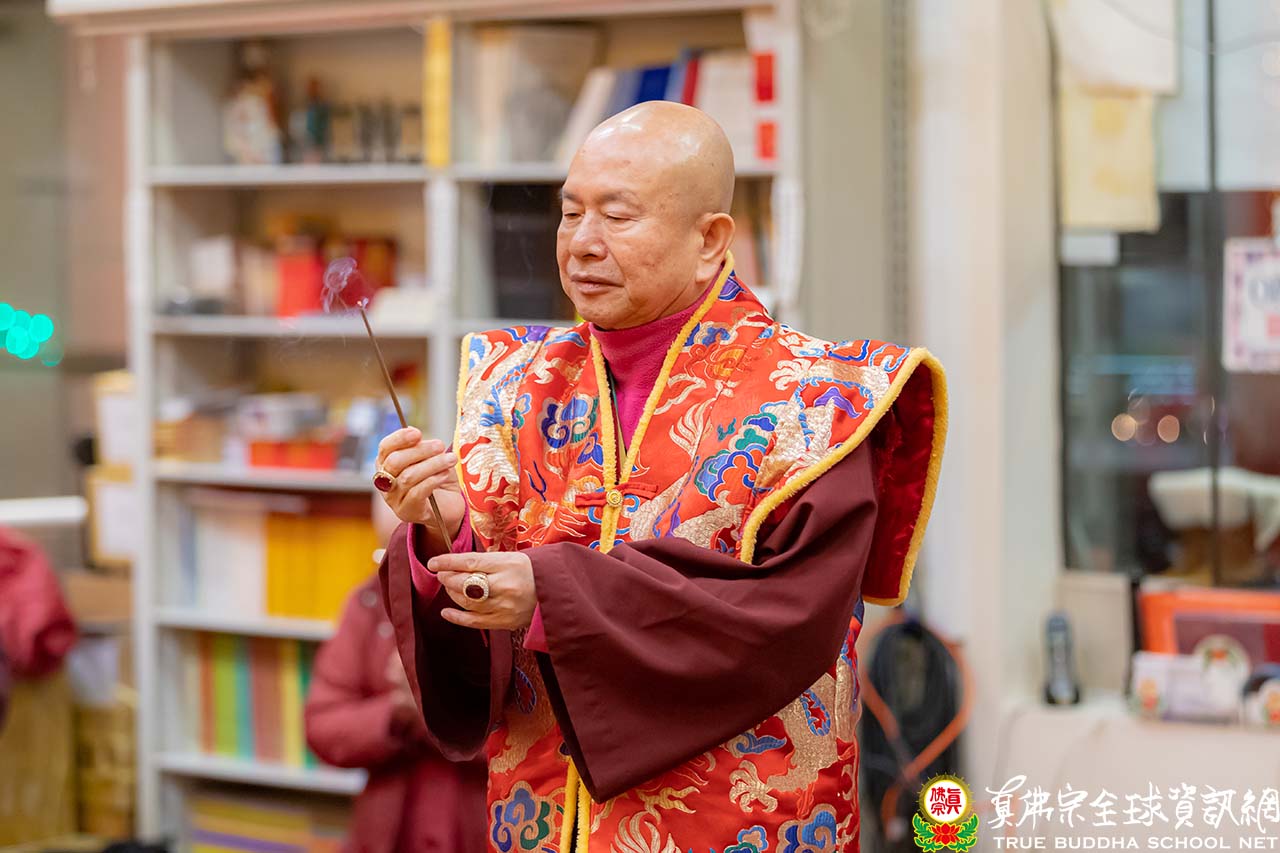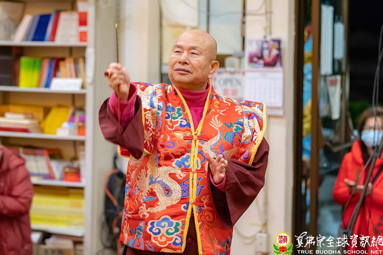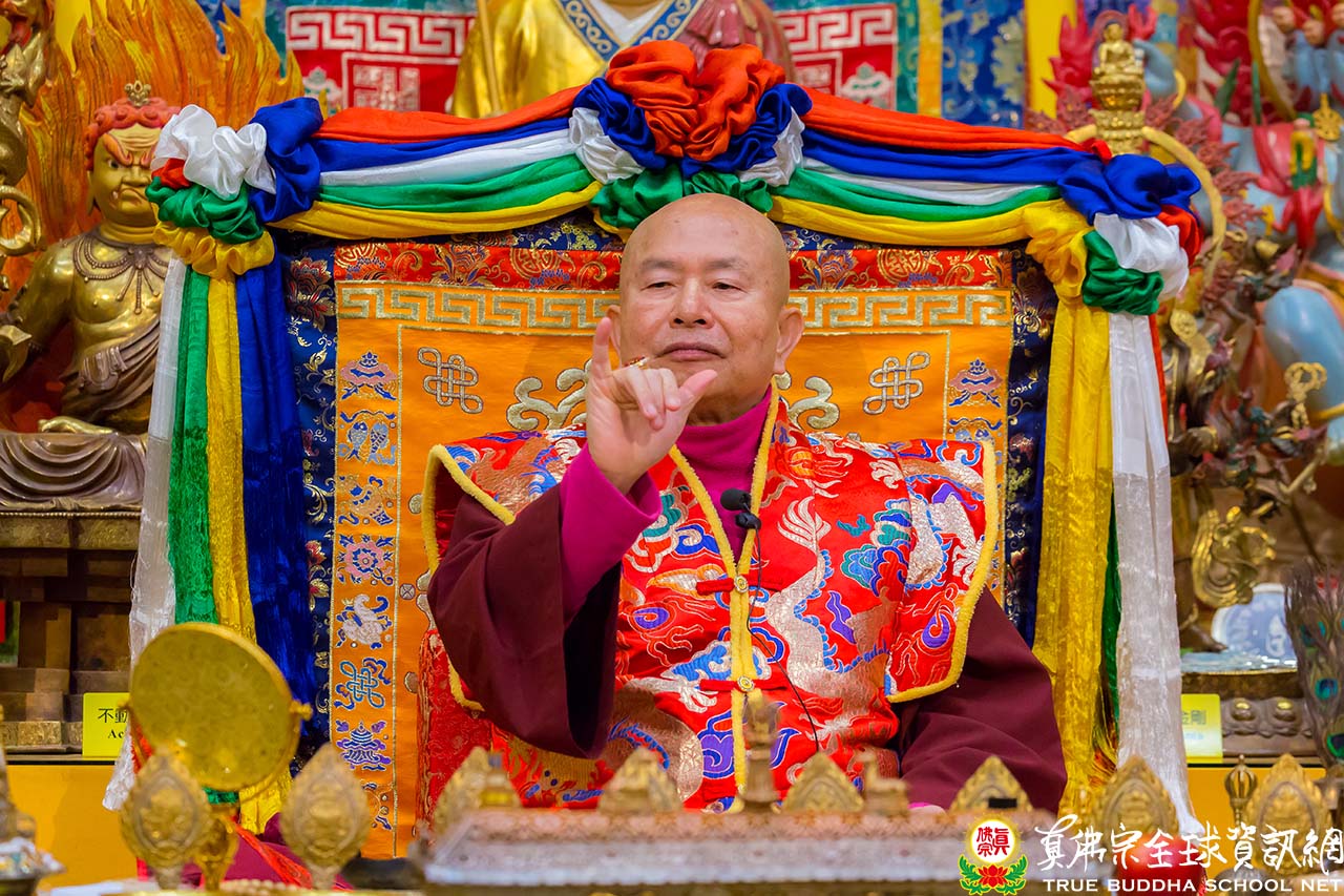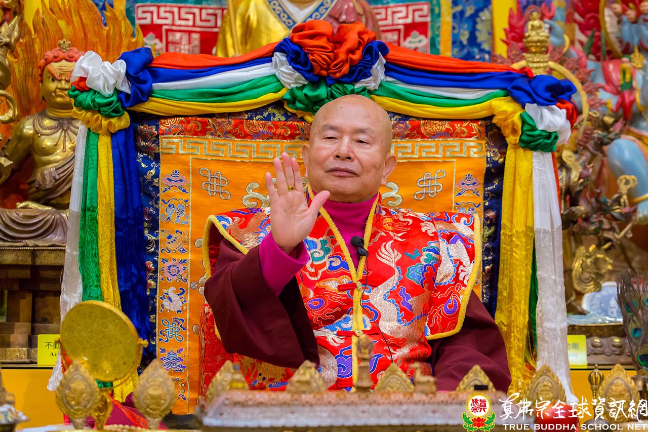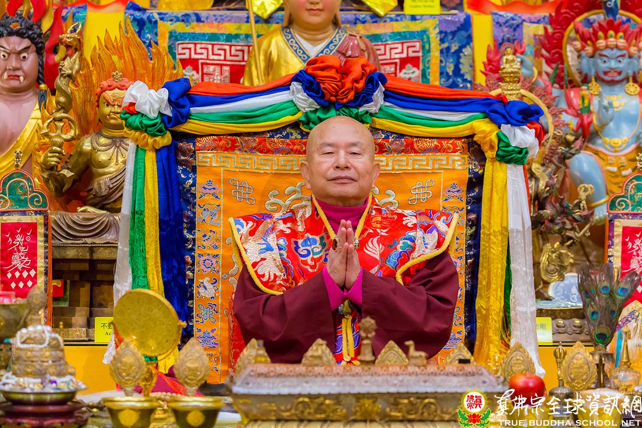 當磬聲韾起,與會大眾都跪迎師尊蒞臨,迎請師尊上了法王座後,師尊帶領大眾修了一壇殊勝的阿彌陀佛本尊法。