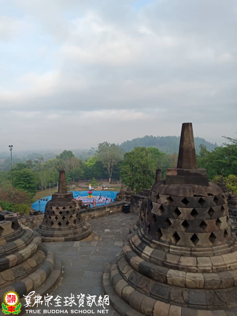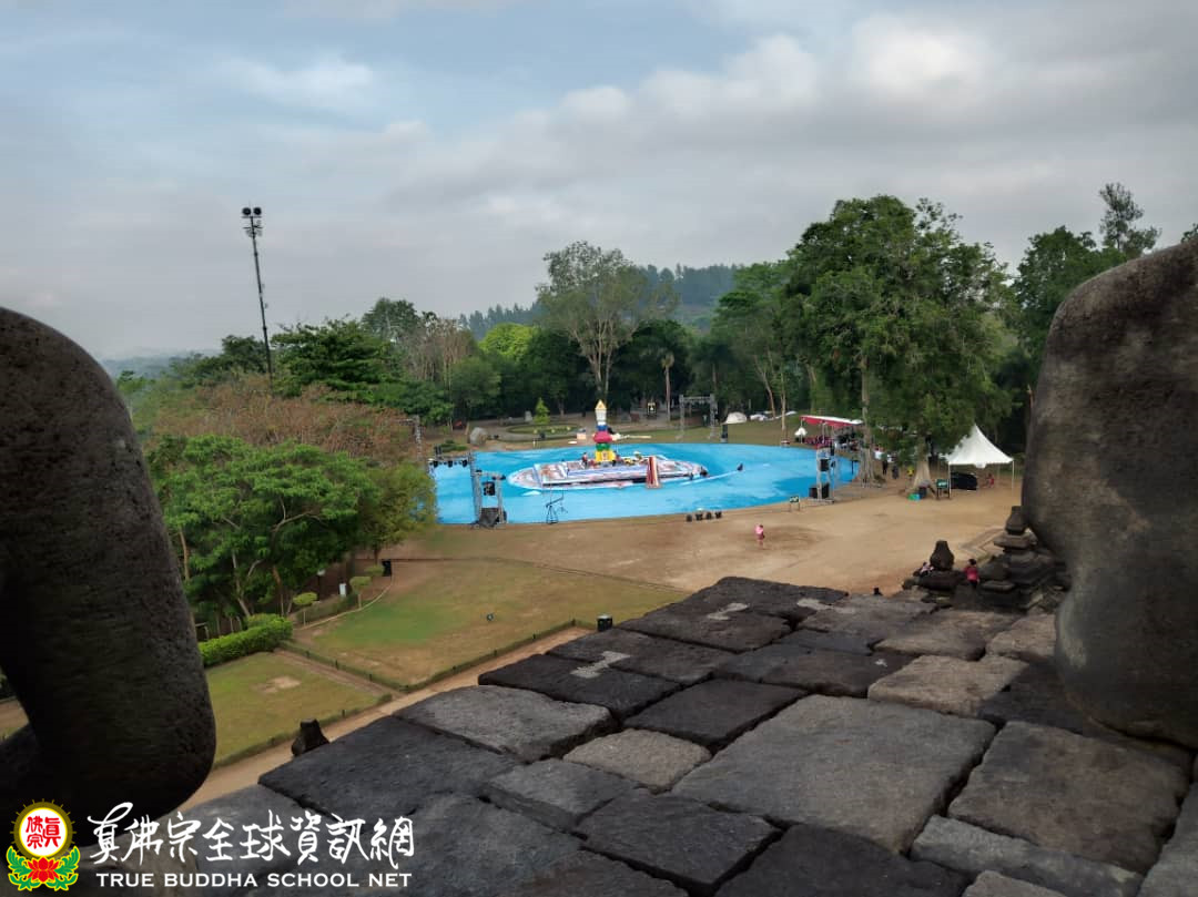 自婆羅浮屠佛塔遙望,真佛宗時輪金剛曼陀羅已完成。真佛宗根本傳承上師蓮生法王聖尊傳下如此珍貴之時輪金剛大法,讓受灌頂的真佛弟子們得以在七世之內成佛,實乃多世修得的福緣!我們感恩根本上師所賜之福份,讓我們得以在印尼婆羅浮屠佛塔聖地,建立時輪金剛曼陀羅,宣揚蓮生法王之偉大成就,與大眾結緣,廣度有緣眾生!