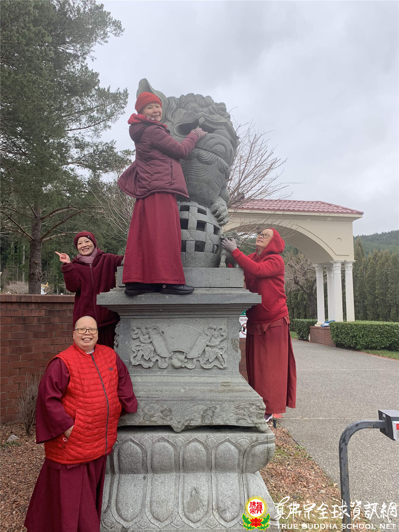 在供養獅王菩薩後,有一段令人莞爾的小插曲。由於法王聖尊蓮生活佛曾說過,只要手摸一下獅王菩薩口中的大石珠,下來之後很恭敬的向獅王菩薩合掌,許一個心中的願望,這願望就會實現。當大家都輕鬆地上去摸完大石珠後,唯獨剩下一位體態較為豐腴的掛單法師始終無法上得去。其中有一位上師很認真地對那位法師說:法師,您上不去是嗎?那我們幾個合力幫您上去好嗎?當場大家心中的滋味忐忑,等待著那位法師的回話,還好那位法師說:不用了,我在這裡誠心祈願就好了。聽完了法師的回話後,大家如釋重負般的輕輕的鬆了一口氣。