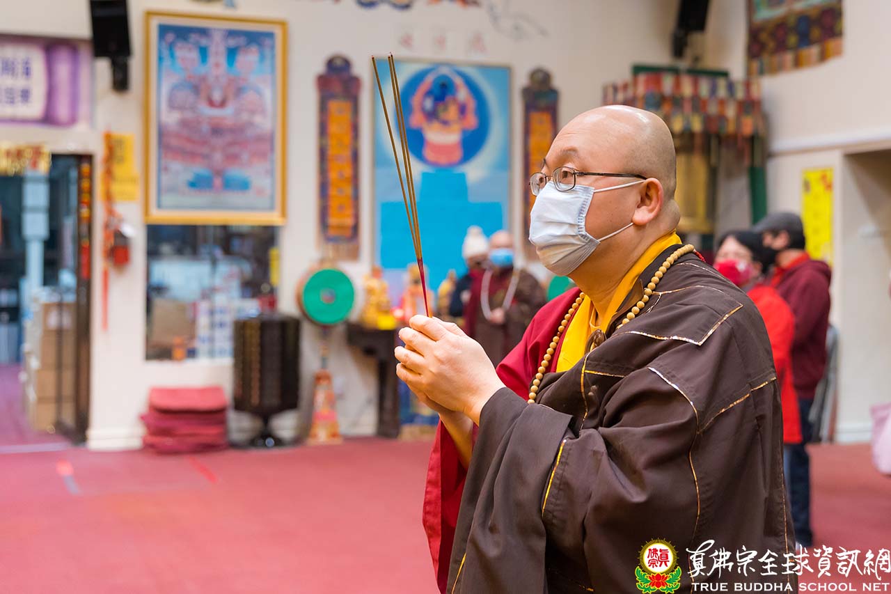 夜幕低垂,除夕圍爐,西雅圖雷藏寺大飯店準備了豐盛的年夜飯讓師尊、師母及上師、法師們食用,大家一起開心的跟師尊、師母團圓用餐。晚餐後,師尊、師母到祖廟大雄寶殿,為祈願新的一年大家都能平安如意,特別上香向佛菩薩祈求,願佛加被常護佑。也為新的一年點燈,祝禱新的一年光明吉祥。