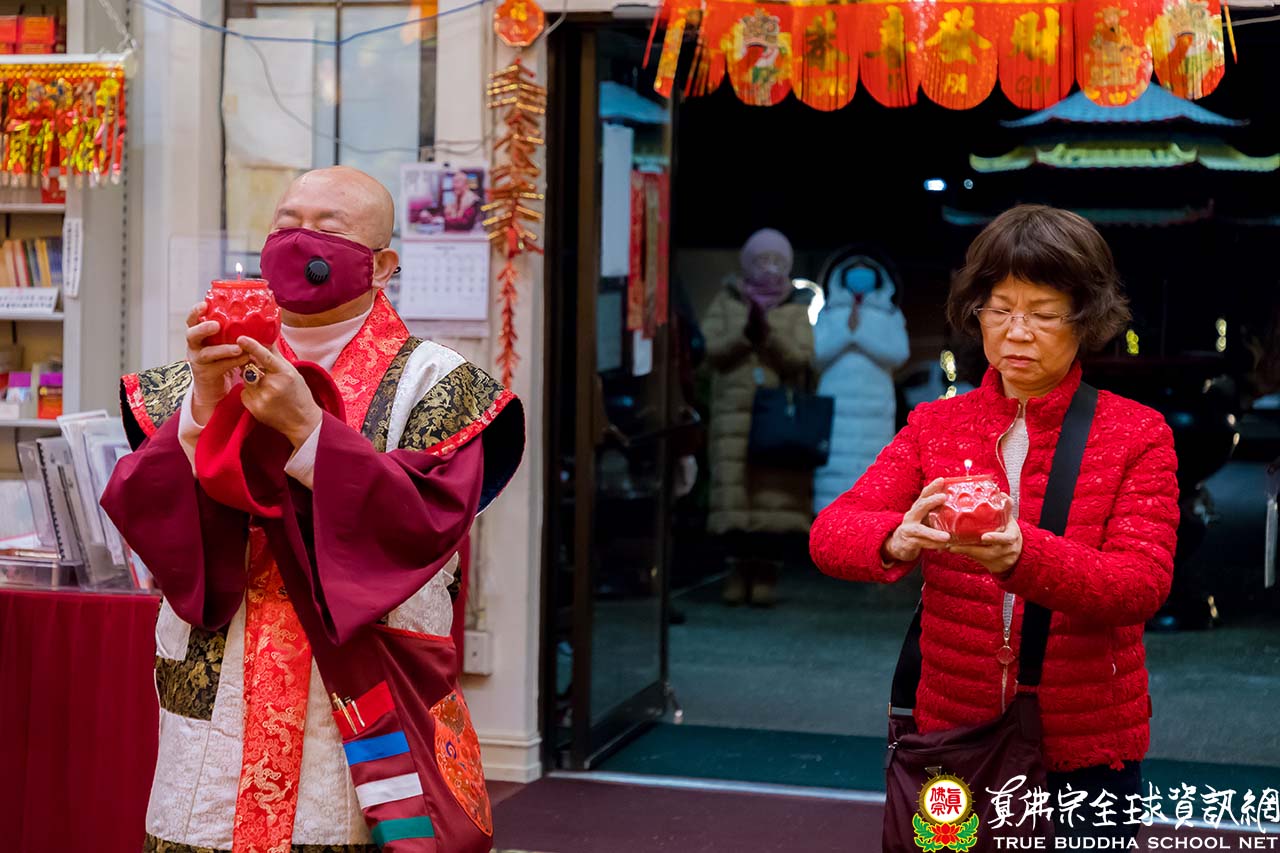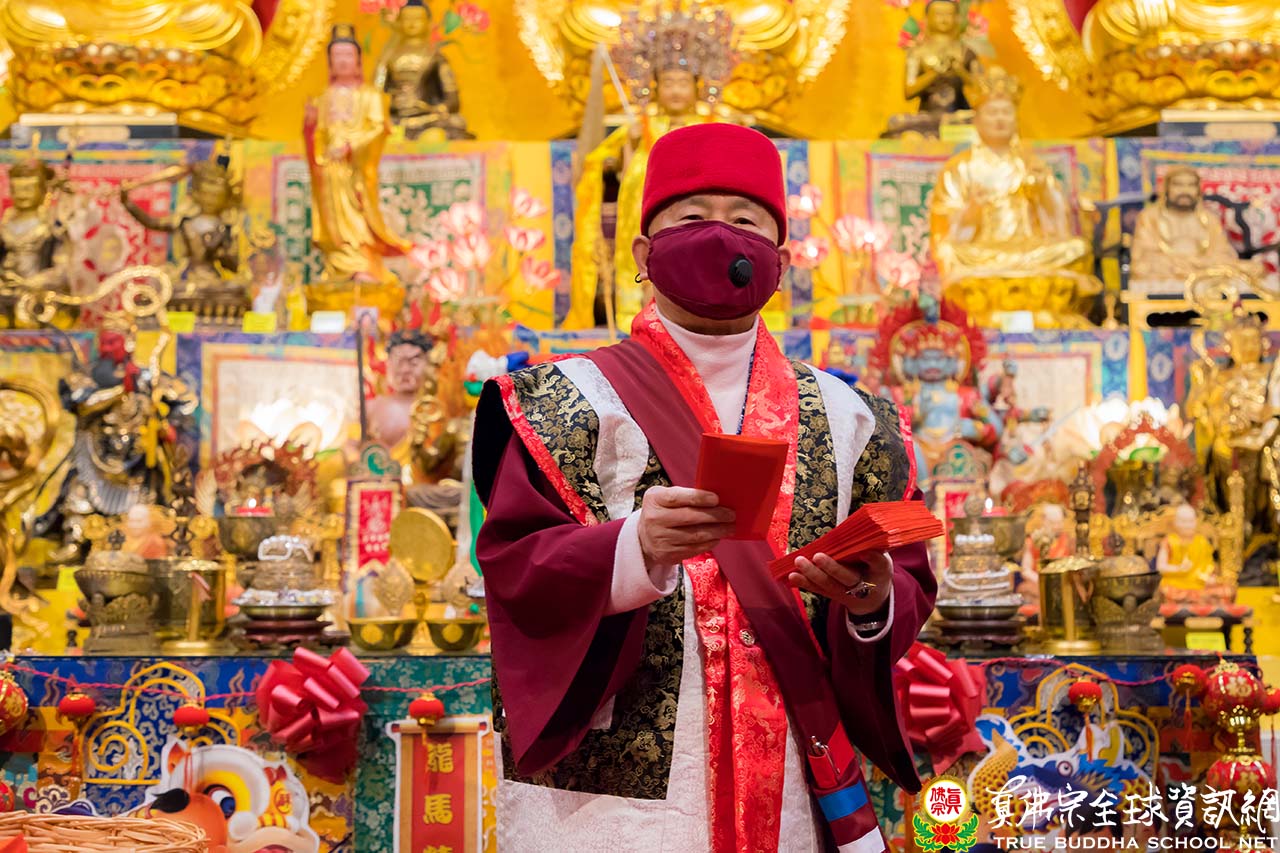 在師尊、師母莊嚴的上香點燈儀式結束後,接下來就是最開心的時候到了。在特別加持了新年紅包後,師尊開始發紅包給大家,弟子們開心的排隊保持安全距離,恭敬的領受師尊給予的賜福。大家熱情的向師尊、師母拜年,師尊、師母也滿臉笑意春風的祝福大家。有了師尊、師母的賜福,相信在未來新的一年,大家都能一切如意圓滿。在每個人都高興的領完紅包後,師尊、師母也準備回家與佛青、佛奇和孫子、孫女一起團圓吃湯圓。