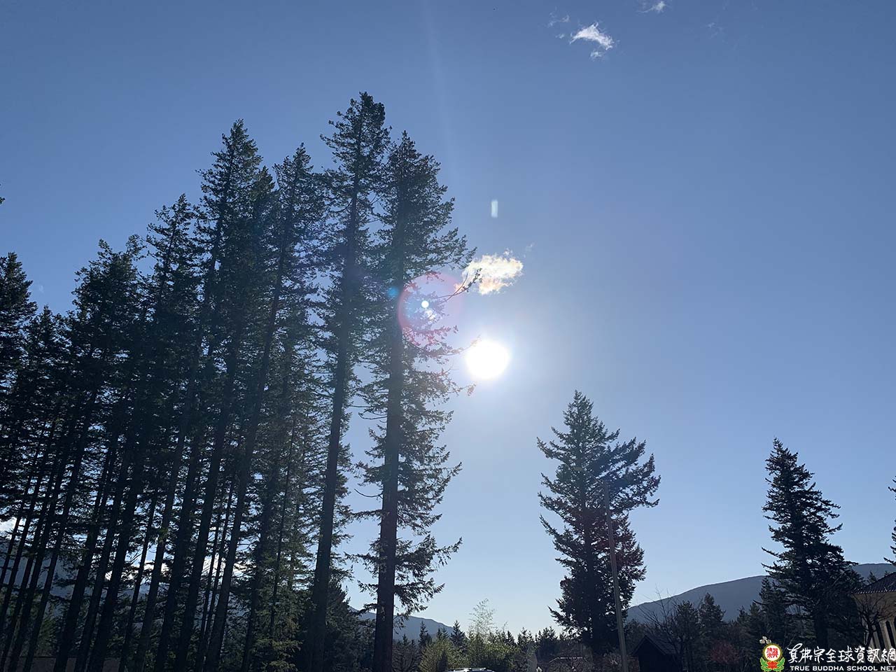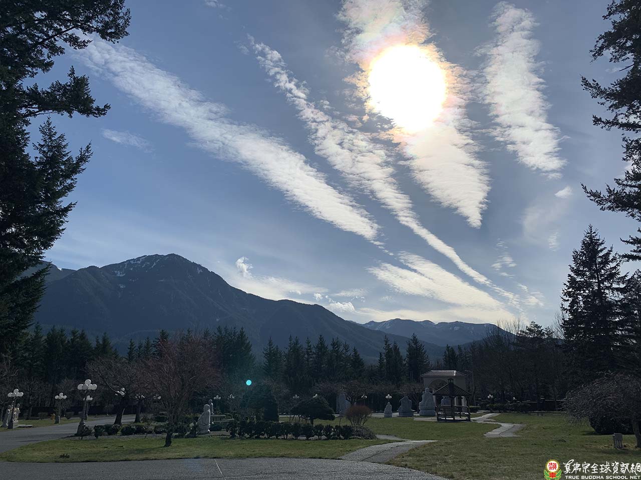 2021年3月1日(星期一)是農曆正月十八,春回大地的三月份,當天大日遍照,如同祥光萬丈的天空,籠罩在大日下的彩虹雷藏寺顯得格外的金光燦爛,令人法喜充滿!在彩虹雷藏寺每天千變萬化的美景,每每都會令人嘆為觀止,百看不厭。師尊、師母每次都讚嘆這是人間仙境,住在這裡的人就如同住在仙境裡,有風水地靈的寶地加持助益下,天然寧靜的彩虹雷藏寺就成了修行好道場。
