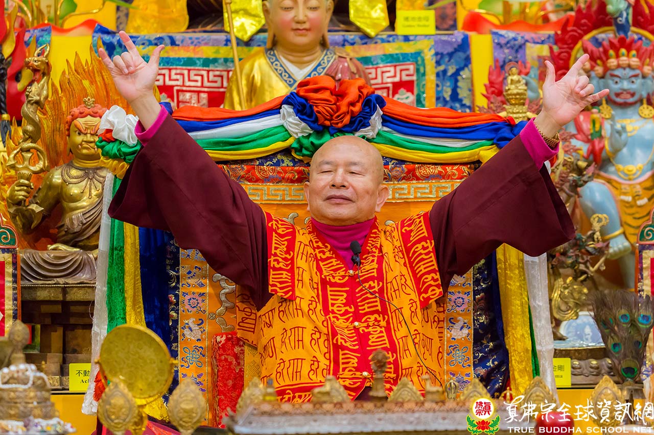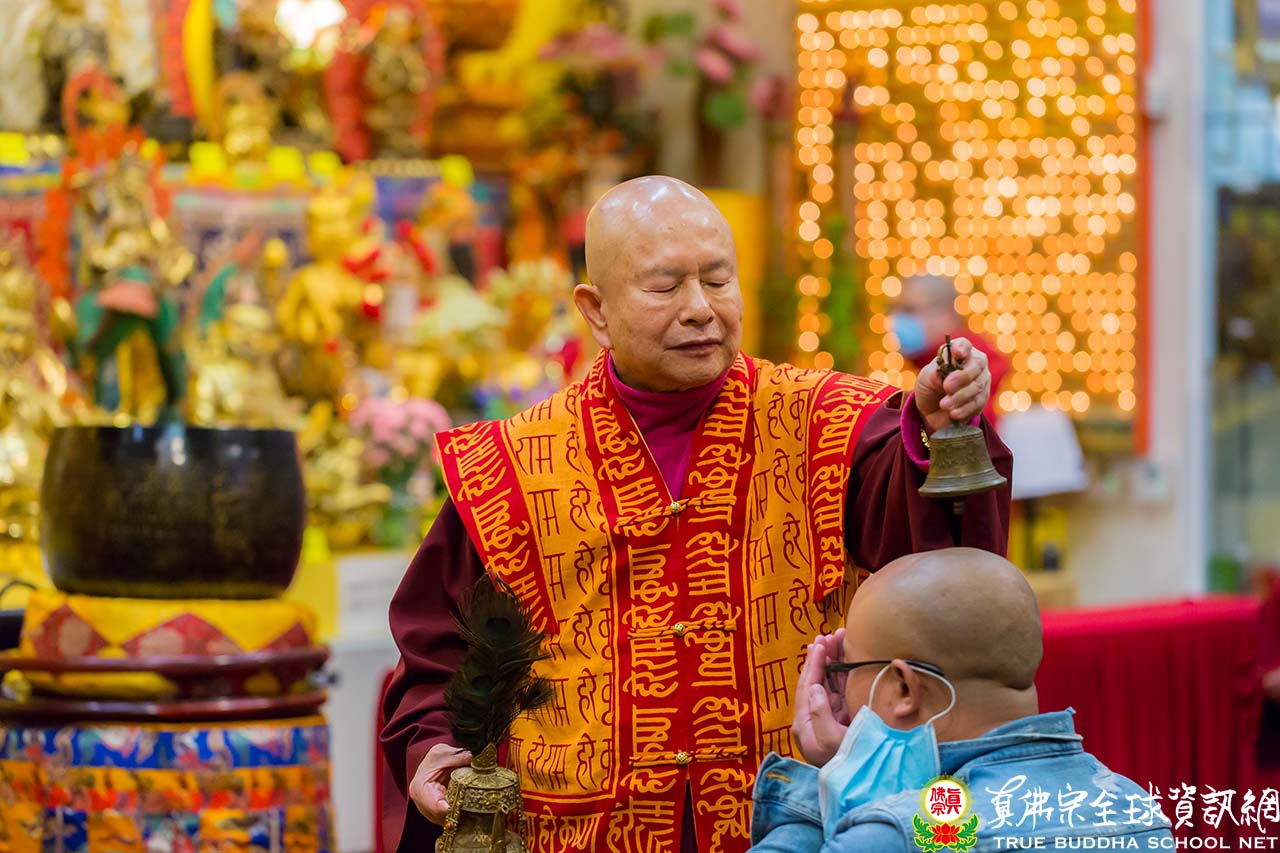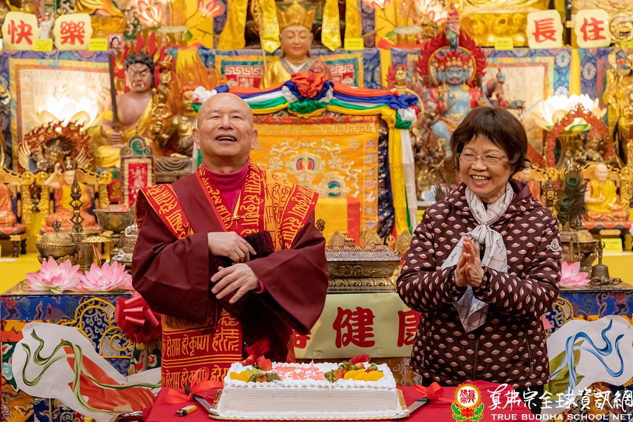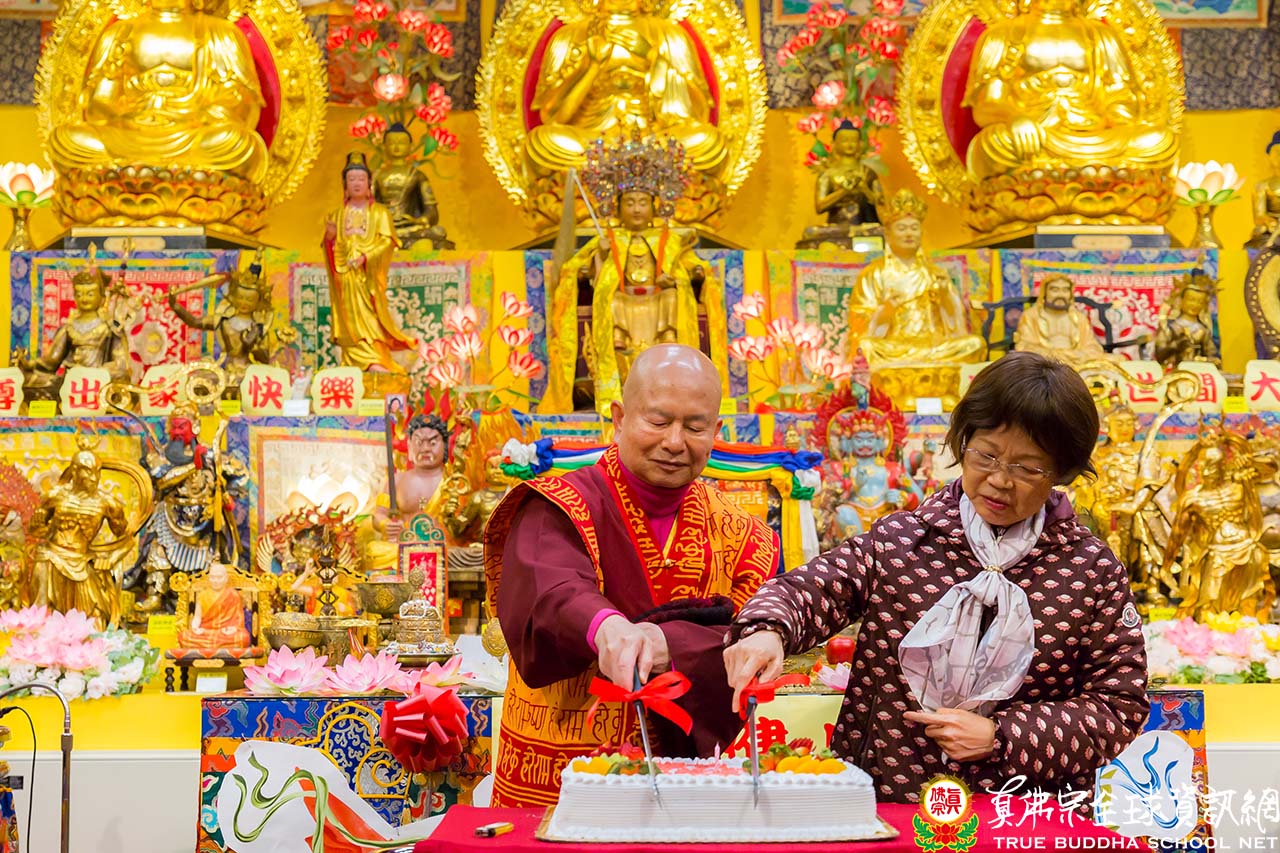 在聖尊精妙絕倫的開示後,聖尊加持大眾並加持大悲咒水和為佛像開光。祖廟特別準備了大蛋糕為慶賀聖尊的出家紀念日,大家開心的唱歌祝賀。最後,聖尊慈悲以拂塵為大家加持賜福。