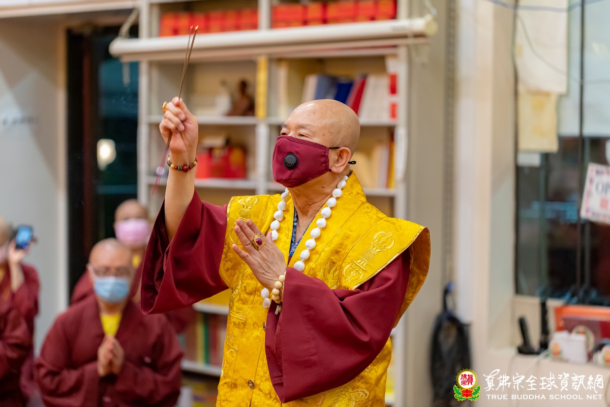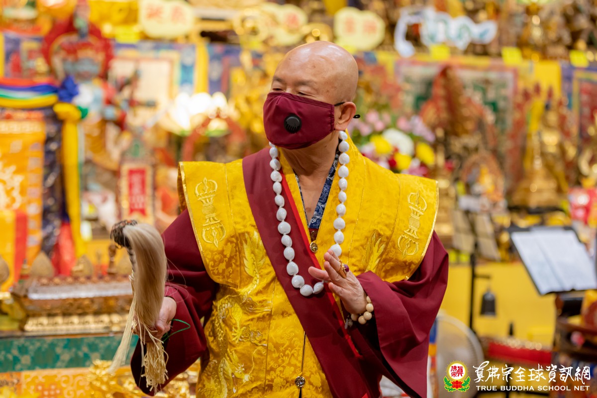 聖尊告訴大家,平時在每一天晚上加持了師母,在她的房間做了結界,一路走回房間的時候,經過供奉的諸尊,都唸祂們的名字一遍,然後,師尊敬禮所有諸尊,合掌放在頭頂上,向祂們敬禮。敬禮的時候,觀想自己的手掌變成佈滿整個虛空,唸一遍諸尊名號,然後觀想所有的手掌全部都在敬禮,一萬個敬禮、一萬萬個敬禮、一億個敬禮。這個束心、敬禮,祂們全部接受,每天晚上都這樣子做,然後刷好牙,上法座做超度,用一千隻的法船來超度所有患新冠病毒的亡者。做完超度以後,再修法入三昧地。天天晚上這樣子做,做了一年多,就算再怎麼忙,每天晚上這個功課一定要做,每一次都是到兩點甚至到四點。人一定要有那一種信念,為了一個理想,「不捨一個眾生」。