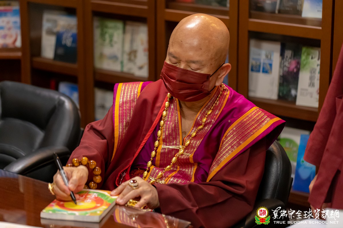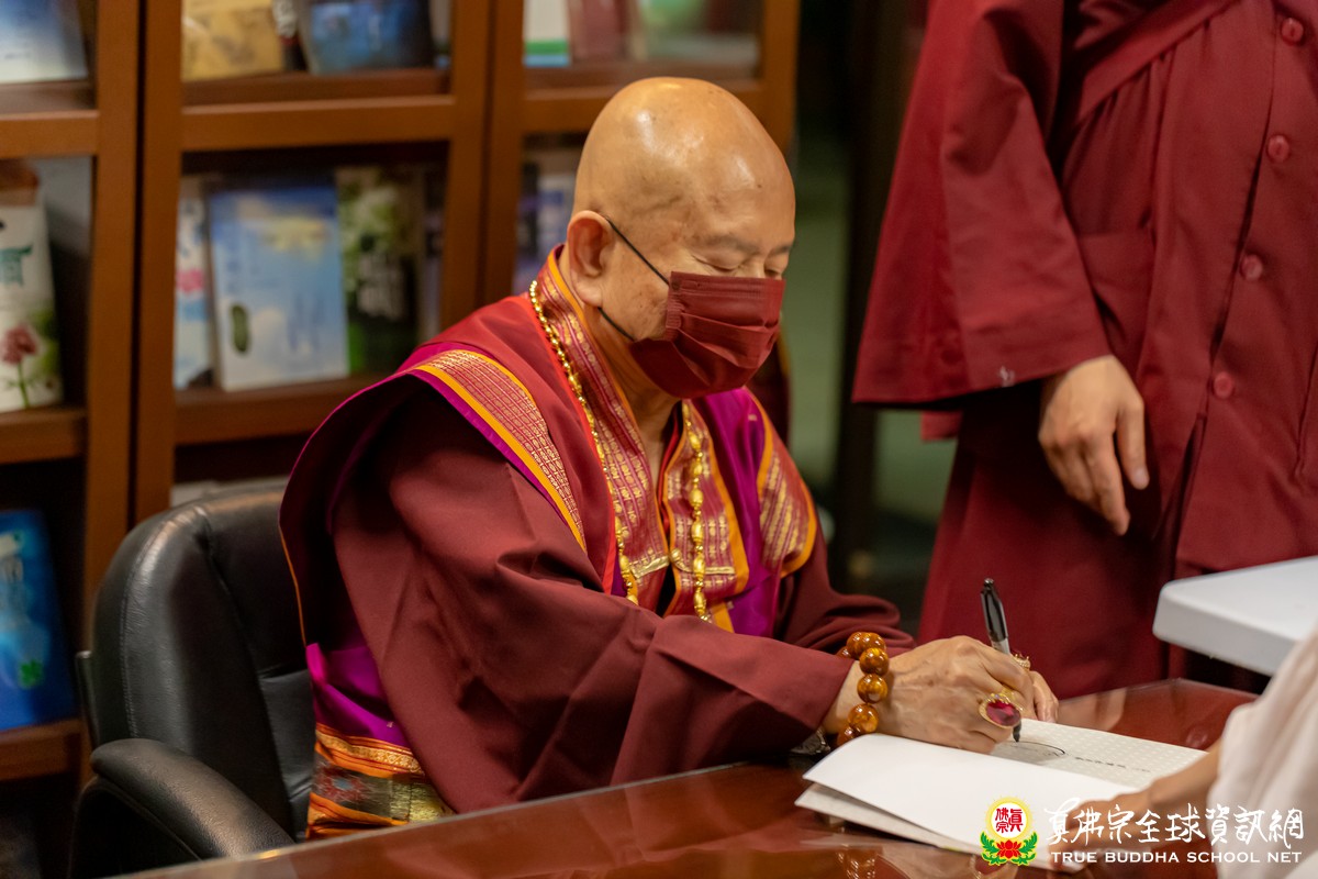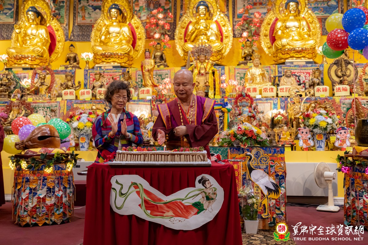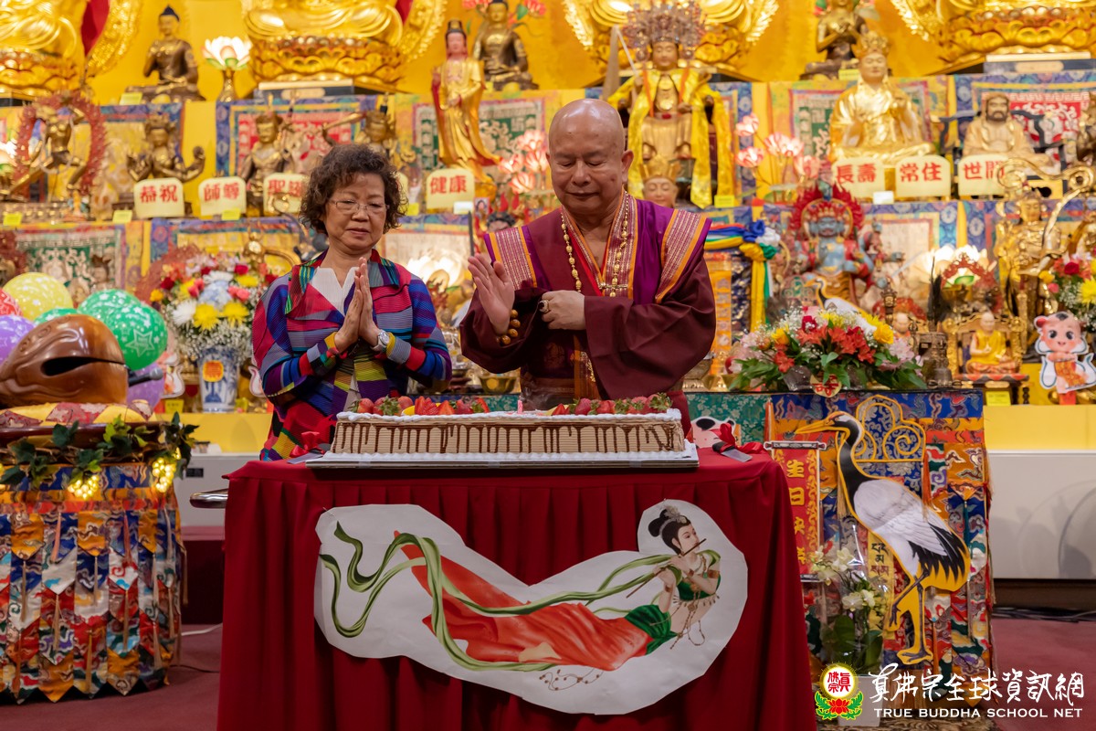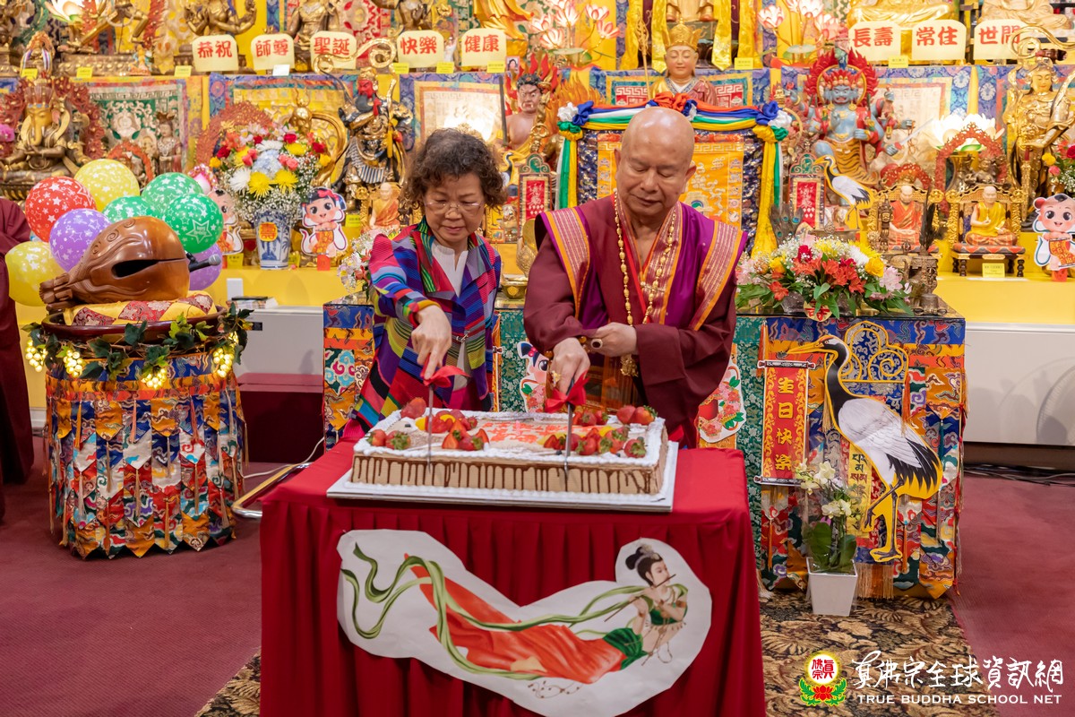 最後師尊講了幾則引申佛法的笑話,接著義工推出大蛋糕,與會大眾熱情唱著各種語言的生日歌,再恭請師尊許願吹蠟燭切蛋糕。雖然身體不適,慈悲的師尊仍然為了與會大眾用拂塵一一加持賜福,並為大衆一一簽書,師尊實在太慈悲了!最後每個人都得到壽桃與壽包,歡天喜地的滿載而歸,幸福滿滿!祈願師尊能佛體安康、長壽自在、永轉法輪!真佛密法永續不斷!感恩!再感恩!