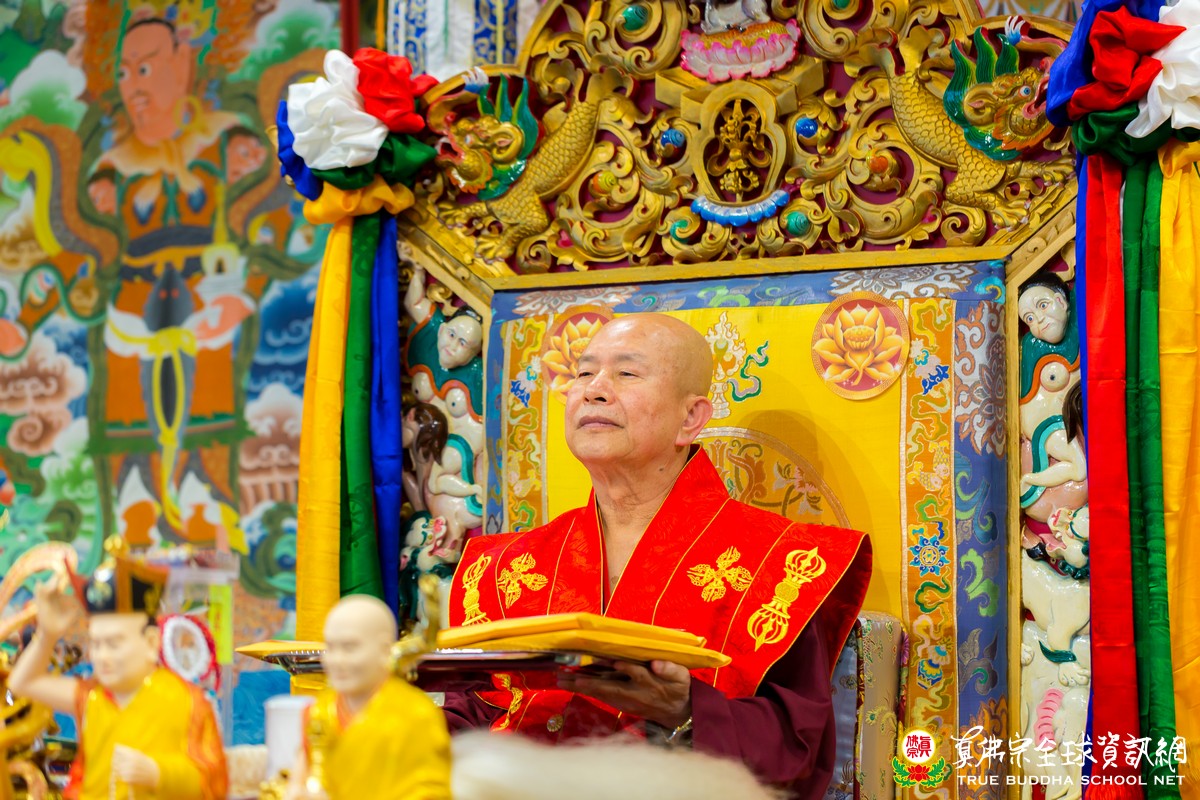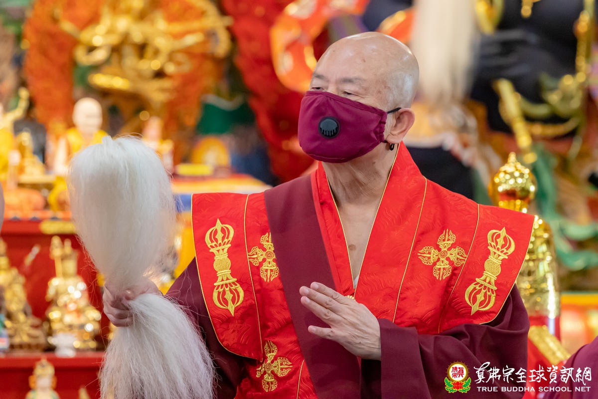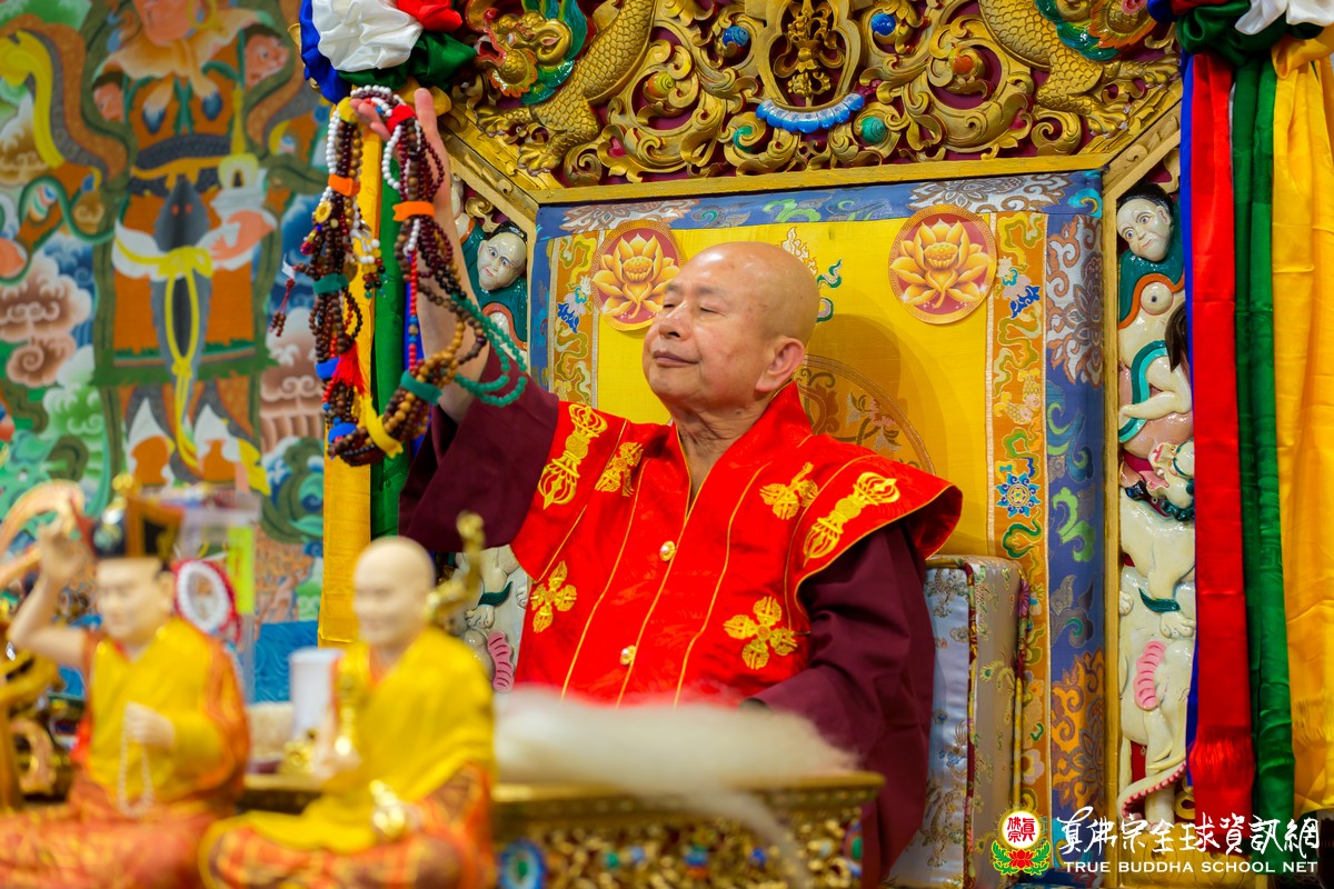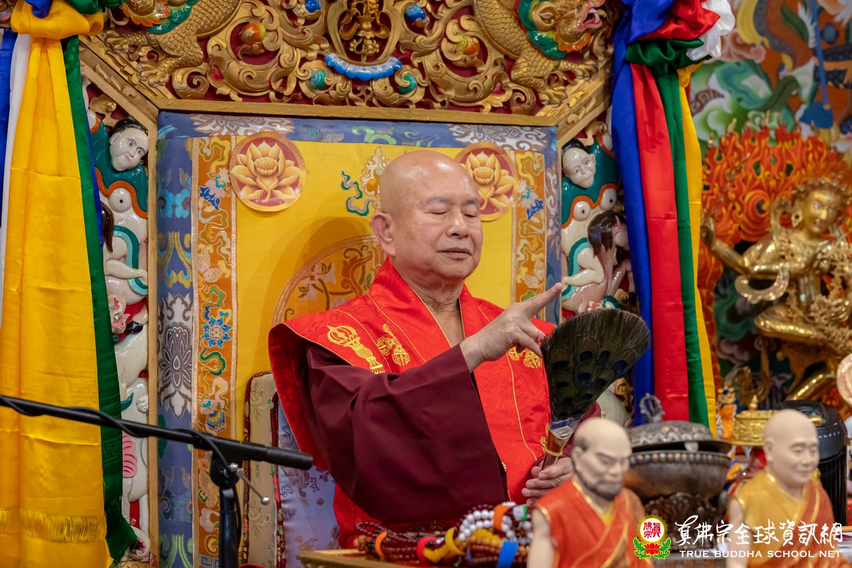 法王也表示,主祈今日紅財神的有福了!因爲當法王將金剛杵置於紅財神之頭頂時,紅財神必然吐出法財,包括正財、法財、偏財。法王說,真佛宗是中獎宗,並列舉了許多中獎的弟子。法王也祝福大家中獎!