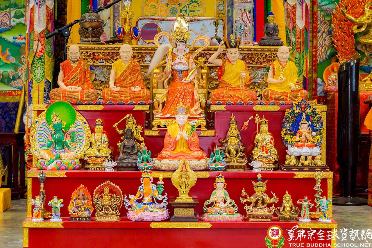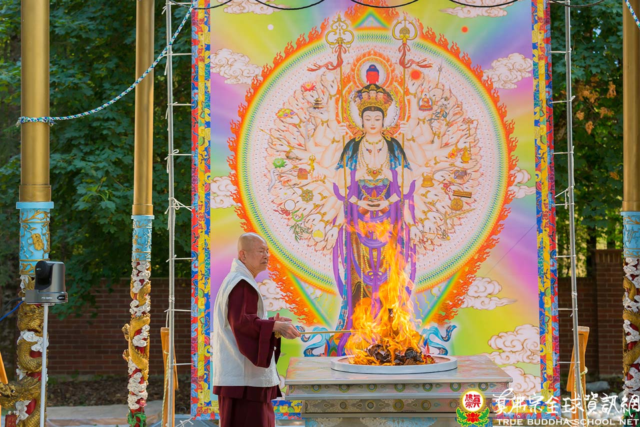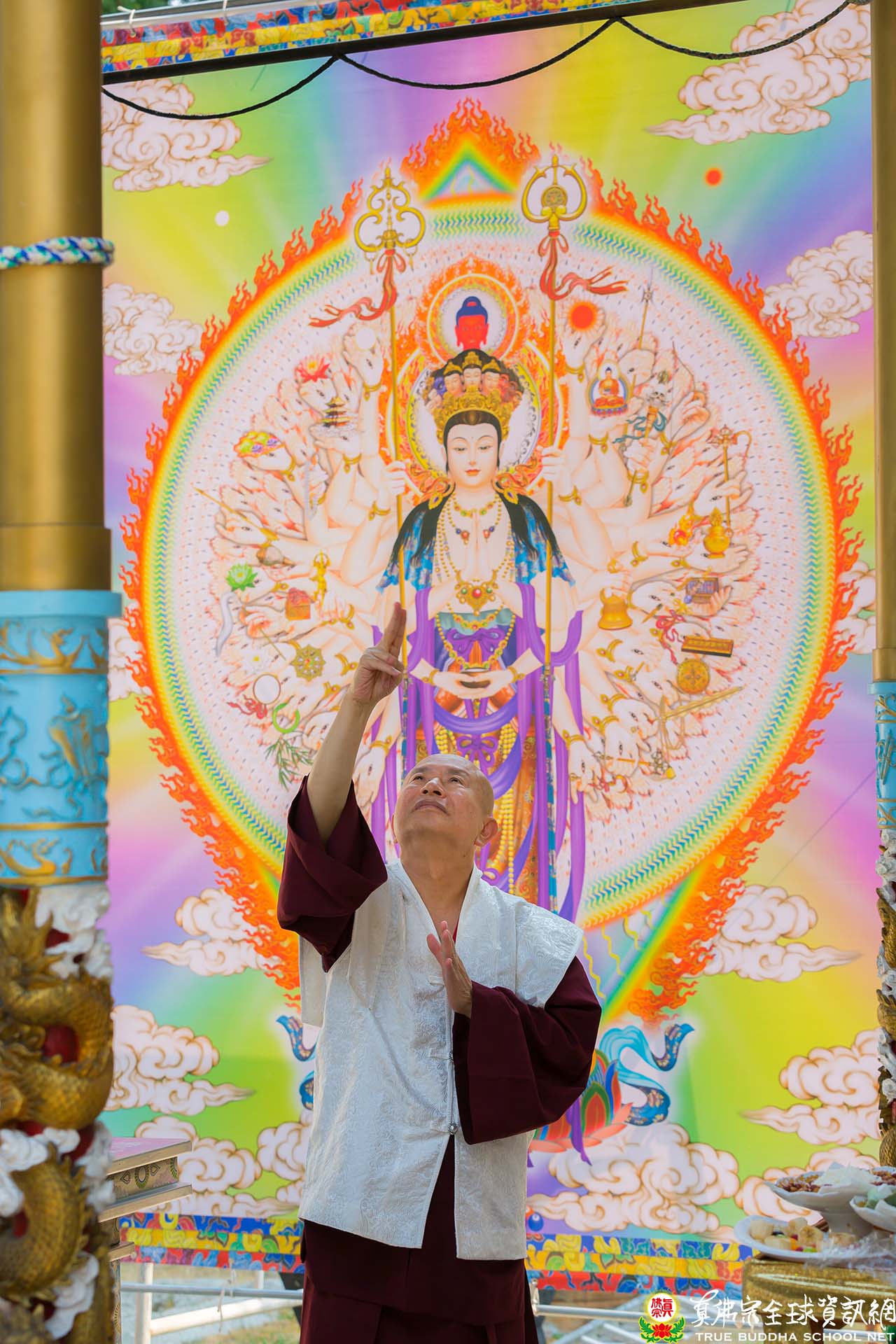 隨後,法王演示了護摩主尊的兩個手印。千手千眼觀世音菩薩也稱十一面觀音,象征著十一地。這十一面也代表著五部,最上頭頂的阿彌陀佛是佛部,當中是代表寶部、蓮華部、金剛部、羯摩部,因此被譽為五部論主。法王提及在顯教中十地以上已是佛,千手千眼觀世音菩薩已達十一地,又稱正法明如來。在這次的護摩中,法王感覺靈力非常充沛,眾人聞之更歡喜鼓掌。接著,法王開示千手千眼觀世音菩薩聚集了息增懷誅修持法,其法力具足,是非常偉大的觀世音菩薩。