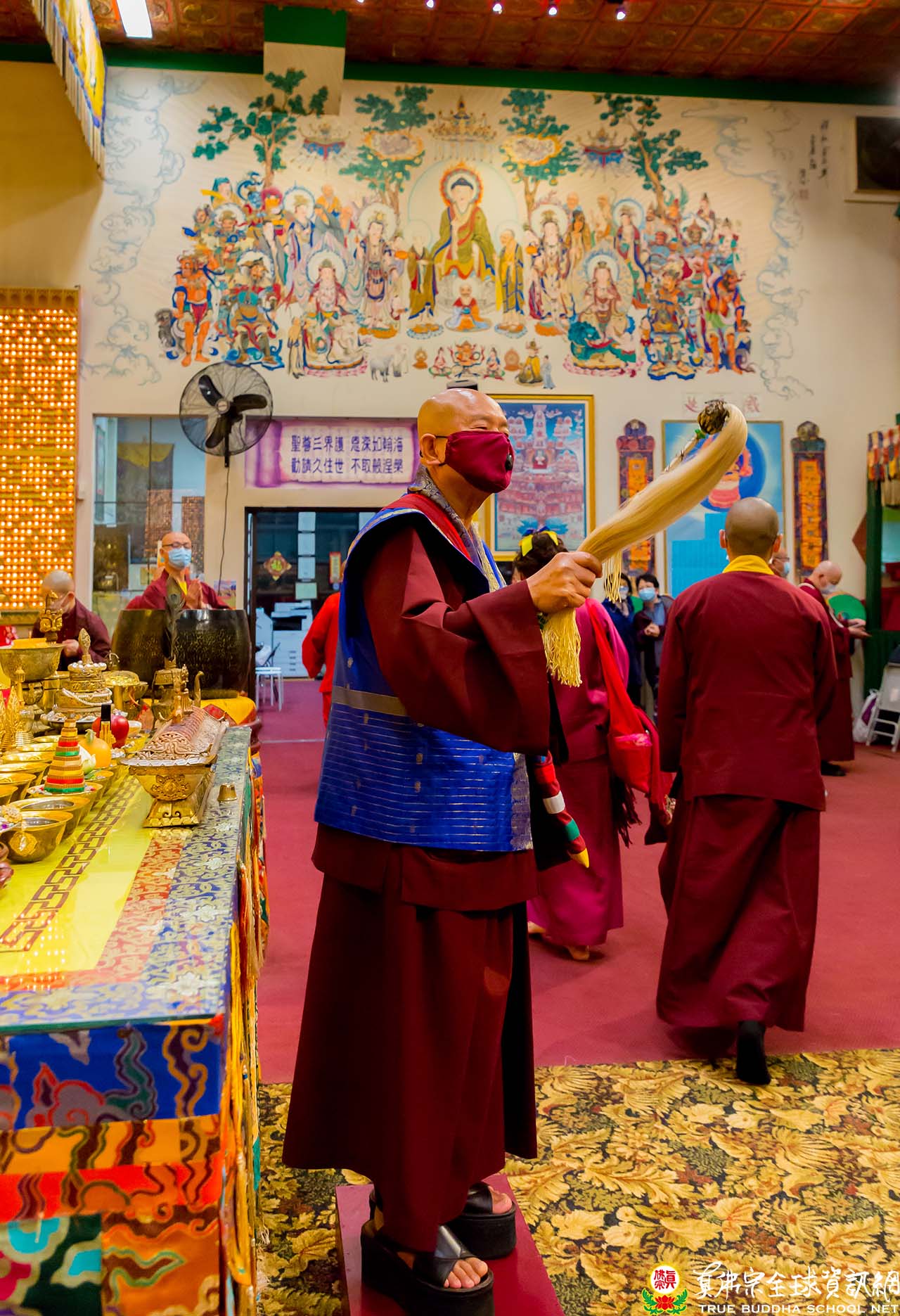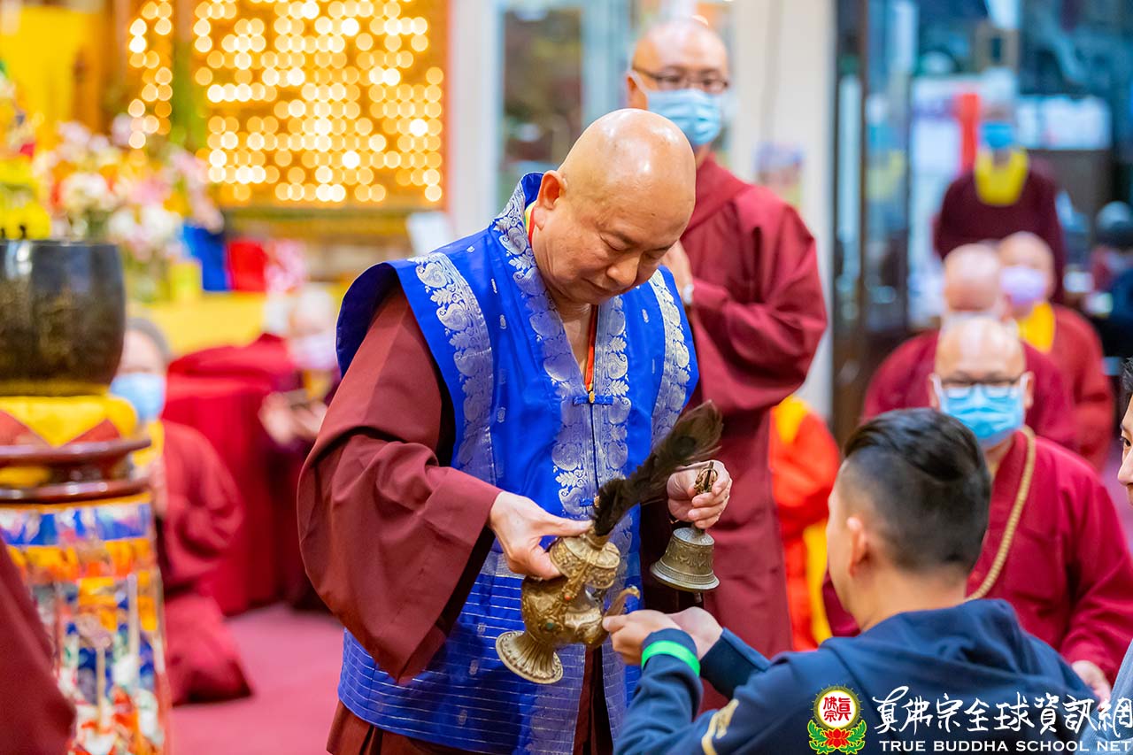 是日,從外地遠道而來的同門都遵守防疫守則,都戴上口罩及示別手環,陸續進入大雄寶殿坐下等候師尊的蒞臨。八時整,磬聲響起,在蓮花童子的咒音下大衆恭迎師尊。