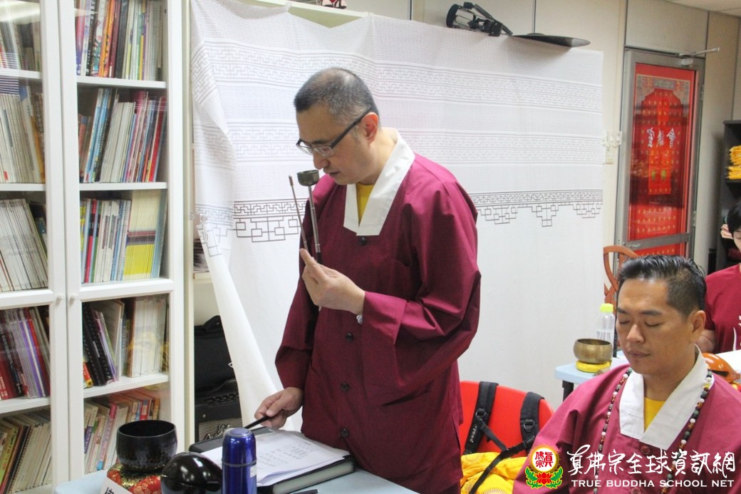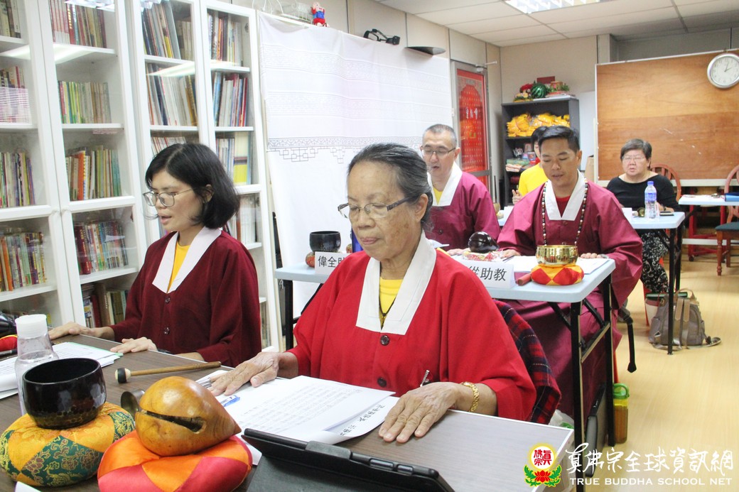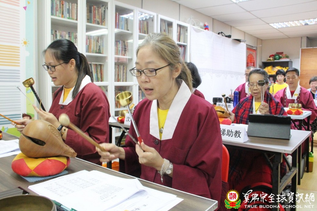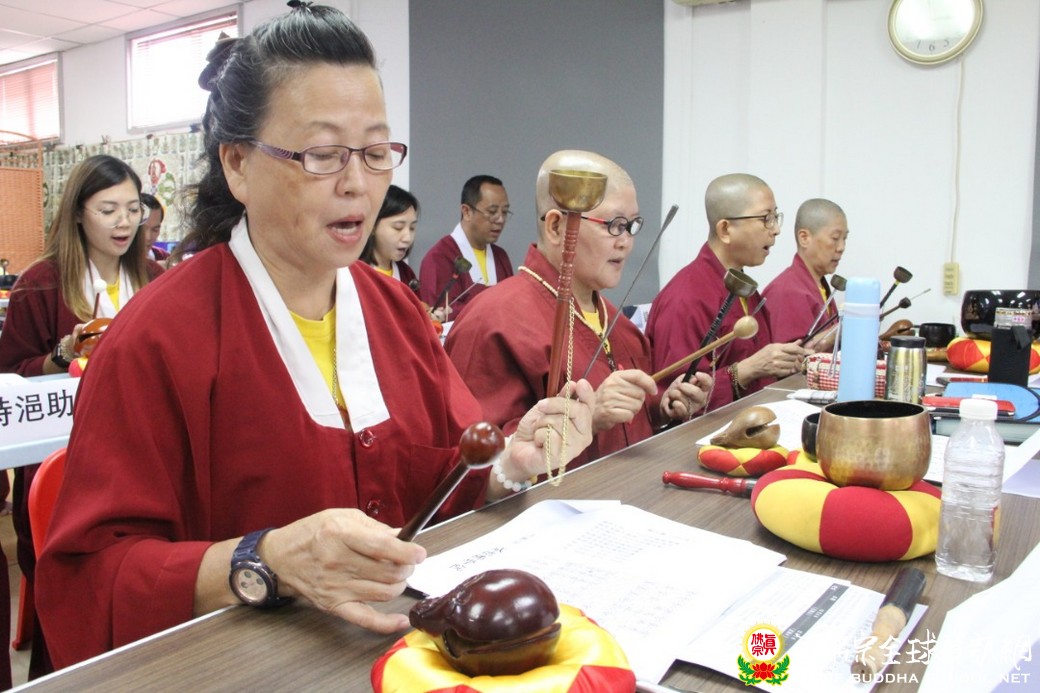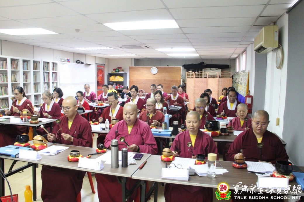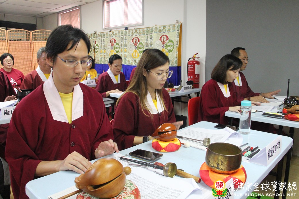 午餐時間結束。下午1時30分,上師繼續教導學員們學習唱誦與法器使用。尤其是教導大家如何正確的跟著節拍唱誦佛前大供與地藏王菩薩聖號(焰口:二音轉六音)。在上師的緊盯下,每個學員輪流唱誦起音。