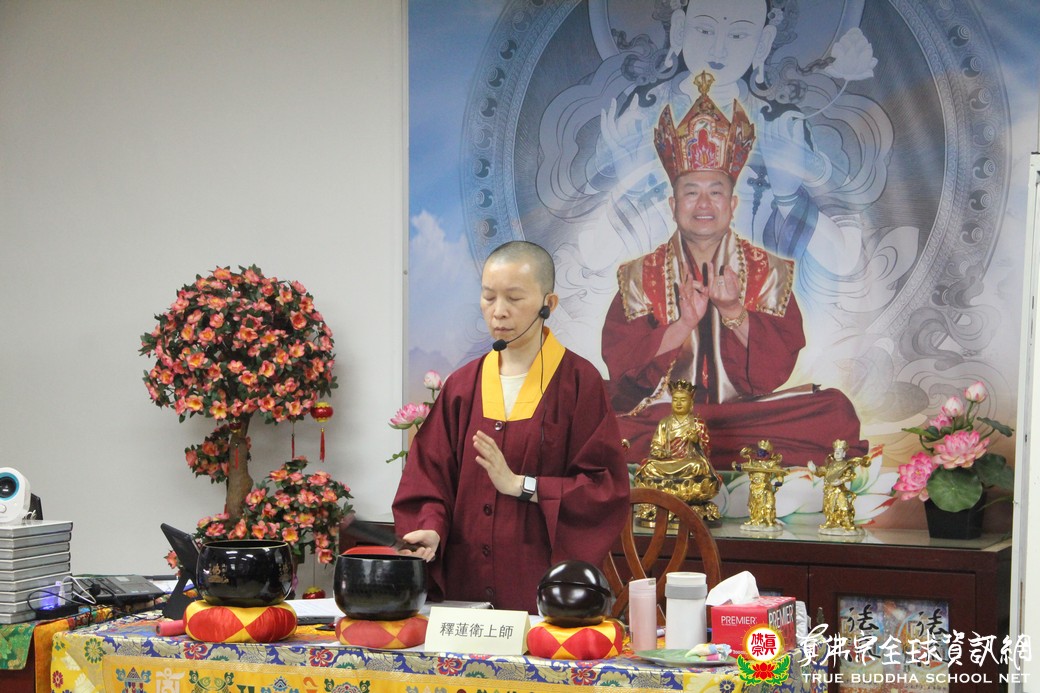 午餐時間結束。下午1時30分,上師繼續與大家分享如何帶領同修及法會儀軌的要點。上師在這個環節亦特別的播放根本上師親口念誦的咒音音檔(修法儀軌),旨在教導大家如何正確的發音與念誦[往生咒]、[觀空咒]、[八大本尊心咒]、[百字明咒]等。