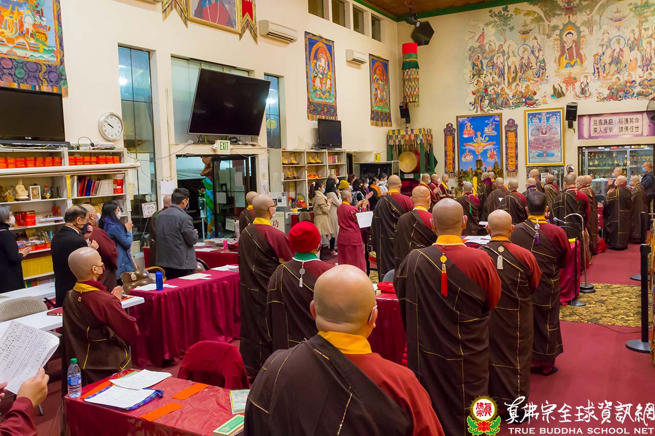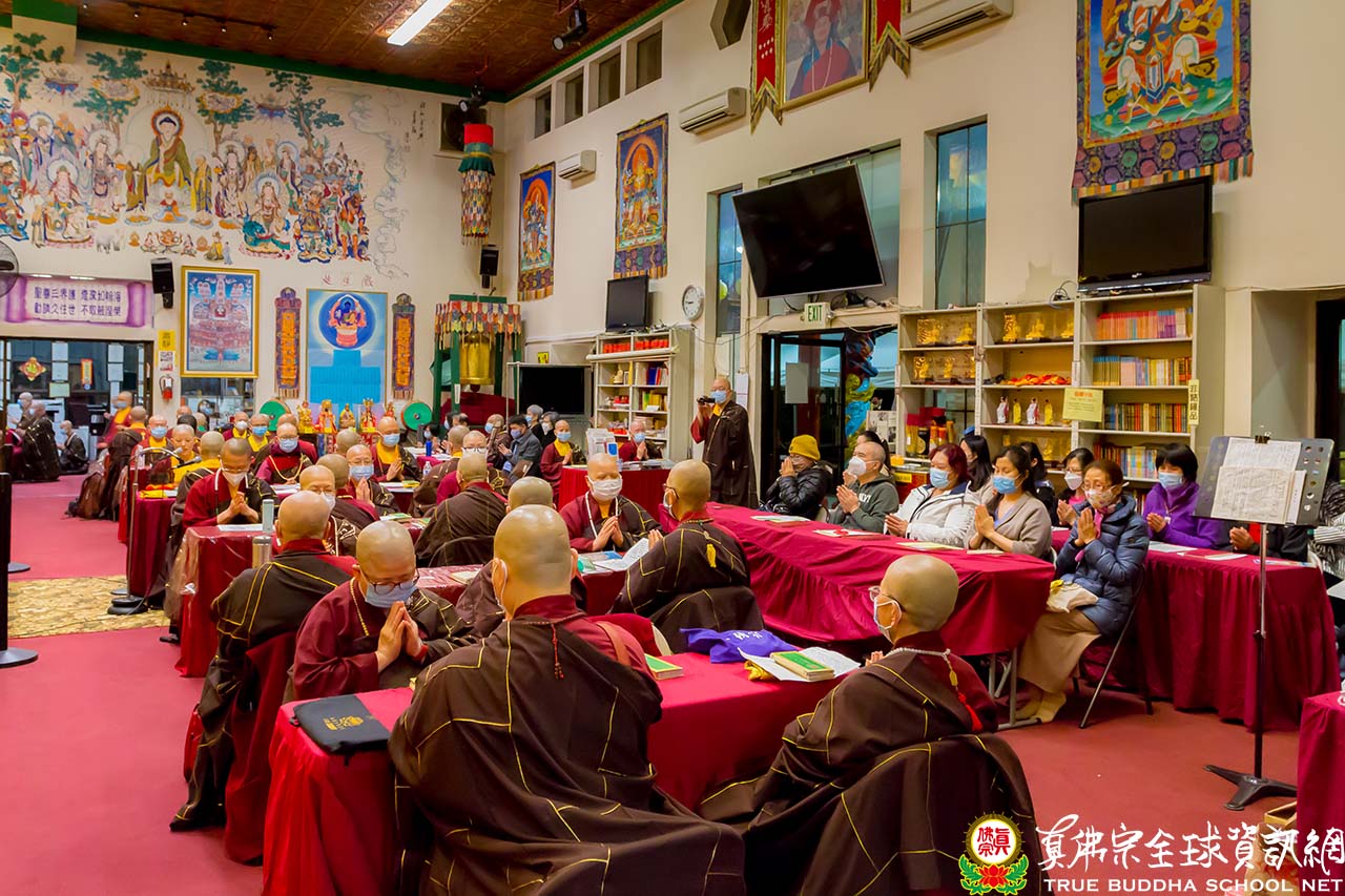 本次前來參加白事誦經的弘法人員及同門約近百人。白事誦經是由彩虹雷藏寺住持釋蓮彥上師擔任維那帶領大家唱誦。莊嚴肅穆的梵唄響起,以近五十位僧眾誦經超度的功德力及所有參加同門的虔心迴向,希望蓮印上師得到根本上師的超渡接引,能離苦得樂、蓮品增上。