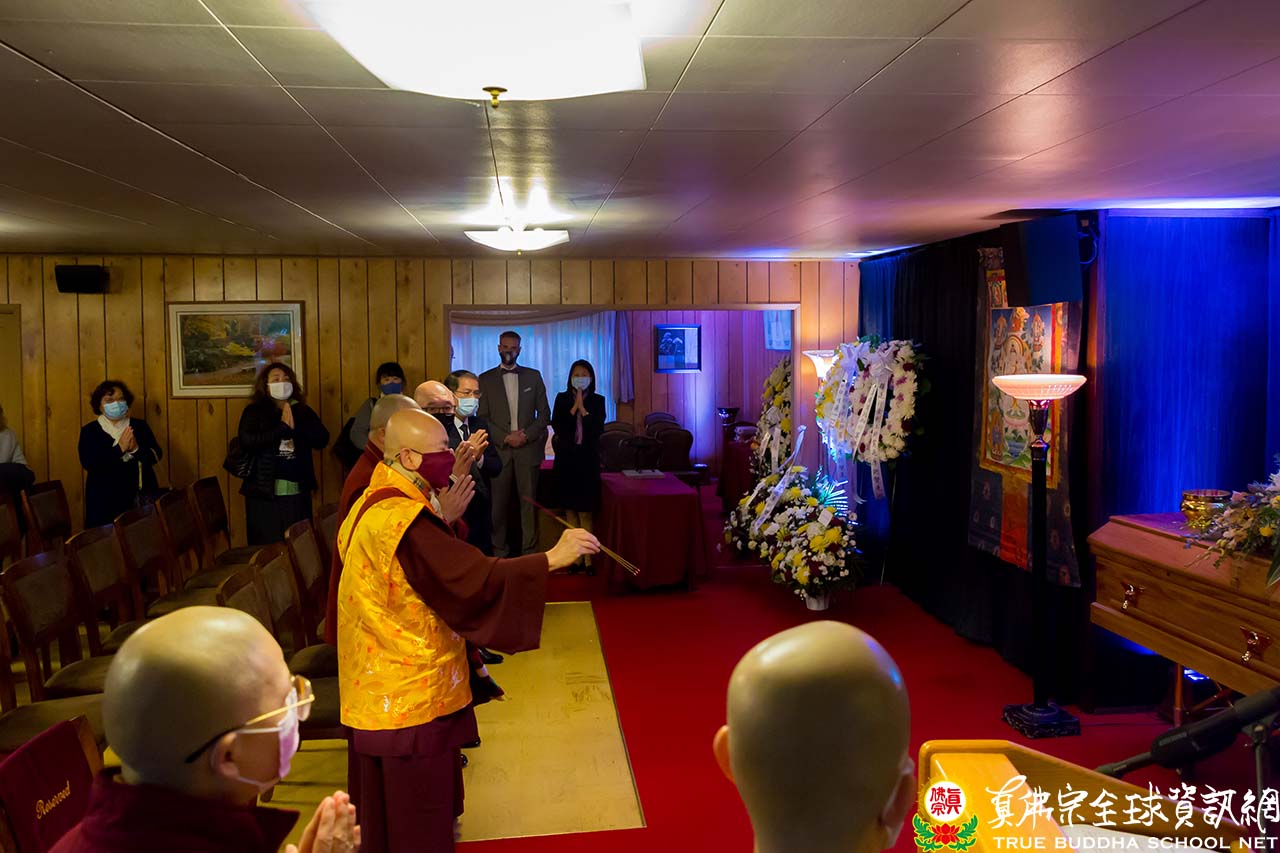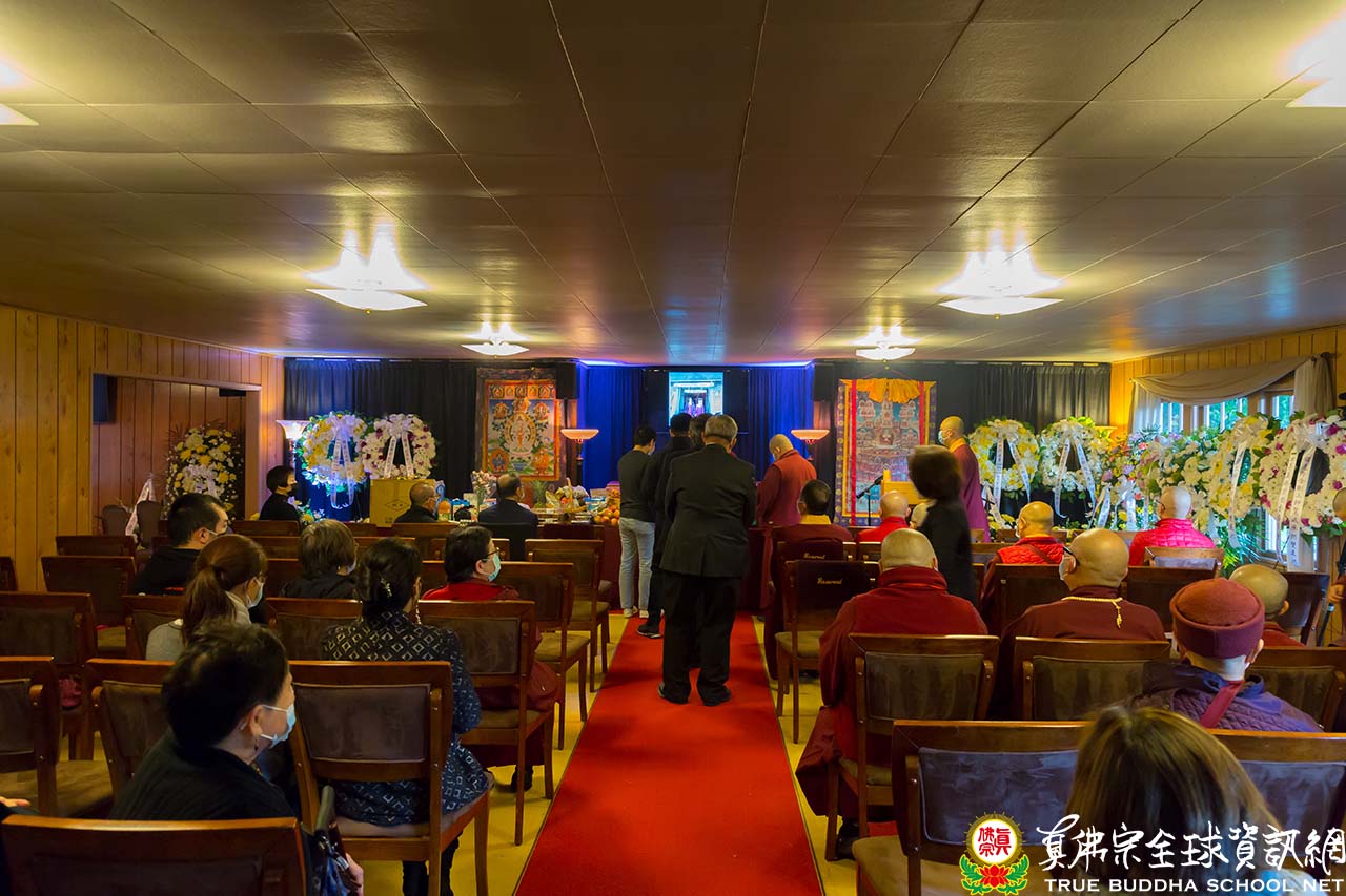 彩虹雷藏寺於Flintoft's Funeral Home and Crematory殯儀館,為釋蓮印上師舉行肅穆莊嚴的荼毗儀式。下午五點左右,許多位上師、法師及同門紛紛抵達靈堂會場,現場的氣氛平和寧靜。在儀式開始前,會場首先播放了一段蓮印上師生平的影片,有蓮印上師剃度的留影、有聖尊為他灌頂金剛阿闍梨的歷史畫面,有無數張蓮印上師在迎師時為聖尊蓮生活撐起華蓋隨侍在旁的照片。半生的過程,從少壯到老,匆匆數十寒暑,一生轉眼即過。影片裡的回憶畫面,讓現場的參加者對蓮印上師都有無限的懷念。