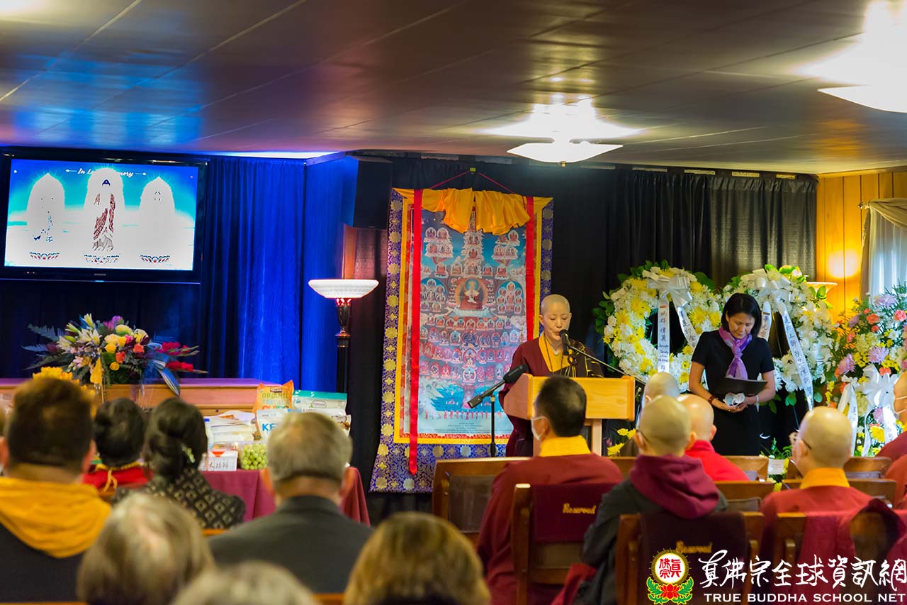 彩虹雷藏寺住持釋蓮彥上師在儀式開始前致詞,他提到聖尊蓮生活佛常舉廣欽老和尚圓寂前留下的一句千古名言:「無來、無去、無代誌!」這七字真言一語道破了「生與死」給凡夫俗子帶來的恐懼、無明、茫然、顛倒。師佛教導眾生有明清的智慧去超越「生死」的斷見。生死不過是軀殼四大假合的流轉而已,不論在何種境界,只是換了一個身份修行而已。不論禪律淨密,佛弟子都應迴向淨土、了生脫死。