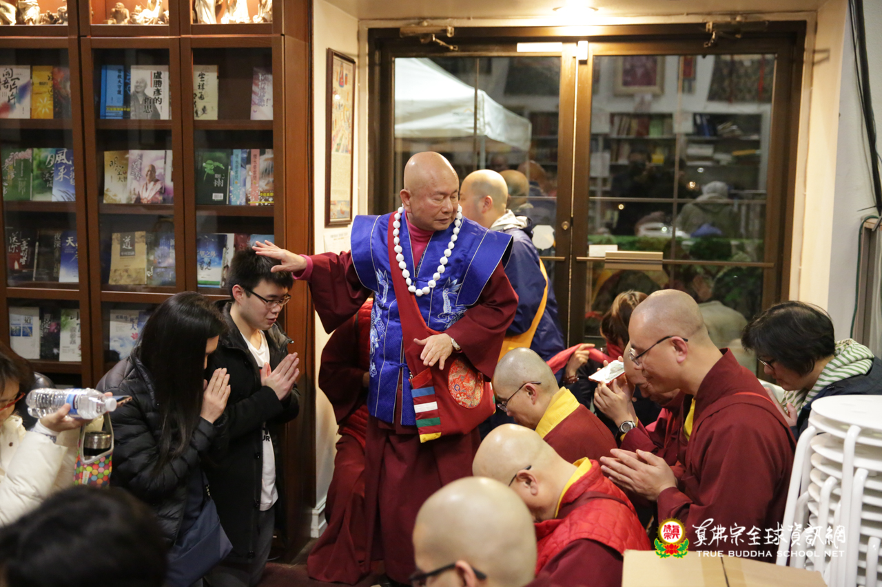 開示結束後,聖尊為大眾賜授皈依灌頂、加持大悲咒水和開光佛像,臨行前還慈悲一一為每位善信摩頂加持所求如願。步出廟外,迎著細細的雨絲,與聖尊走在同一個夜空下,呼吸同樣的空氣,感覺清淨美好的幸福,一心頂禮大恩根本傳承上師。