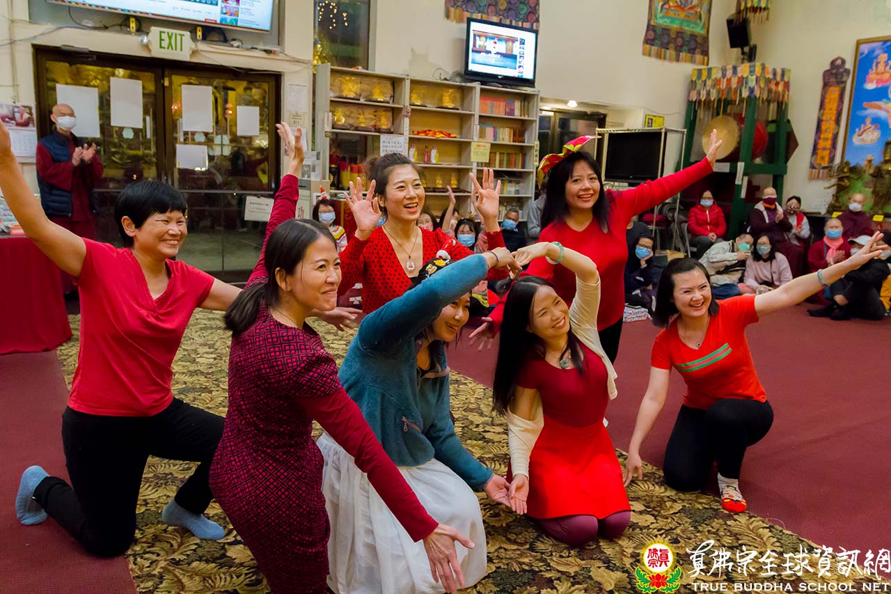接下來就是師兄師姐表演,他們個個熱情洋溢的載歌載舞,兩位主持上師蓮彥上師、蓮喜上師也一起加入帶動歡樂節奏,大家都好快樂開懷!最後主持上師恭請師佛為大眾高歌一曲「家鄉」,婉轉悠揚,現場掌聲如雷,太好聽了!
