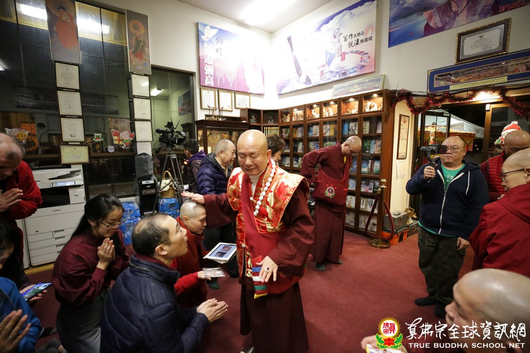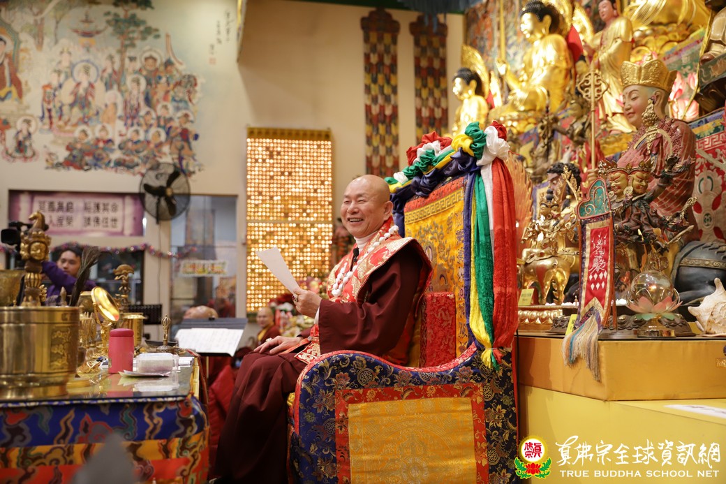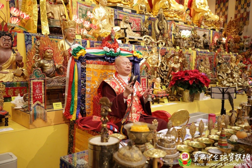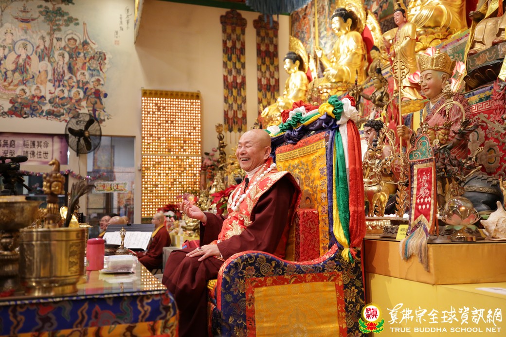 本周六祖廟同修的是阿彌陀佛本尊法。在莊嚴圓滿的修法結束後,聖尊首先談到一則讓大家雀躍的真實感應。聖尊談到祂在11月10日主壇彩虹雷藏寺黃財神護摩時,曾於開示中談到吐寶鼠在虛空中吐出四袋的鈔票,當時聖尊就預言一定會有人中獎。聖尊說道,真佛宗是中獎宗,在過去有好多的弟子中過美國的大樂透、台灣的威力彩,或其他國家如新加坡、馬來西亞等,都有人中大獎。