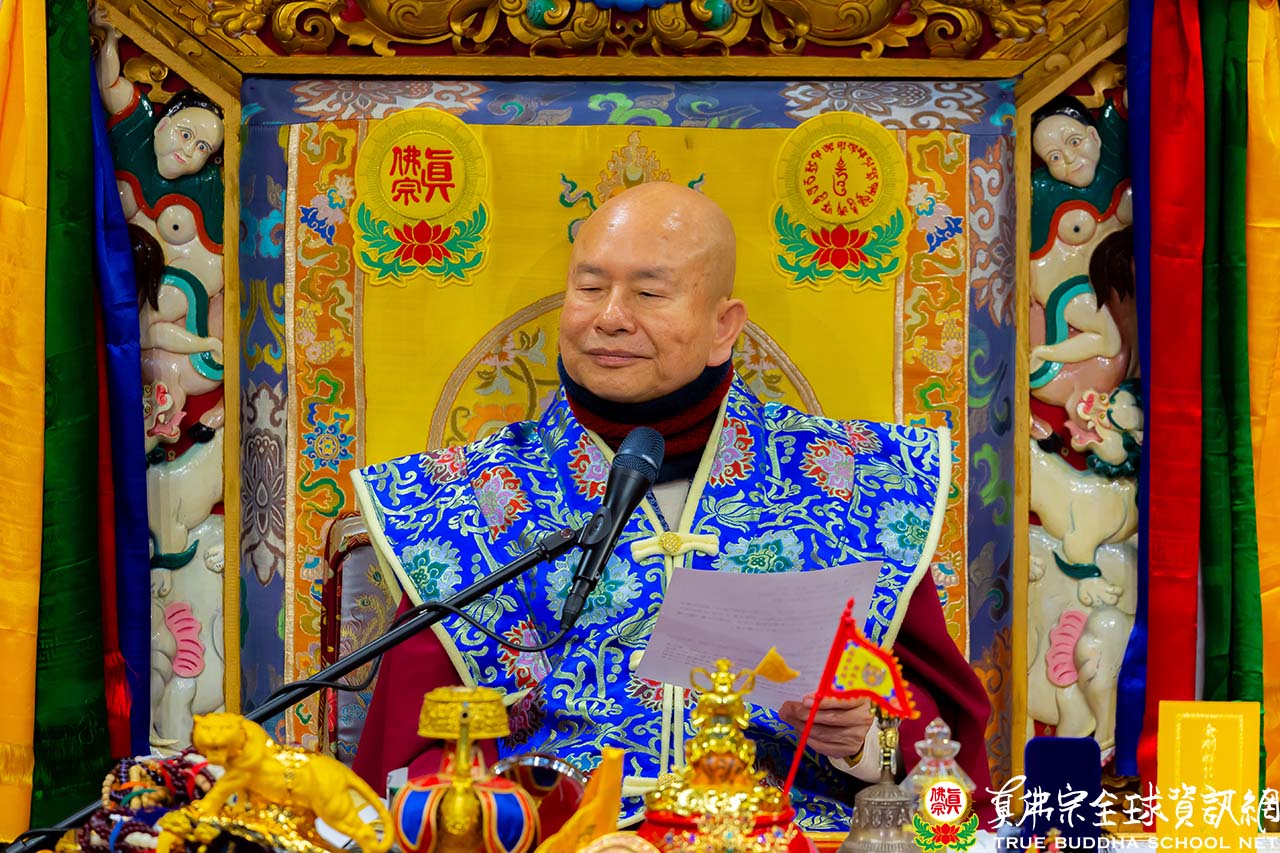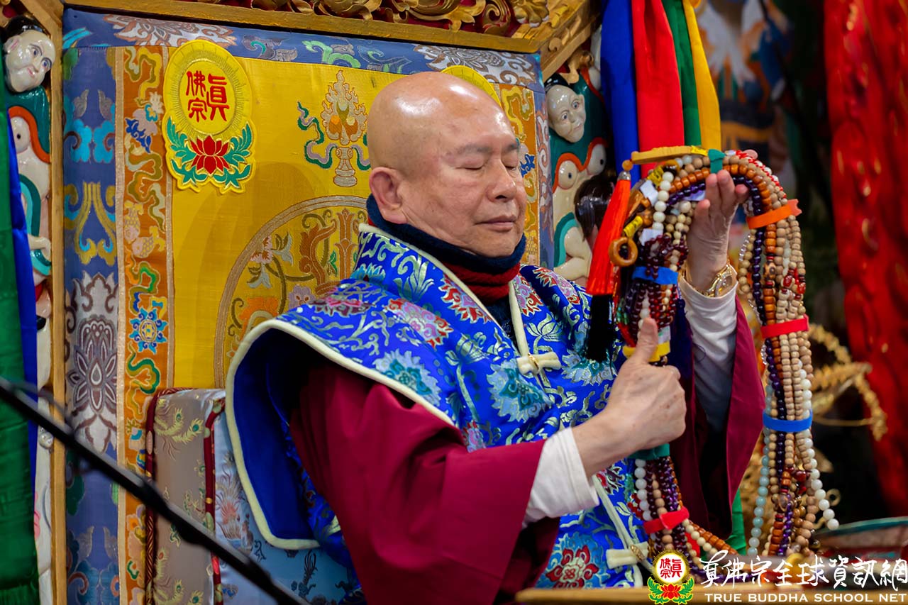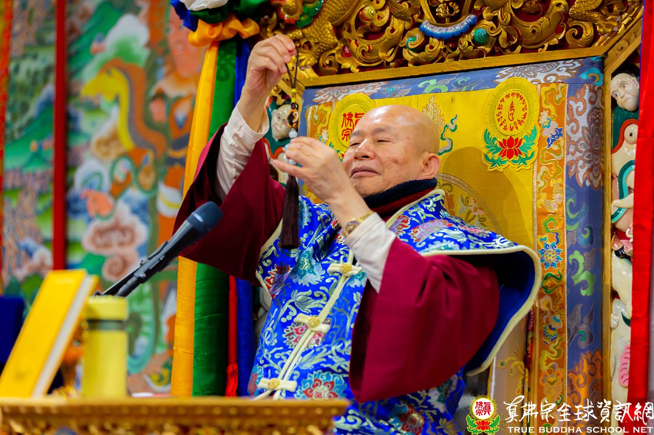 接著,法王講解虎年的吉祥物——虎頭金剛。法王親誦虎頭金剛的咒音「嗡。金母。悉地。吽。吽。呸。」,強調咒中的「呸」字雖沒在金剛經中提到,但帶有「斷掉」的意思,可斷掉一切煞及停止一切念頭,如真佛經中提到「以無念為正覺佛寶」。而【地藏經】更提到「南閻浮提眾生,舉止動念,無不是業,無不是罪」,意味著人的念頭就像瀑布與海浪,一波接一波,永不止息。尤其是靜坐時,可以感受到雜念不止。為什麼會有雜念呢?因為它從來沒有停止過,而「呸」就是停止一切念頭。只有達到無念時,宇宙意識的法流才能融合、相通,達到成就。法王祝福大家把不好的斷掉,而善的、財神到你家。
