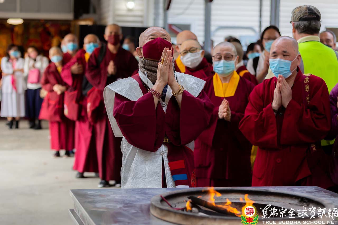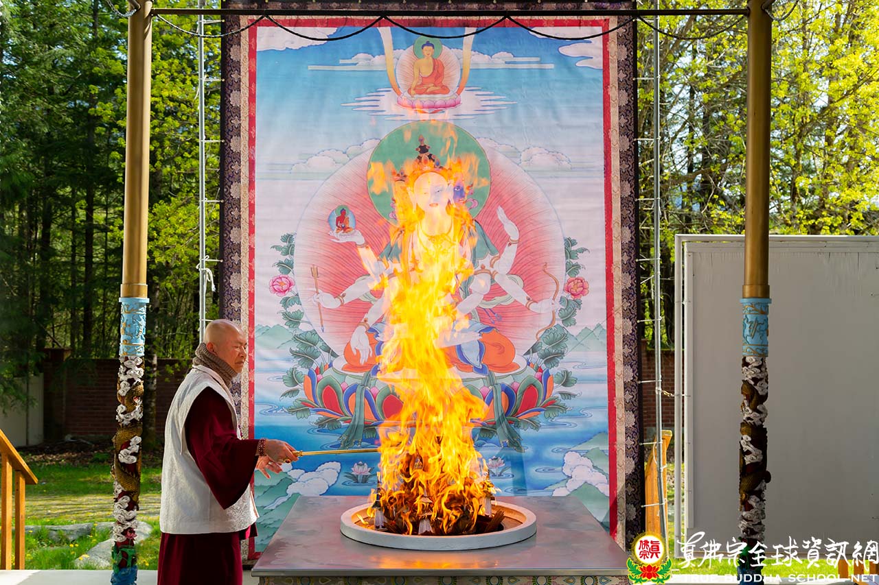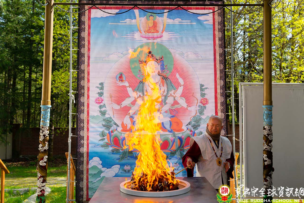 2022年4月24日下午三點,彩虹雷藏寺舉行了殊勝的尊胜佛母護摩法會。一個陽光明媚的下午,法王蓮生活佛身著白色龍袍出現在大眾的視野。頂禮壇城後,法王與Zoom線上的弟子們親切的打著招呼。護摩法會一如既往地莊嚴有力,熊熊的護摩火光明偏照,顯化著佛頂尊勝陀羅尼的大光明。