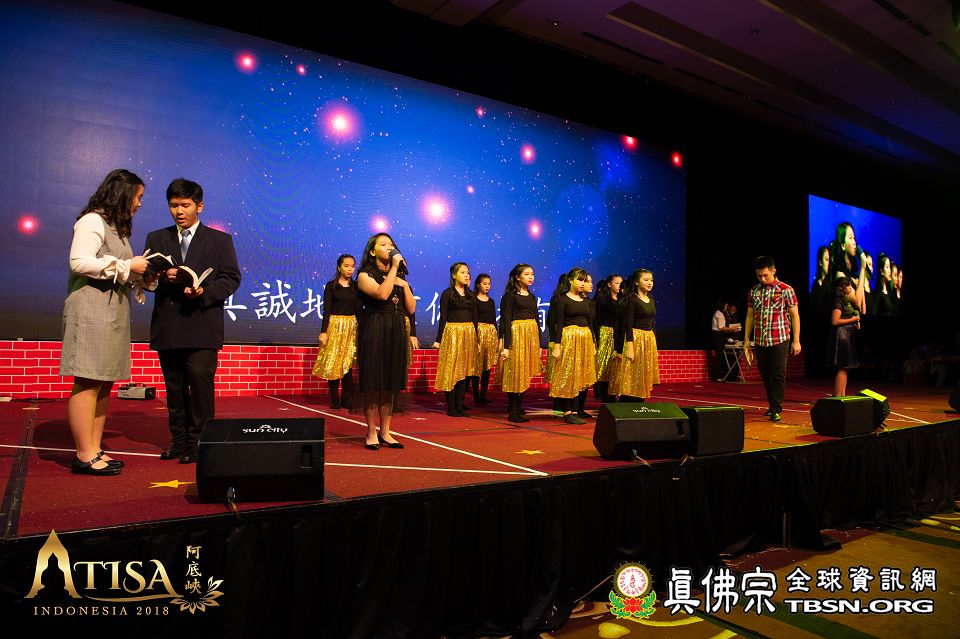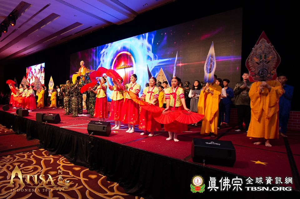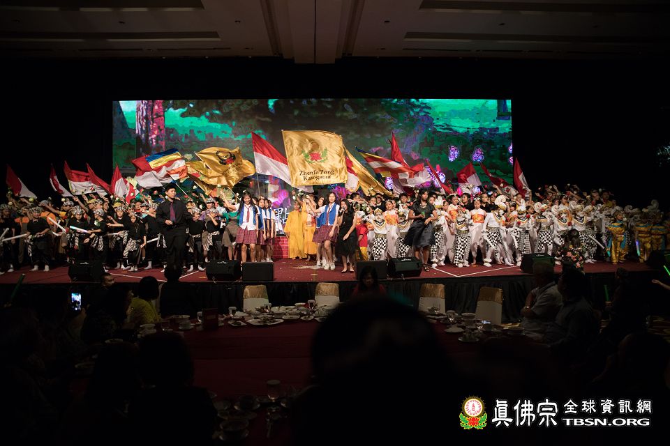 最後,聖尊應邀致詞,聖尊感謝今天晚上的主辦單位、也感謝華光印尼敬德學校。聖尊稱讚他們唱歌都非常好聽,並表示佛教學校在印尼能夠成功,真是不容易。聖尊希望這所學校的精神能夠發揚全世界。聖尊覺得敬德學校的學生人人精神煥發、充滿朝氣,他今天晚上看到這一幕,非常感動。最後,聖尊再次謝謝華光印尼敬德學校,其校長與老師承辦此學校,非常好。