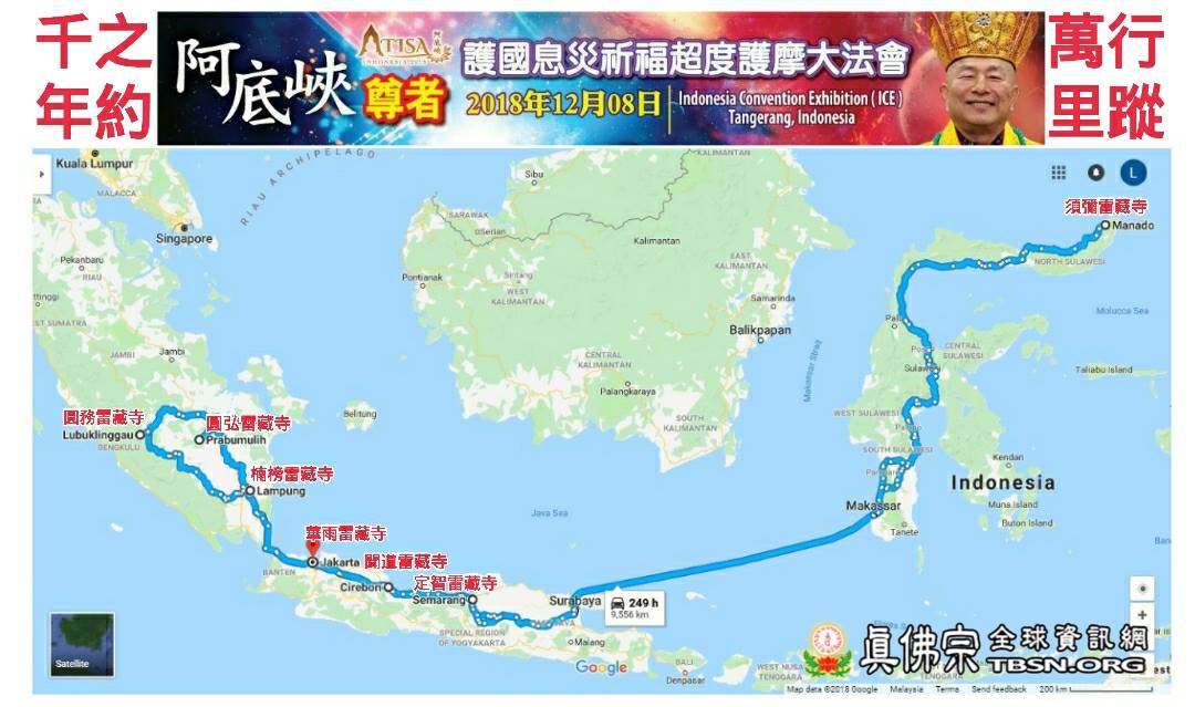 應宗委會和印尼密教總協會及印尼密教總會的請法下,蓮生法王將於2018年12月8日於印尼,主壇阿底峽尊者大法會,法王將與阿底峽尊者再度合一,無二無別,以此無比殊勝功德力,傳授「阿底峽尊者本尊法」及「菩提道炬論」,並賜授灌頂,轉動大法輪,使千年的法脈傳承雋永不息。 聖尊此次印尼之行,不僅將在雅加達舉行大法會,更安排多日行程,為七座新成立的雷藏寺開光,與弟子們相聚,圓滿弟子們的期望。 此弘法行程橫跨印尼東西北三大島,全程有萬里之遙!千年之約,萬里行縱,蓮生法王將再次擊大法鼓,轉大法輪,圓滿菩提!