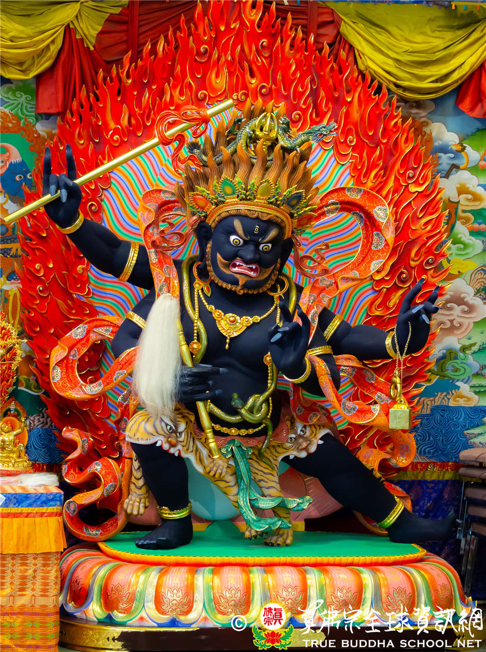 法王:「師尊平時修都大威德金剛及不動明王護法,身上也有大力金剛(藏身在法王的右手大姆指中,因其笑臉,又為笑面鬼王)。蓮花童子的忿怒尊就是大力金剛,原是地藏王菩薩的大力使者,因地藏菩薩囑付要隨蓮花童子度眾生,變成蓮花童子的侍者,當惡意的鬼眾來犯,護法就會現身降伏。」