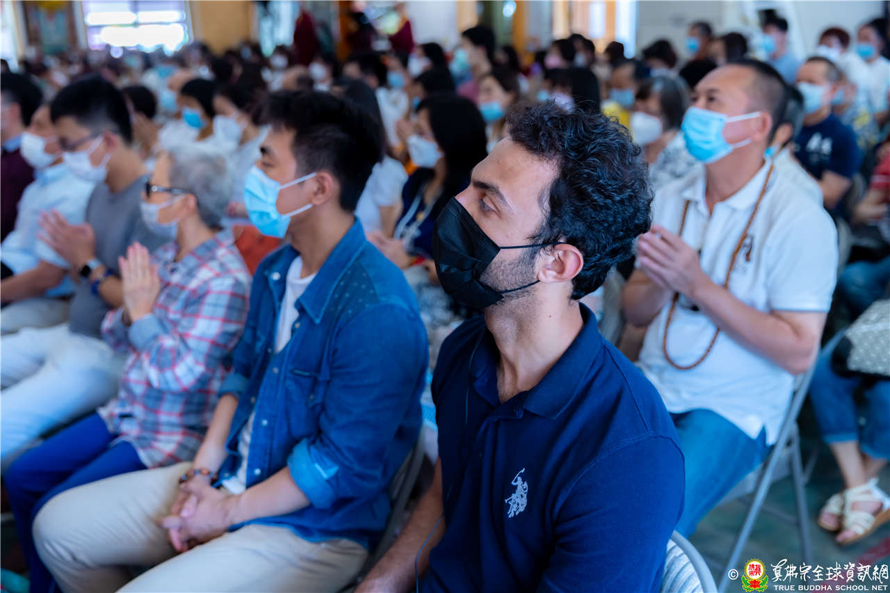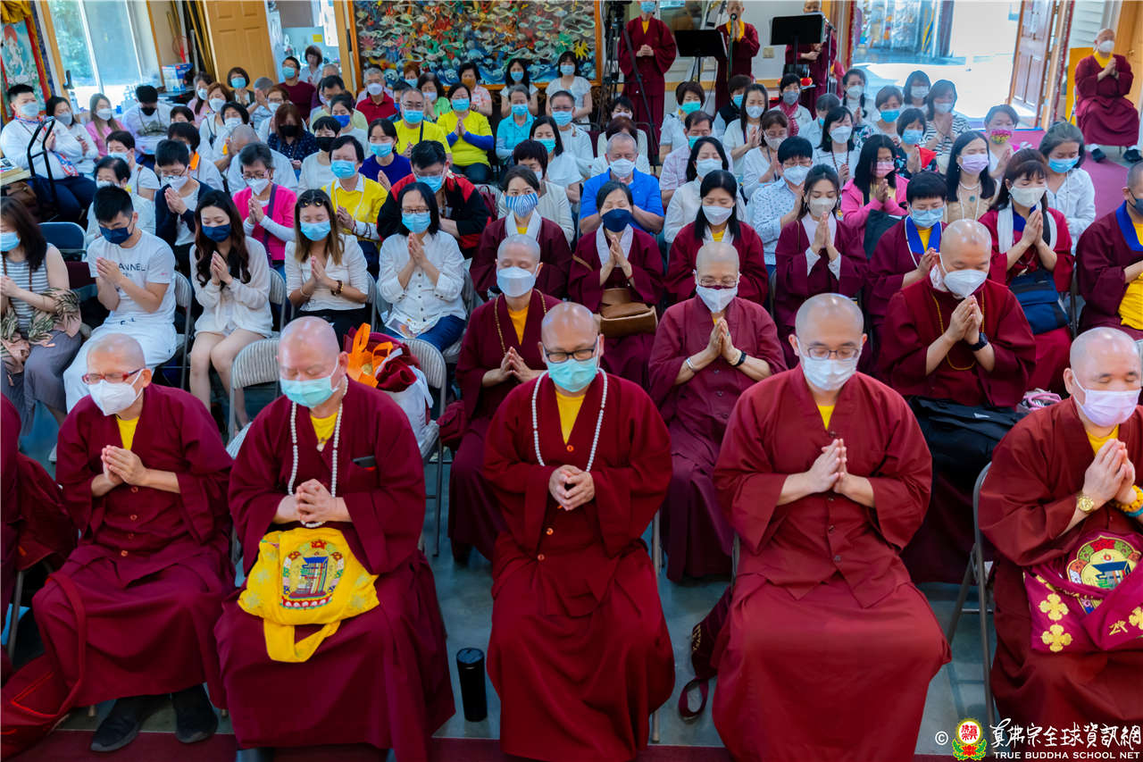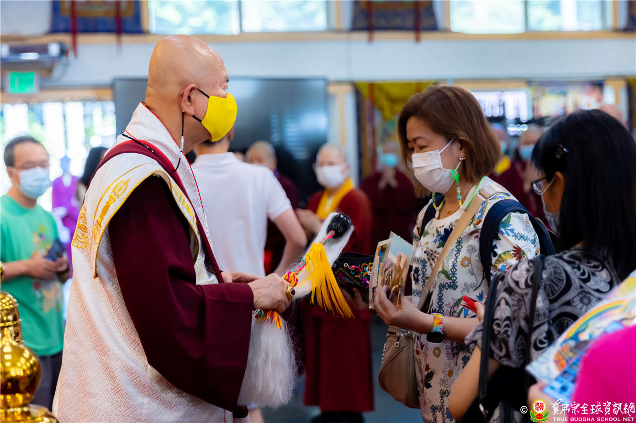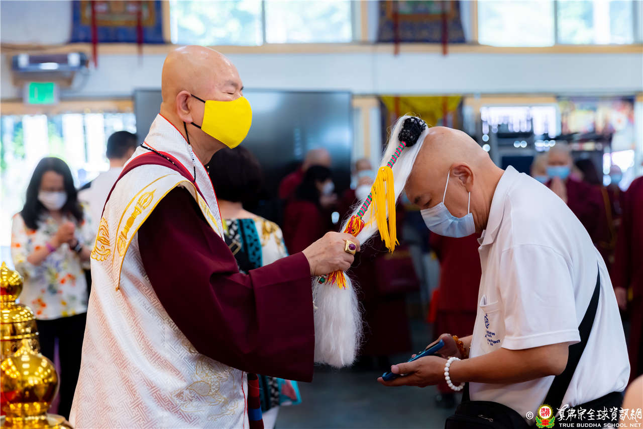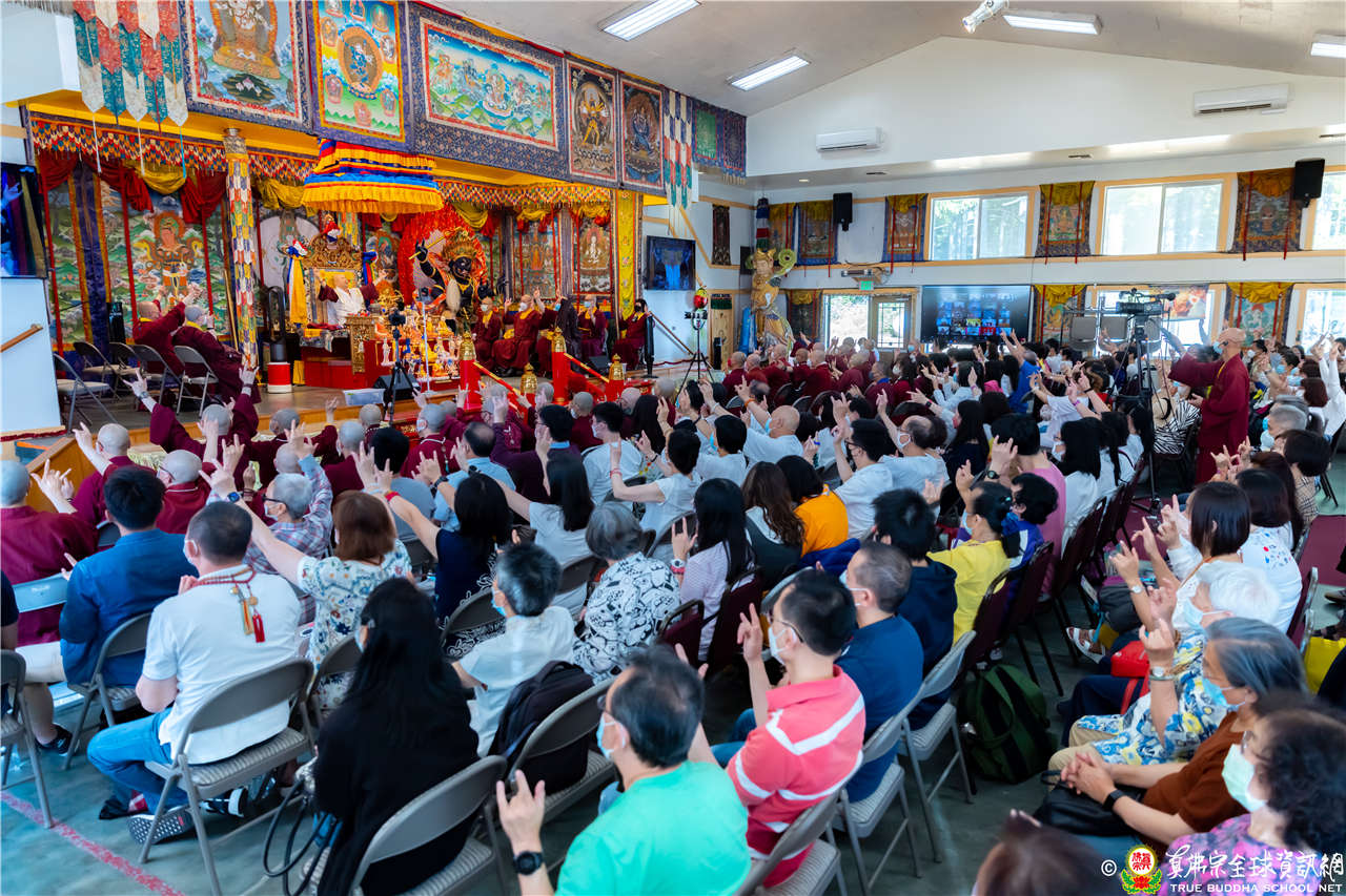 最後法王移駕到Zoom前與弟子們互動,弟子們誠摯地感恩法王開示,法王慈悲加持祝福現場及網路上所有弟子都能得到「不空羂索觀音」加持護佑,眾現場弟子接受法王的「不空羂索觀音」灌頂,法會圓滿結束。