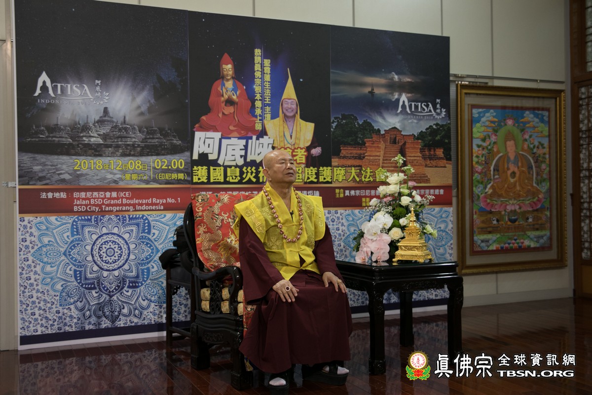12月1日上午,11時左右,法王抵達台灣雷藏寺接受印尼媒體及學者的採訪,法王在受訪當中,談到此行印尼弘法的意義,法王告訴記者,「阿」字代表所有一切的佛跟菩薩,「底」字代表文殊師利菩薩,祂是屬於智慧,這「峽」字具有很大的威力,尊貴的、吉祥的燃燈佛,吉祥燃燈智的智慧也會遍佈在印尼,讓印尼本身的土地跟人民獲得很大的幸福,「這次去辦阿底峽尊者的大法會,希望在印尼的地方會非常的平和,也因為有阿底峽尊者的賜福,令印尼的人過得非常的幸福跟美滿的日子。女生參加的話,會變得非常的美麗,男生參加的話,也會變得非常的英俊,還有一點,祂具備兩種資糧,在物質上的資糧,會使國家變得更有錢,在心靈上的提升,會讓來參加的人跟當地的人,還有整個印尼人,心靈都會得到滿足,祂會賜福大家」。
