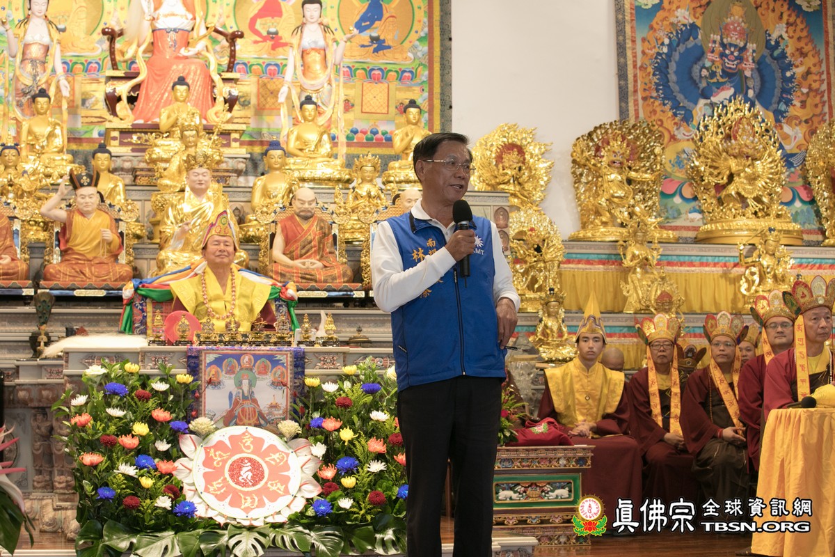 貴賓林明溱縣長剛順利當選連任,特來參加當日的法會,除了感謝法王的庇護加持,他表示台灣空氣的改善和經濟的復甦,是當務之急,「所有老百姓最希望的經濟能夠更好,大家都有錢賺,這是競選縣長的一個承諾,我相信這次以19萬票順利當選,繼續在師尊的庇祐之下,我一定要將南投縣做得更好,在未來4年,讓南投縣縣民的經濟收入更好,老百姓能夠過更快樂的日子」。
