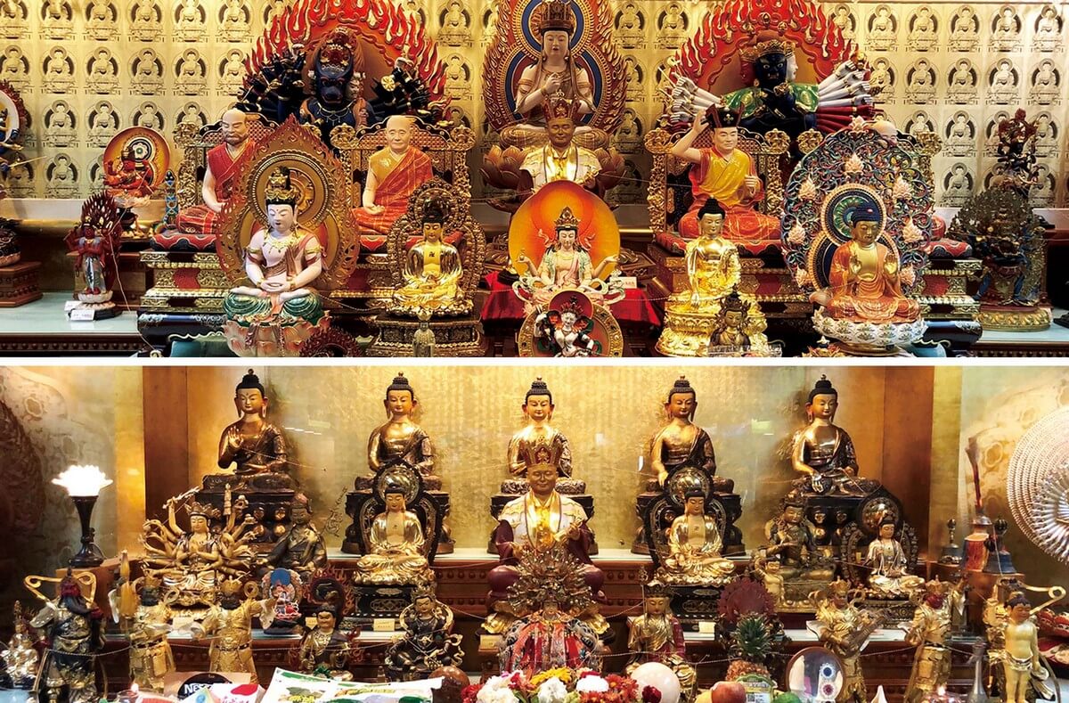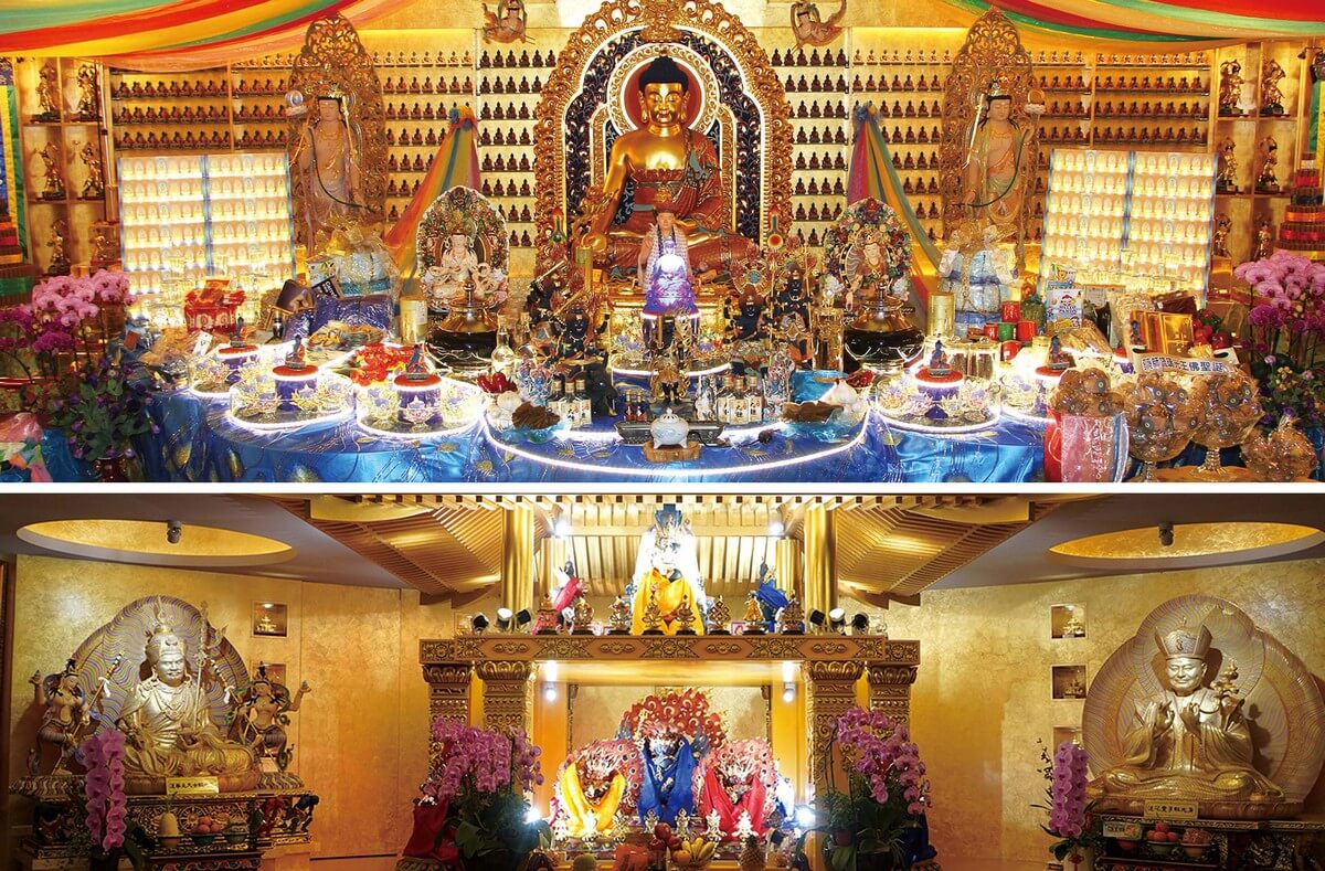 八樓則為「金剛明王殿」,十樓「崇勝殿」內有全台首座室內「大幻化網文武百尊曼陀羅」壇城,另外「慈尊者」乃以藥師佛為主尊。每個壇城都各具特色,不論是壇城的設計或弘法功能上,都有善巧的區隔與安排,用心以多元化的視角,全方位度眾。