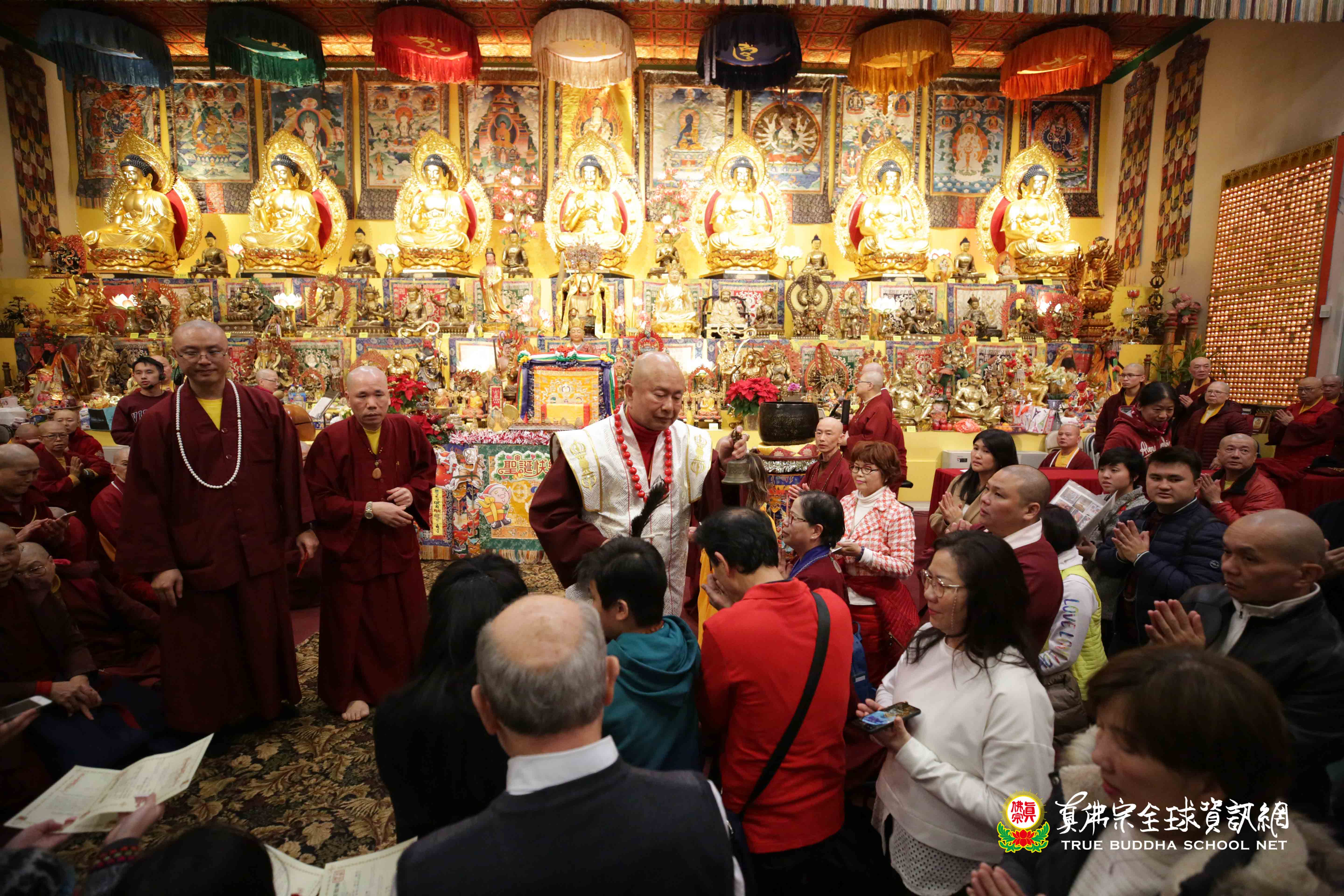 會後,師尊為求皈依的信眾賜授灌頂,並加持大悲咒水,以及開光佛像。臨行前還為雷藏寺裡所有的信眾一一摩頂加持滿願。感謝聖尊再次的法語教示,弟子深深明白,若修行要能有成就,一定要視師如佛才能得到佛的加持,行住坐臥皆不離根本上師,如此才能堅固屹立不動搖。一心頂禮大恩根本傳承上師。