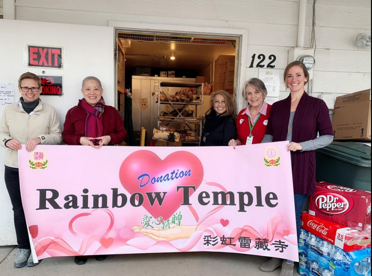 彩虹雷藏寺與社會互動方面,每次有法會後的供品,便會聯繫食物銀行,食物銀行的工作人員有完整的救助計畫,將這些經過佛菩薩加持的供品,分享給當地有需要的人們。