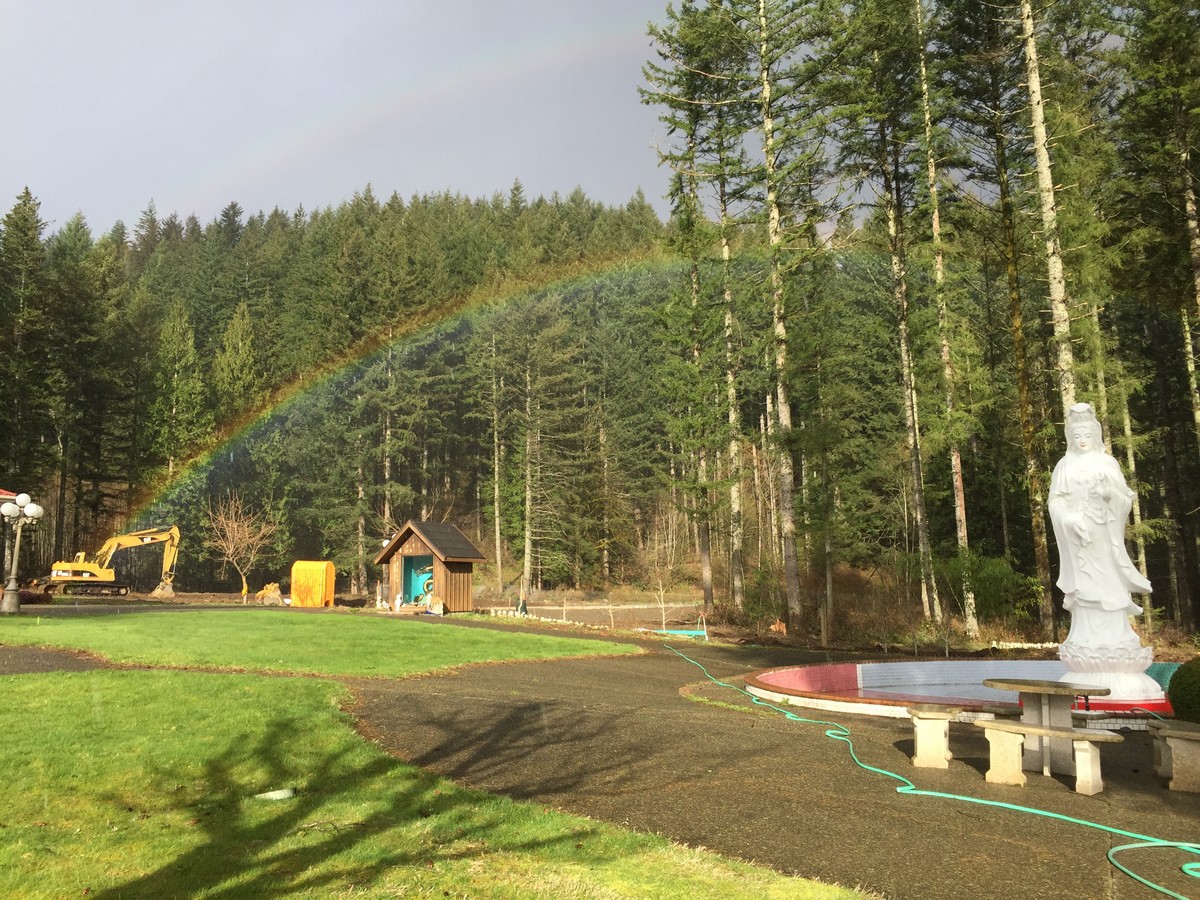 瑤池金母的夢示應驗了,於是大家乘著車追尋這天下第一大彩虹升起的地方,就是彩虹山莊所在地。根本上師初到該地時,該大地靈的一切山神土地護法,多數雲集在一起,都願作助緣,更有亥母賜予甘露妙味,諸佛菩薩降臨放光加持,可說虹光閃耀,花雨繽紛,天樂充滿,遍滿虛空,嘆未曾有。
