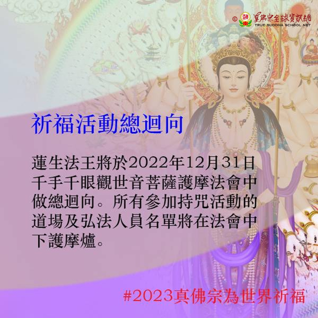 此活動將於30日晚上8點結壇。2022年12月31日,台灣雷藏寺千手千眼觀世音菩薩護摩法會上,宗委會恭請真佛宗根本傳承上師蓮生活佛為此祈福活動做總迴向,願觀世音菩薩聞聲救苦、千處祈求千處現,放大光明守護世界眾生!