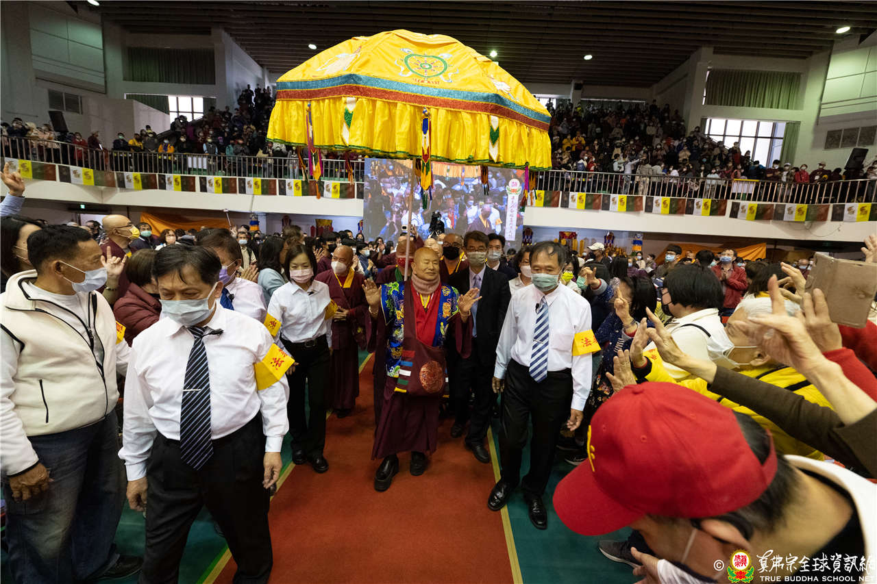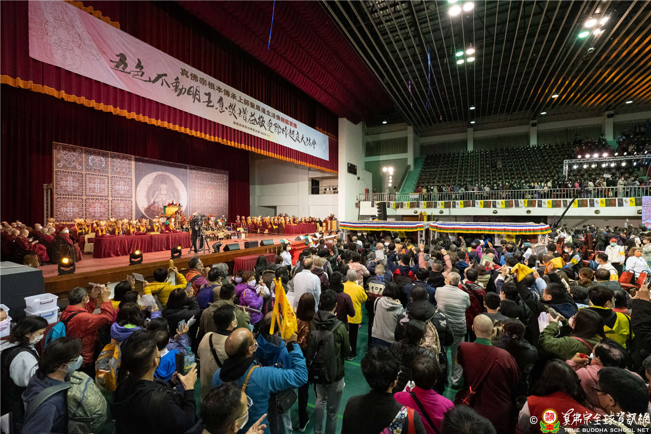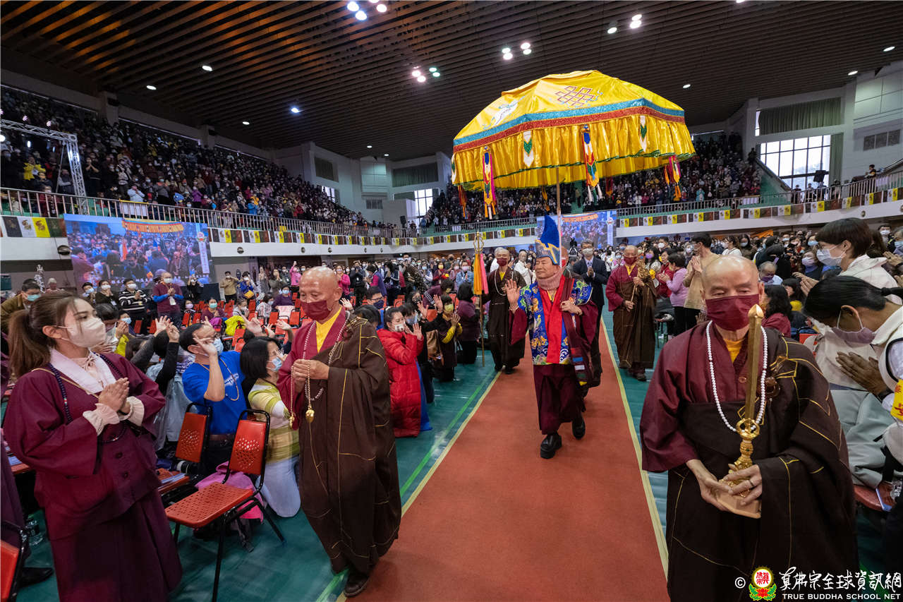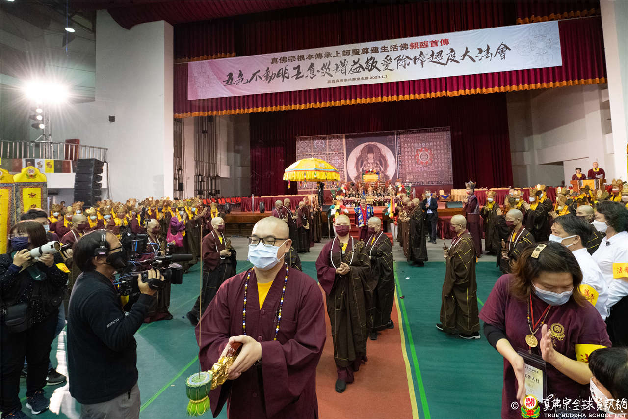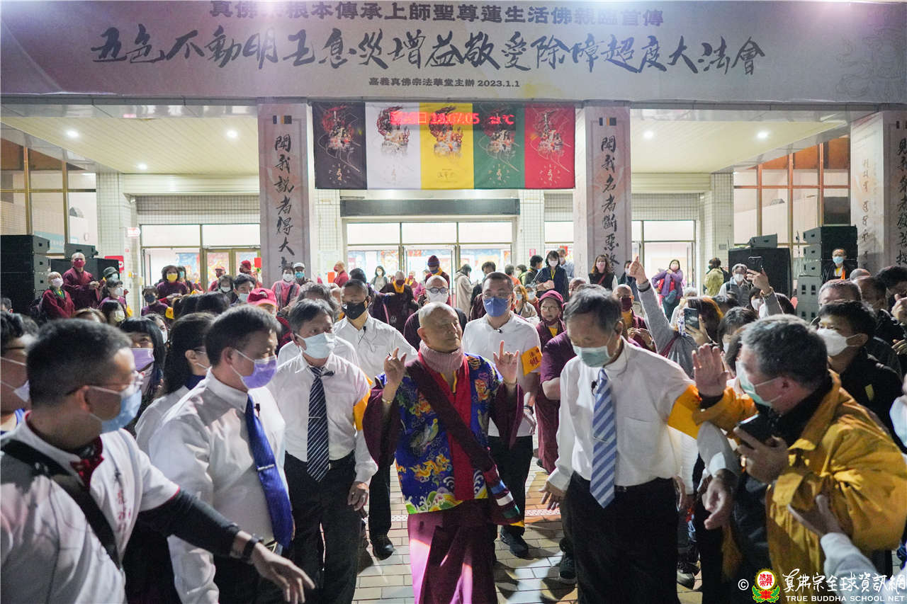 2023年元旦,人人歡喜迎接新一年的來臨。在這人人普慶的一天,台灣嘉義市真佛宗法華堂恭請蓮生法王到嘉義市立港坪運動中心體育館主持「五色不動明王息災增益敬愛除障超度大法會」,首傳「五色不動明王不共大法」。法會現場莊嚴殊勝,台上除了有巨幅的大日如來唐卡,更有金剛界曼荼羅及胎藏界曼荼法相圖。原來「不動明王」是八大明王首座,也是金胎兩部部主「大日如來」的變化身及教令輪。下午兩點,法會開始,大會迎師組恭迎蓮生法王入道場。