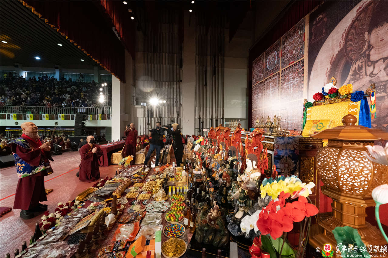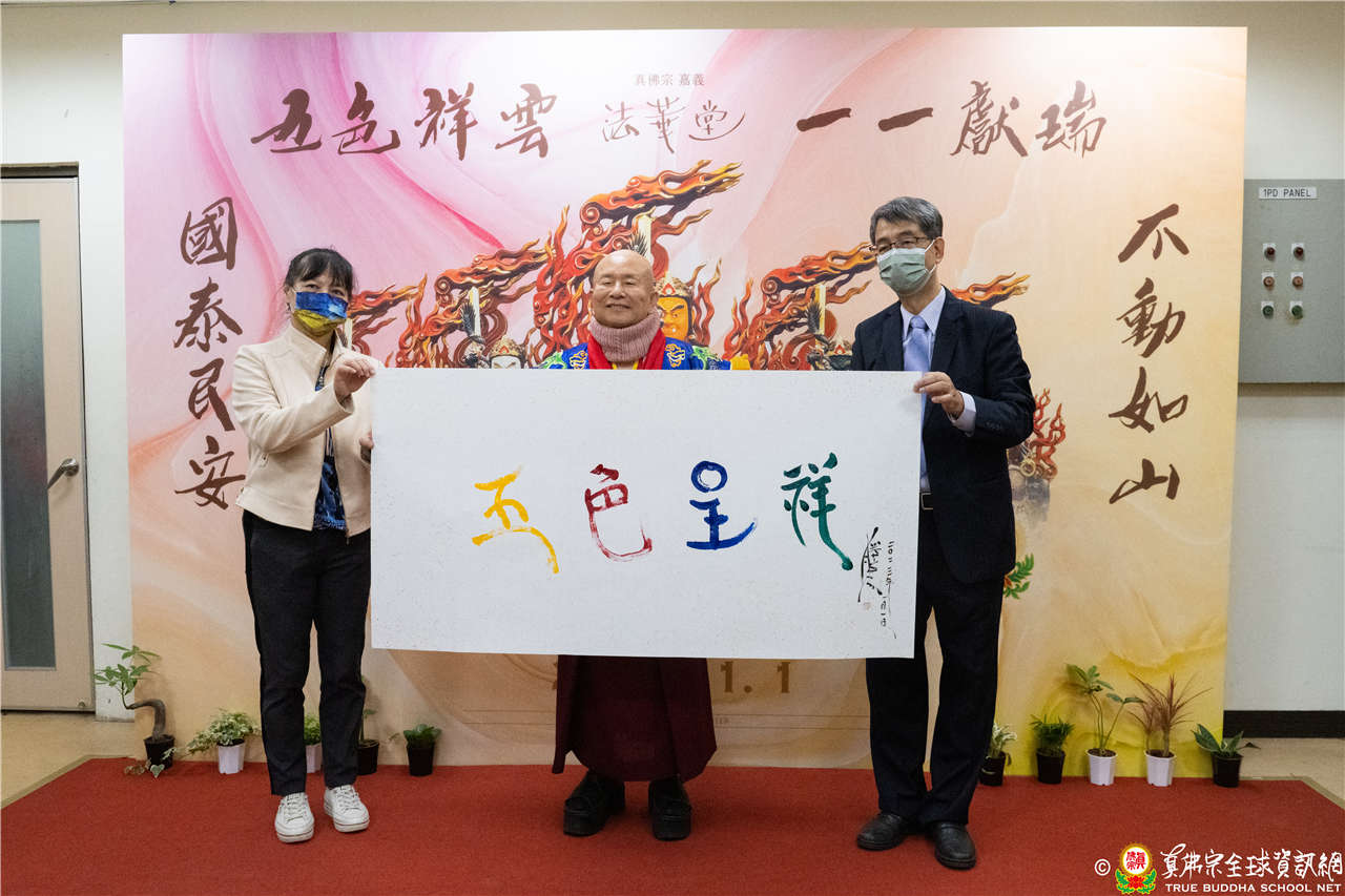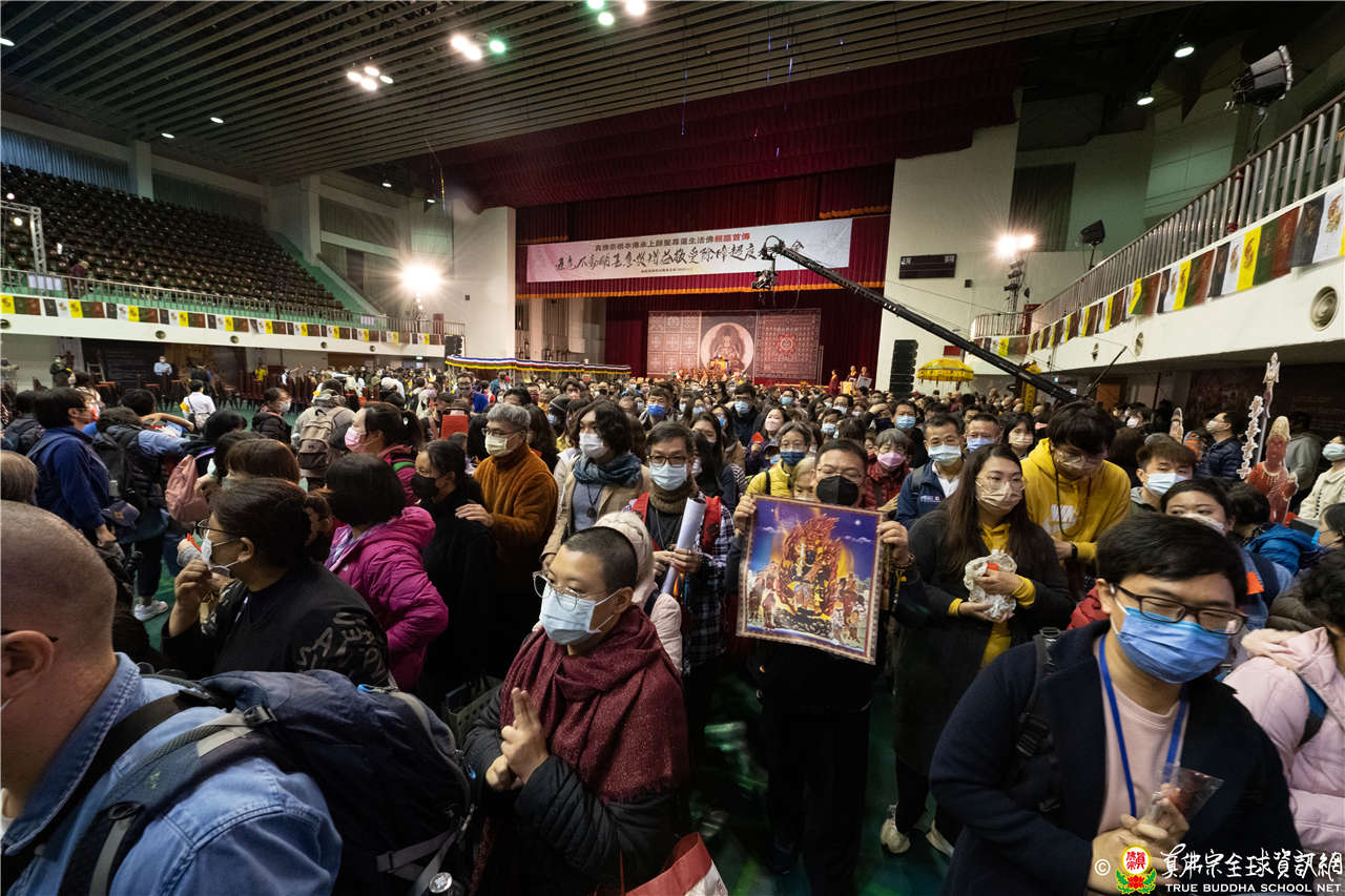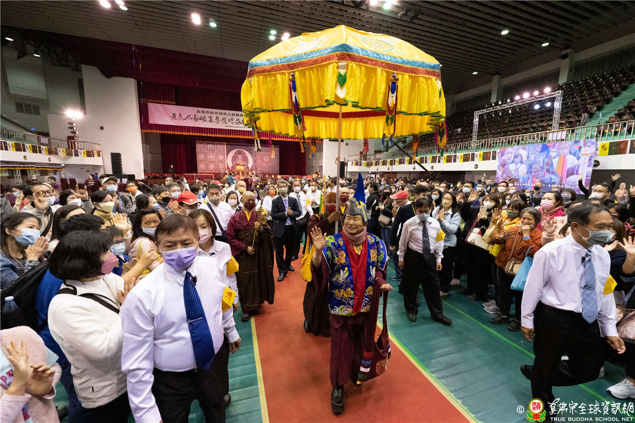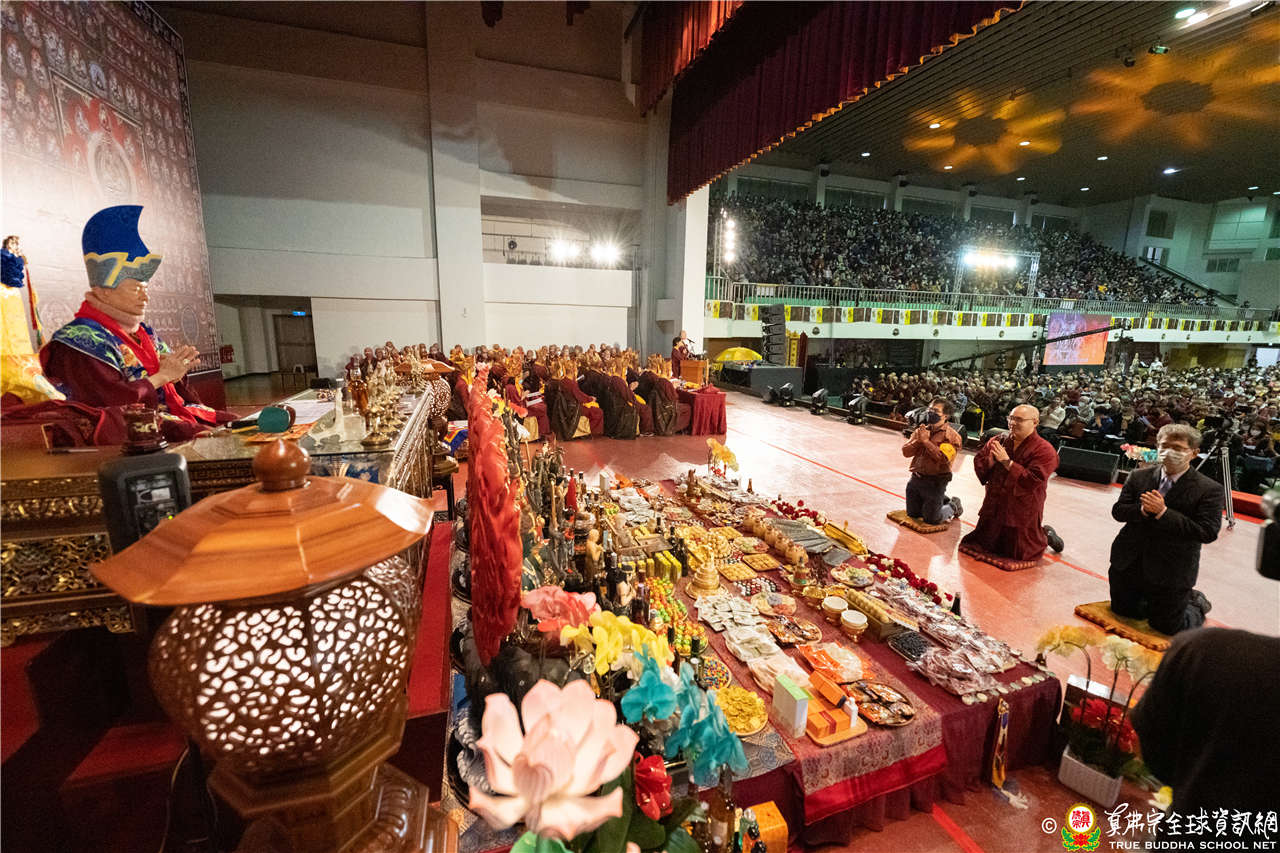 2023年元旦,人人歡喜迎接新一年的來臨。在這人人普慶的一天,台灣嘉義市真佛宗法華堂恭請蓮生法王到嘉義市立港坪運動中心體育館主持「五色不動明王息災增益敬愛除障超度大法會」,首傳「五色不動明王不共大法」。法會現場莊嚴殊勝,台上除了有巨幅的大日如來唐卡,更有金剛界曼荼羅及胎藏界曼荼法相圖。原來「不動明王」是八大明王首座,也是金胎兩部部主「大日如來」的變化身及教令輪。下午兩點,法會開始,大會迎師組恭迎蓮生法王入道場。