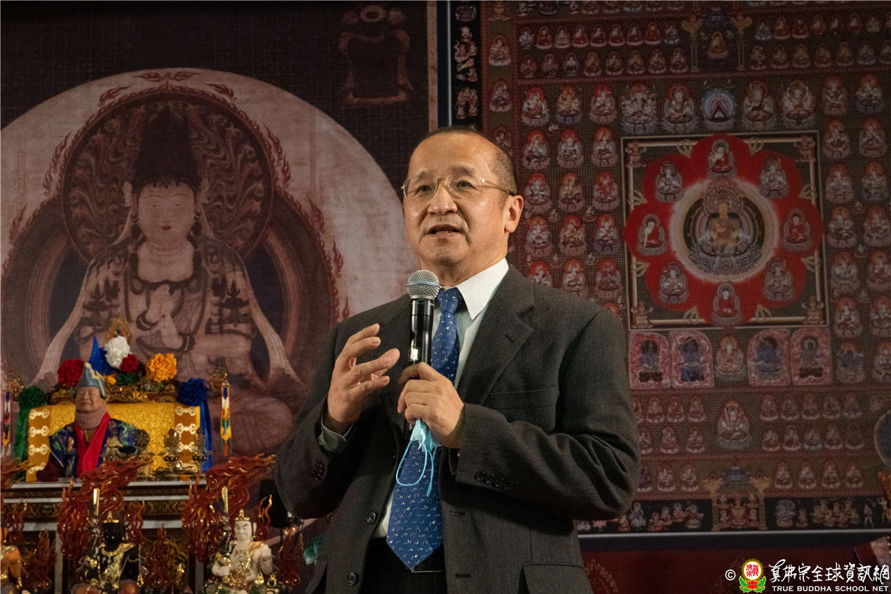 接著,法王提到自己小時候很難養,於是父親帶自己到嘉義城隍廟收為義子。因此,法王便認嘉義城隍廟的城隍爺為義父。此次在嘉義舉辦法會,內心也感波濤洶湧。法王告訴眾人其祖父有一個為善不為人知的功德:當年祖父經營米行時有許多貧苦人家,因沒錢買米只能賒賬或寫借條。祖父在每年新年時,會將賒賬收據全部集合起來一起燒毀,從不向他們追討。這是母親在米行擔任會計時,親眼所見。後來,祖父到了「天河勝景處」的「紫霞宮」擔任「掌燈使者」。